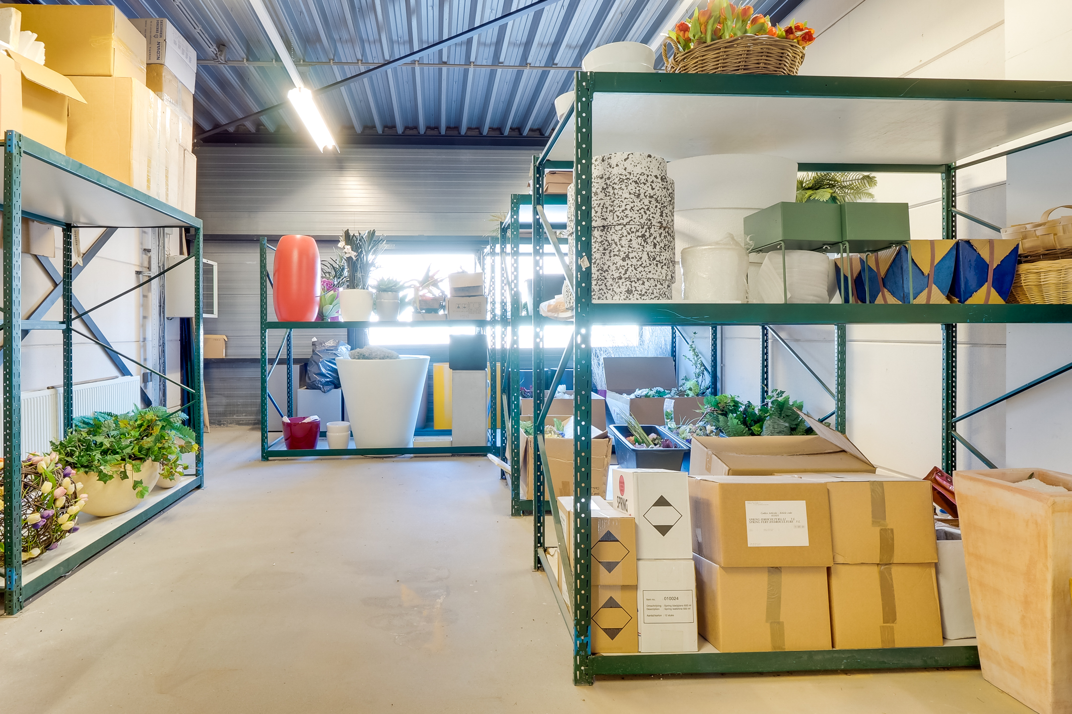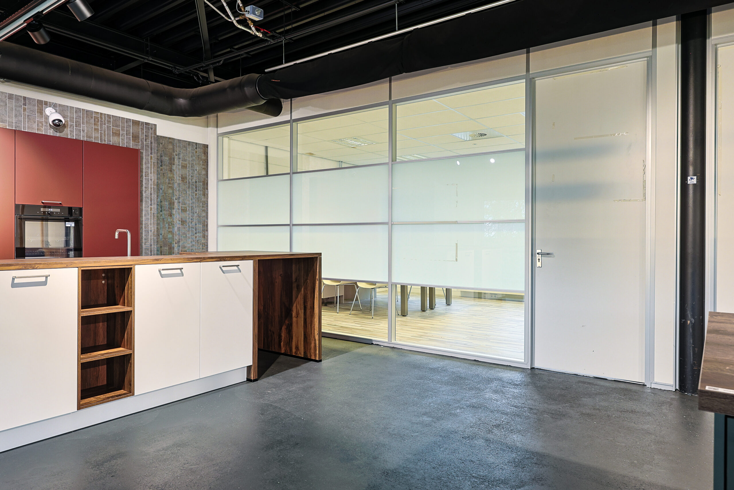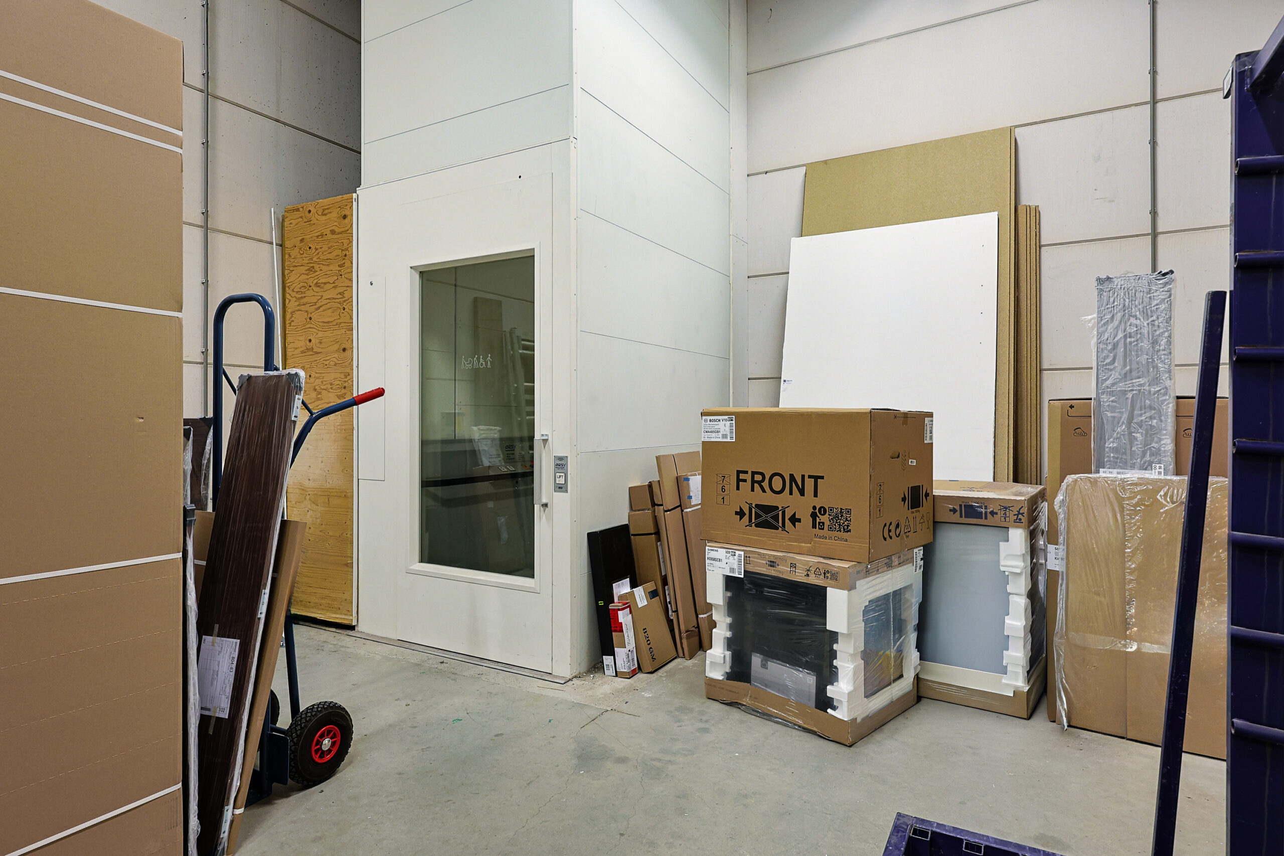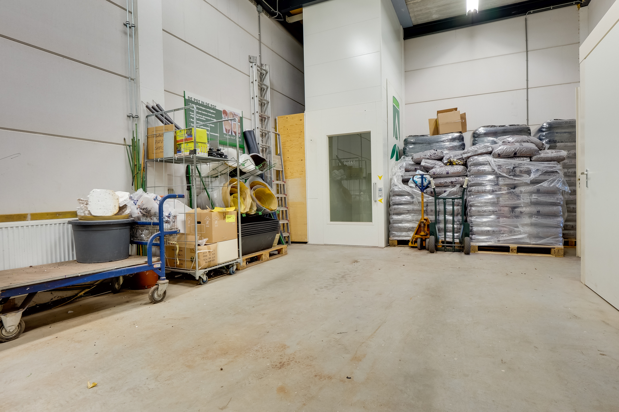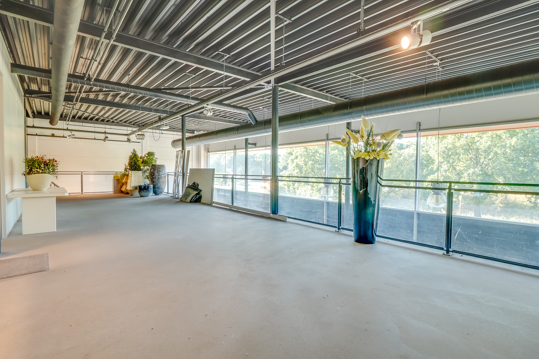 De voorzijde bestaat uit een ruime showroom-/bedrijfsruimte met een zwevende tussenvloer met showroom en kantoor.