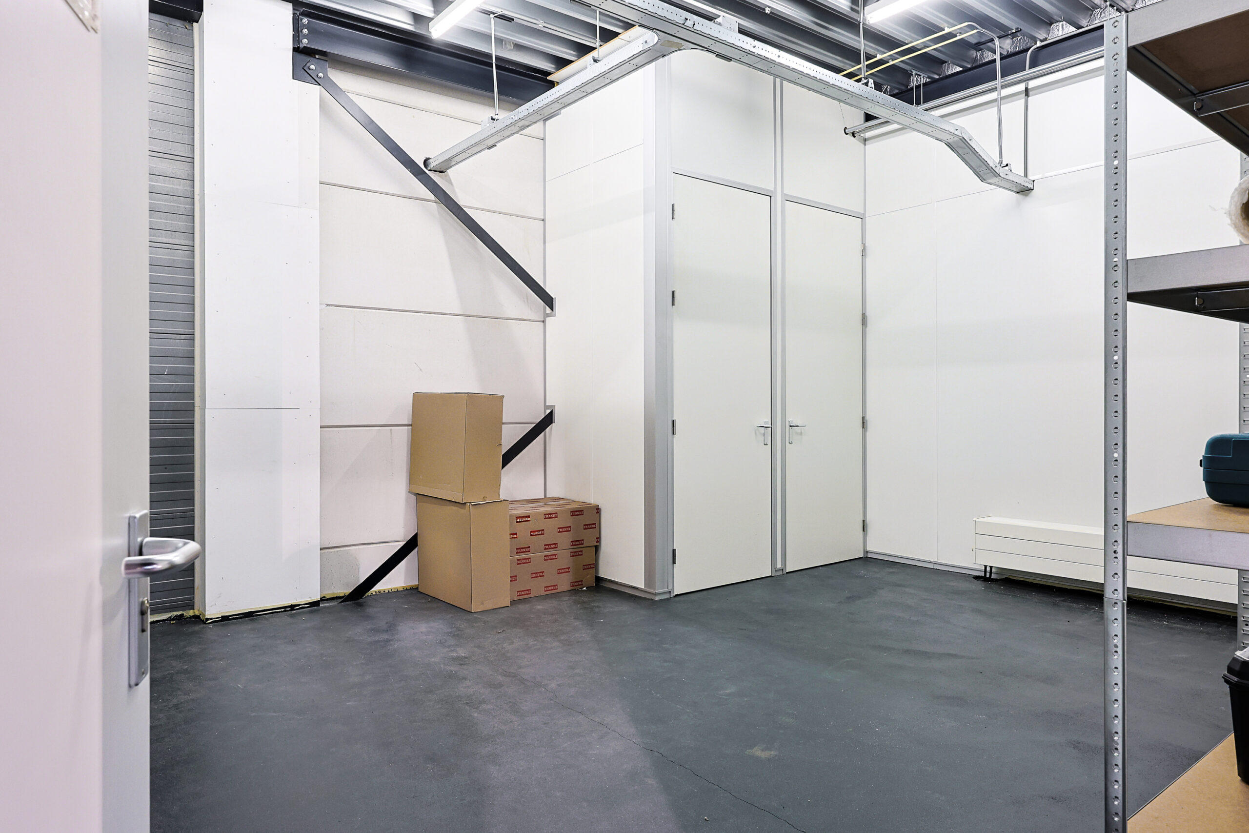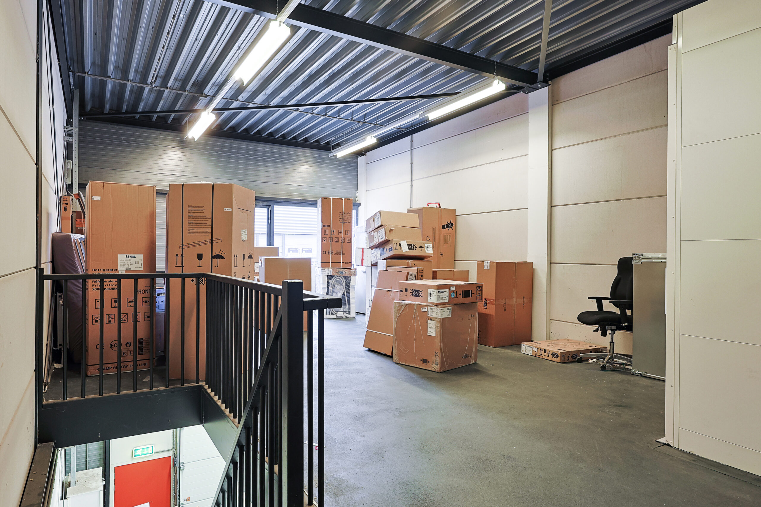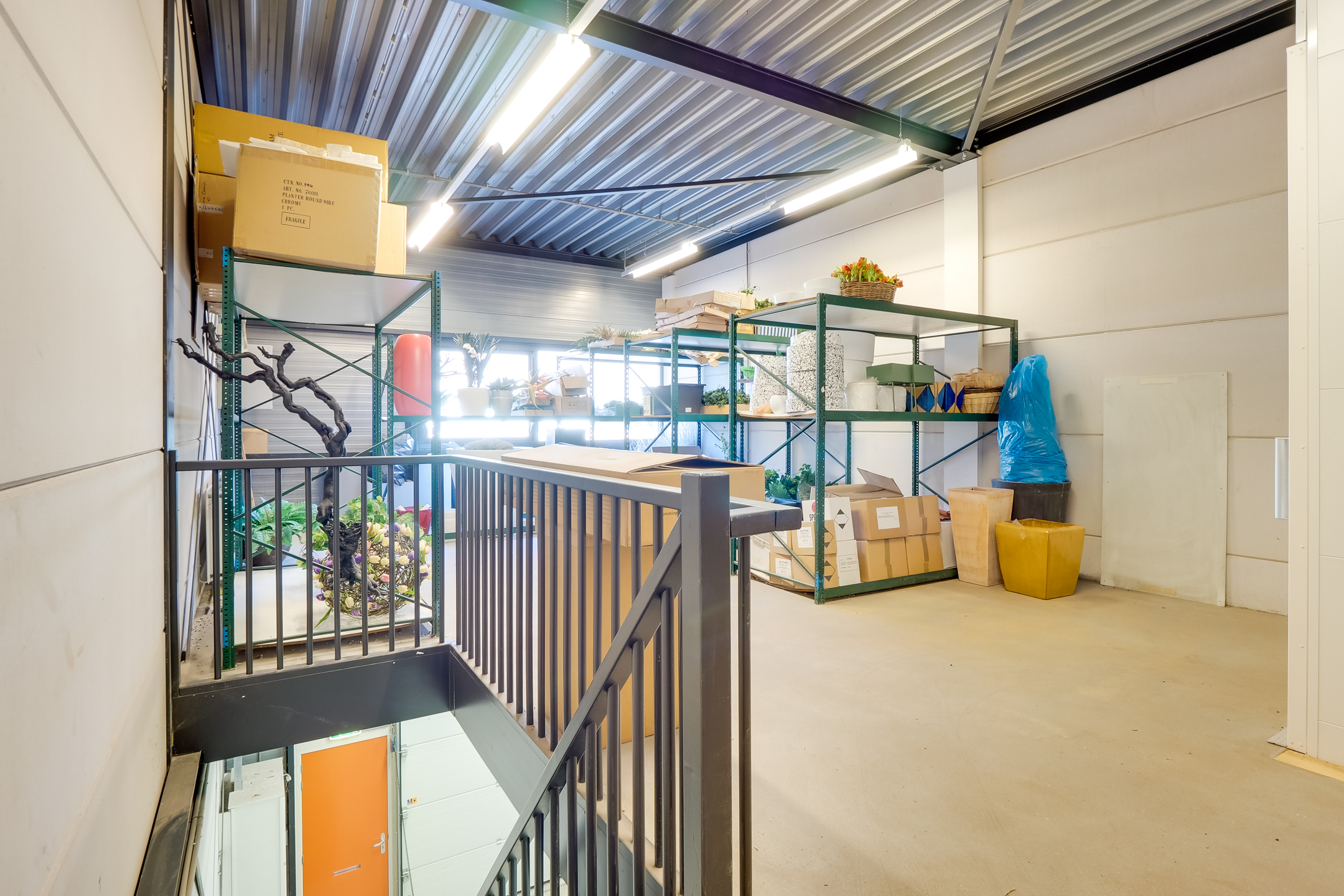 Aan de achterzijde bevindt zich een twee laags kleinere bedrijfs-/opslag unit welke intern is verbonden aan de showroom op zowel de begane grond als verdieping. Grote raampartijen van vloer tot plafond aan de voorzijde zorgen voor veel lichtval.