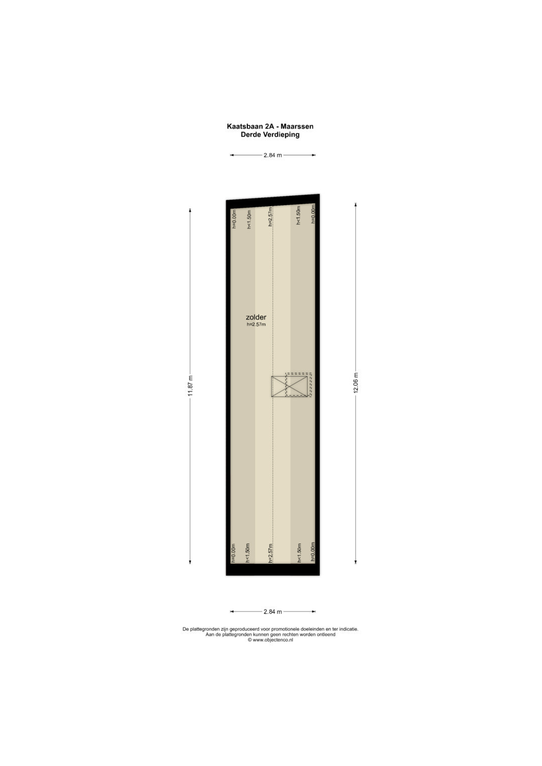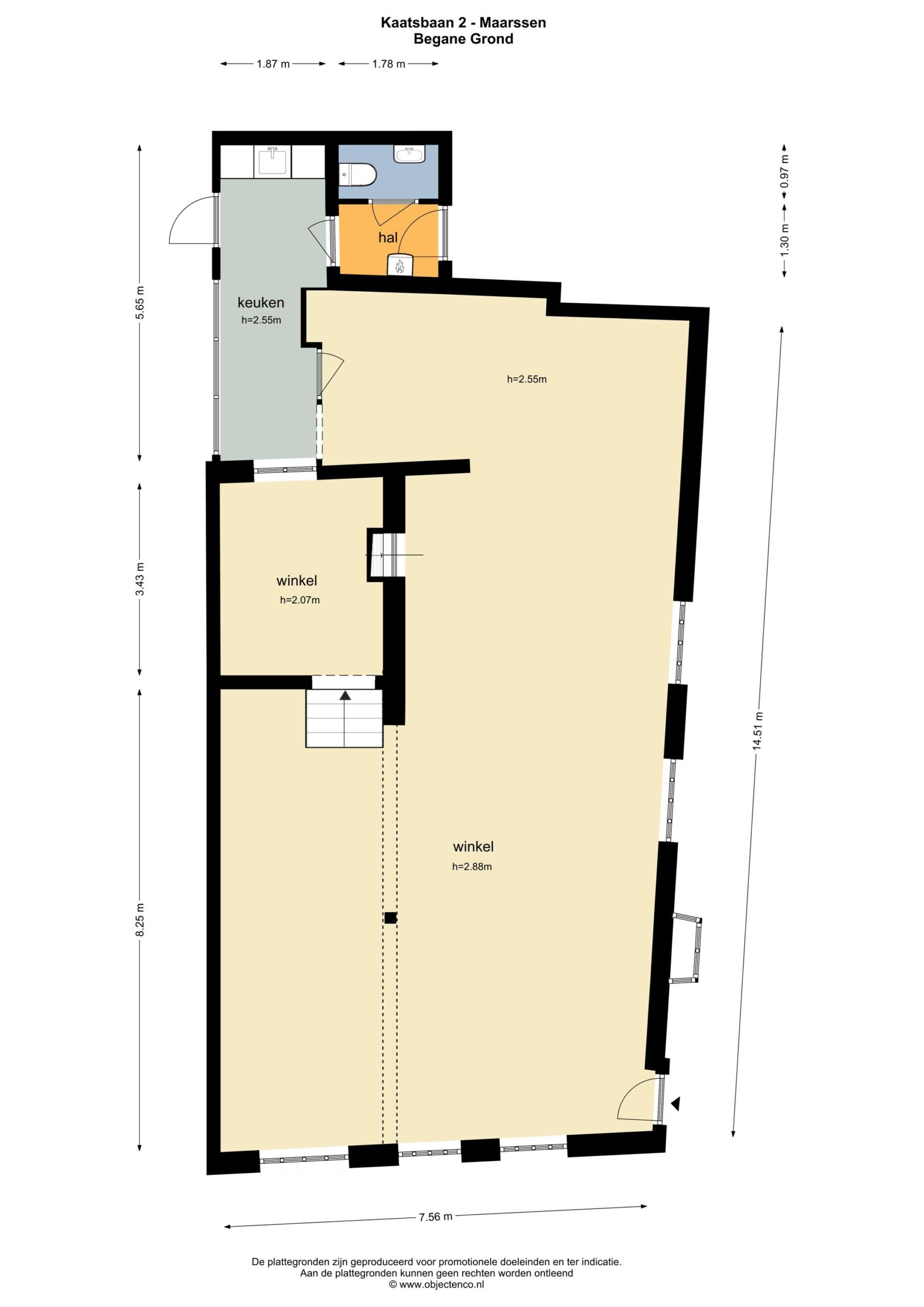 De frontbreedte van de winkelruimte aan de Kaatsbaan is circa 14 meter, en langs de Herengracht circa 7 meter.