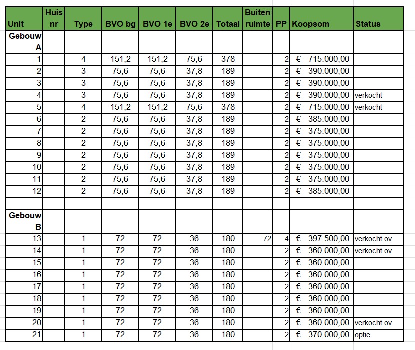 Voor een actueel overzicht van beschikbare units verwijzen wij u naar de foto's waarin het overzicht is opgenomen.