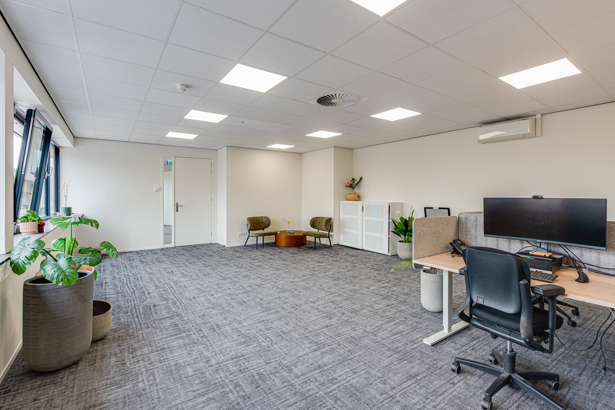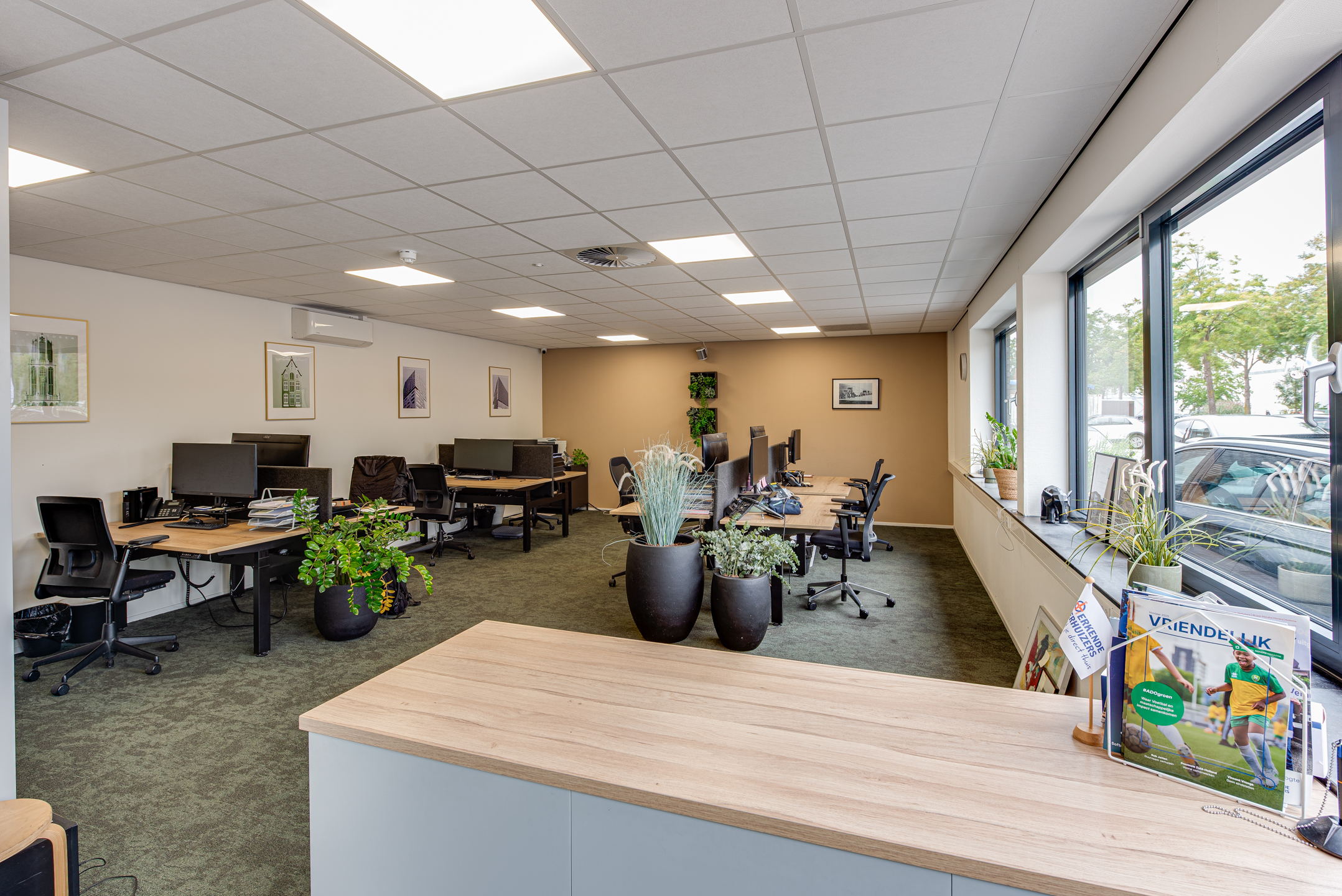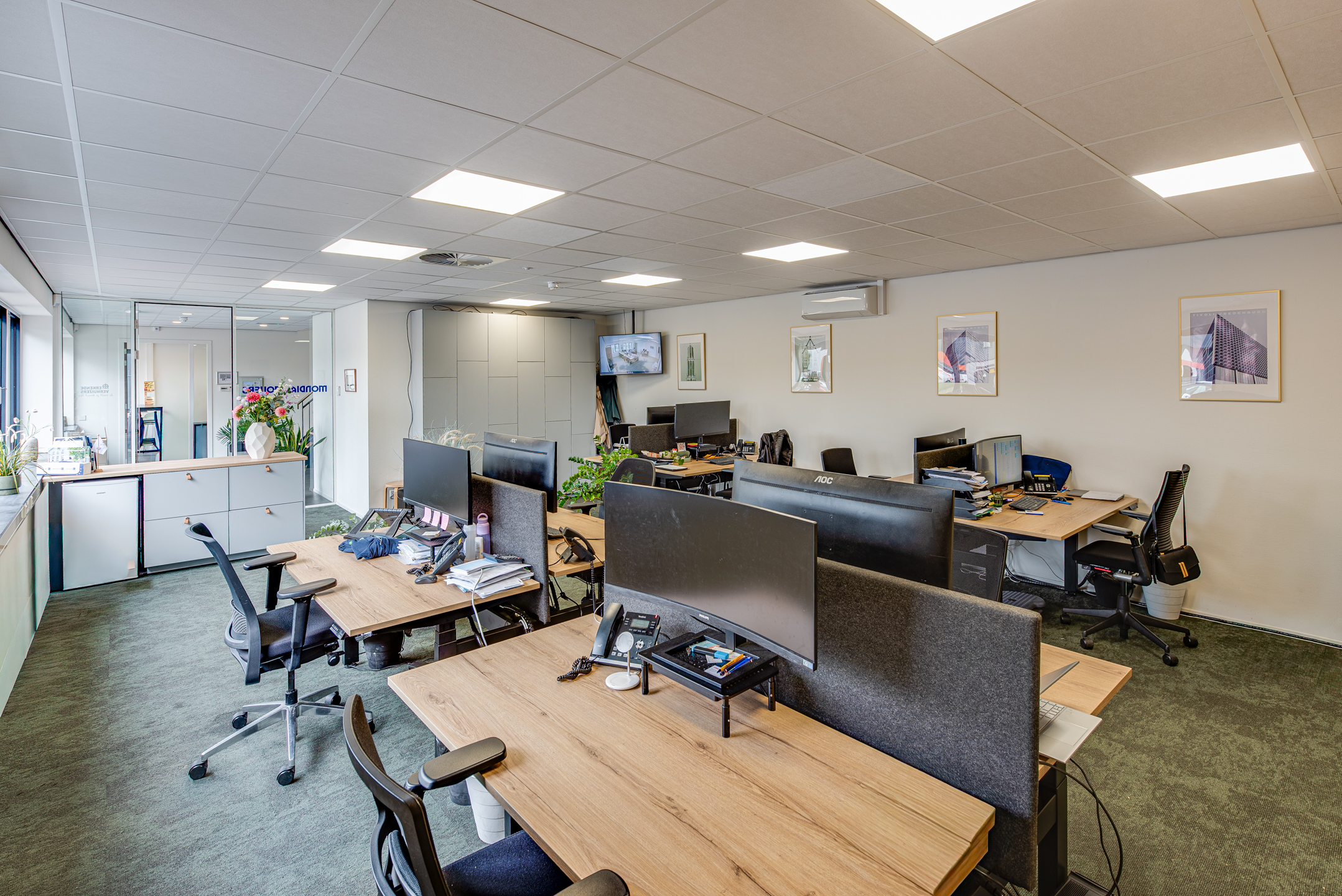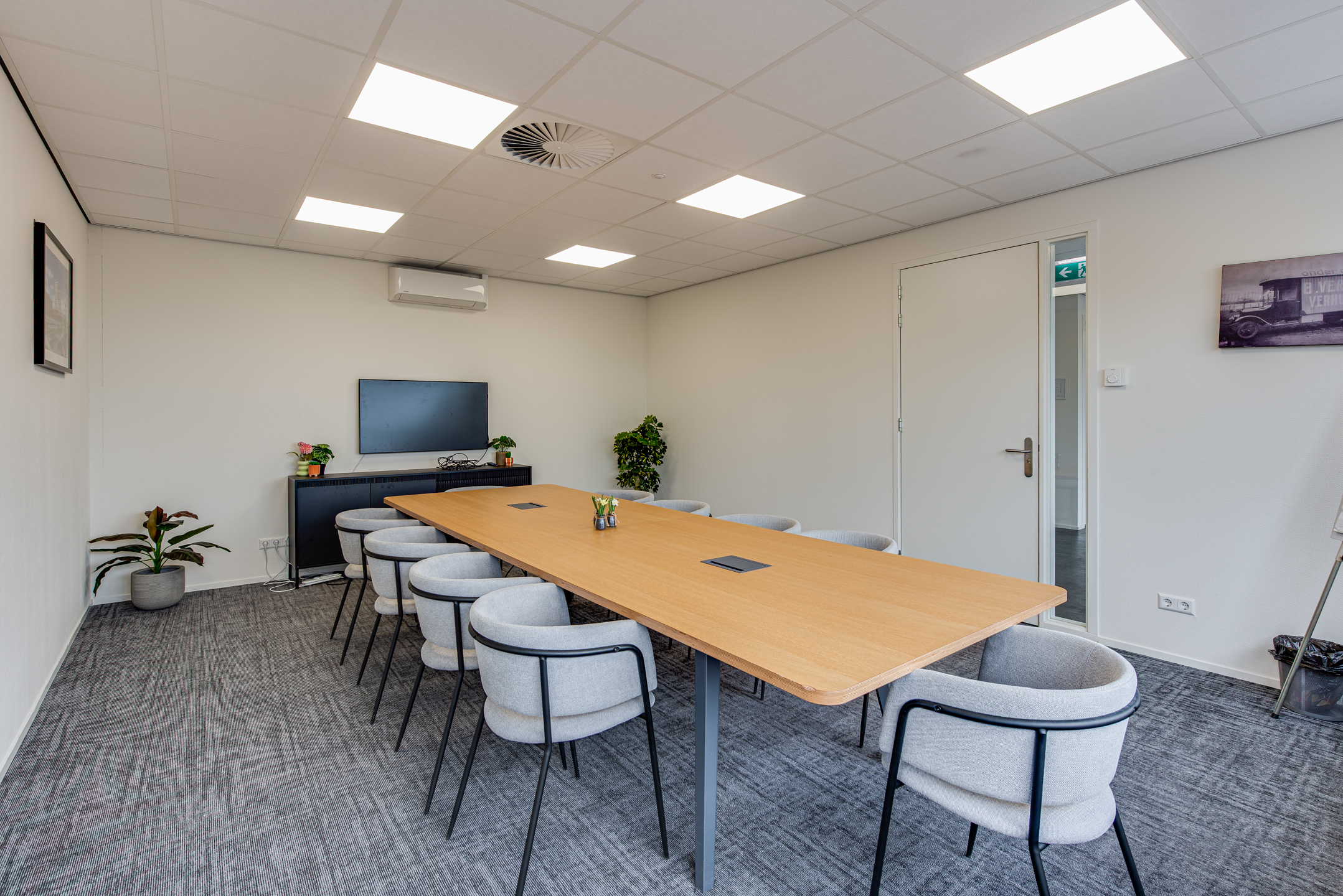 Een representatief tweelaags kantoor aan de voorzijde, met daarachter een ruime bedrijfshal met een vrije hoogte van circa 8,76 meter en een hoge vloerbelasting van circa 3.500 kg/m². De hal is voorzien van 2 elektrische overheaddeuren (1 aan de voorzijde en 1 aan de achterzijde welke uitzonderlijk breed is: circa 8 meter), ideaal voor efficiënt laden en lossen.