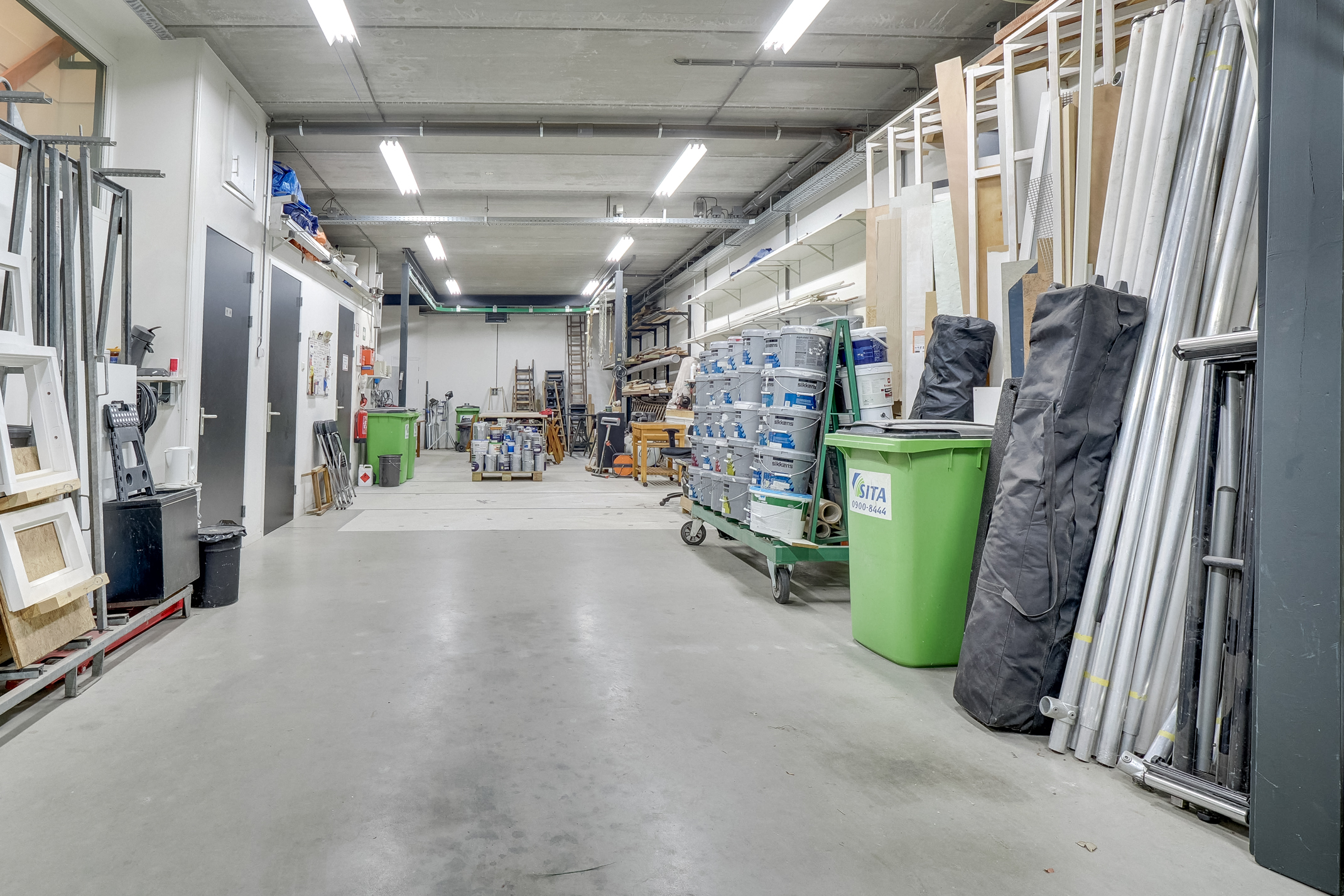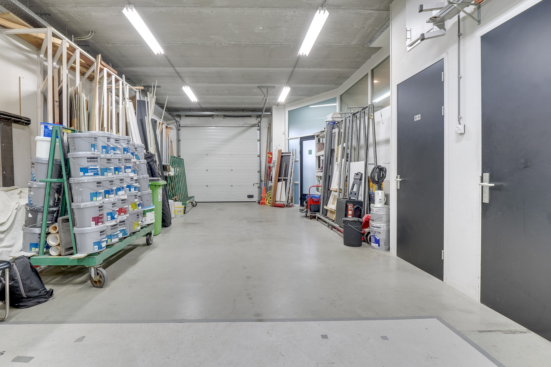 De turn-key bedrijfsunit kenmerkt zich door een zeer compleet en hoogwaardig afwerkingsniveau. De bedrijfs-/opslagruimte op de begane grond omvat circa 155 m² bvo en beschikt over een vrije hoogte van circa 3,56 meter, een vloeistofkerende betonvloer met een vloerbelasting van 1.000 kg/m² en een overheaddeur. Ten behoeve van een spuiterij zijn een afzuigwand en monorail aanwezig.