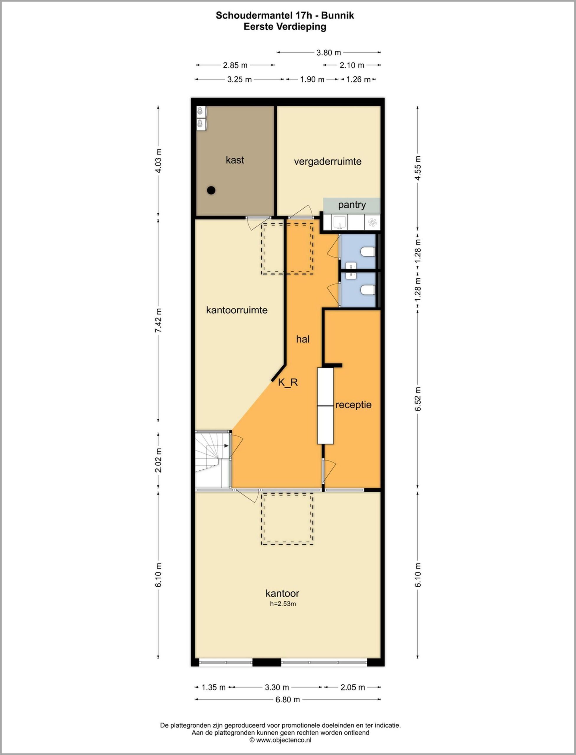 De kantoorverdieping van ca 155 m² is ingedeeld in meerdere ruimtes en beschikt over een ontvangstruimte met maatwerk receptiebalie, systeemplafonds met ledverlichting en airconditioning. Dankzij twee ruime lichtkoepels in het dak is er veel natuurlijke lichtinval. De kantine is uitgevoerd met een luxe keuken voorzien van onder andere Siemens inbouwapparatuur. Het geheel heeft een professionele en verzorgde uitstraling. Het buitenschilderwerk aan de voorzijde is in 2024 uitgevoerd.