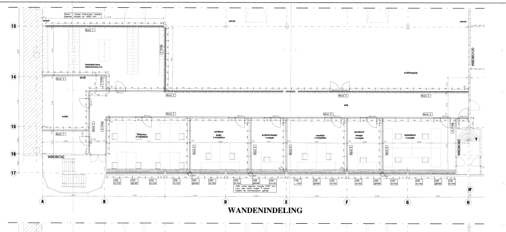 - huidige scheidingswanden en deuren t.b.v. de kantoren en kantine.