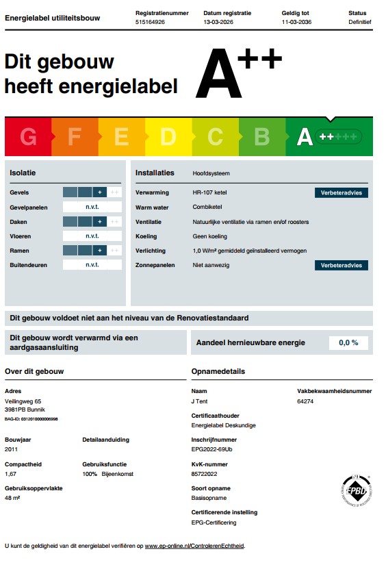 Het betreft hier een duurzame bedrijfsunit met label A++, geldig tot 11 maart 2036.