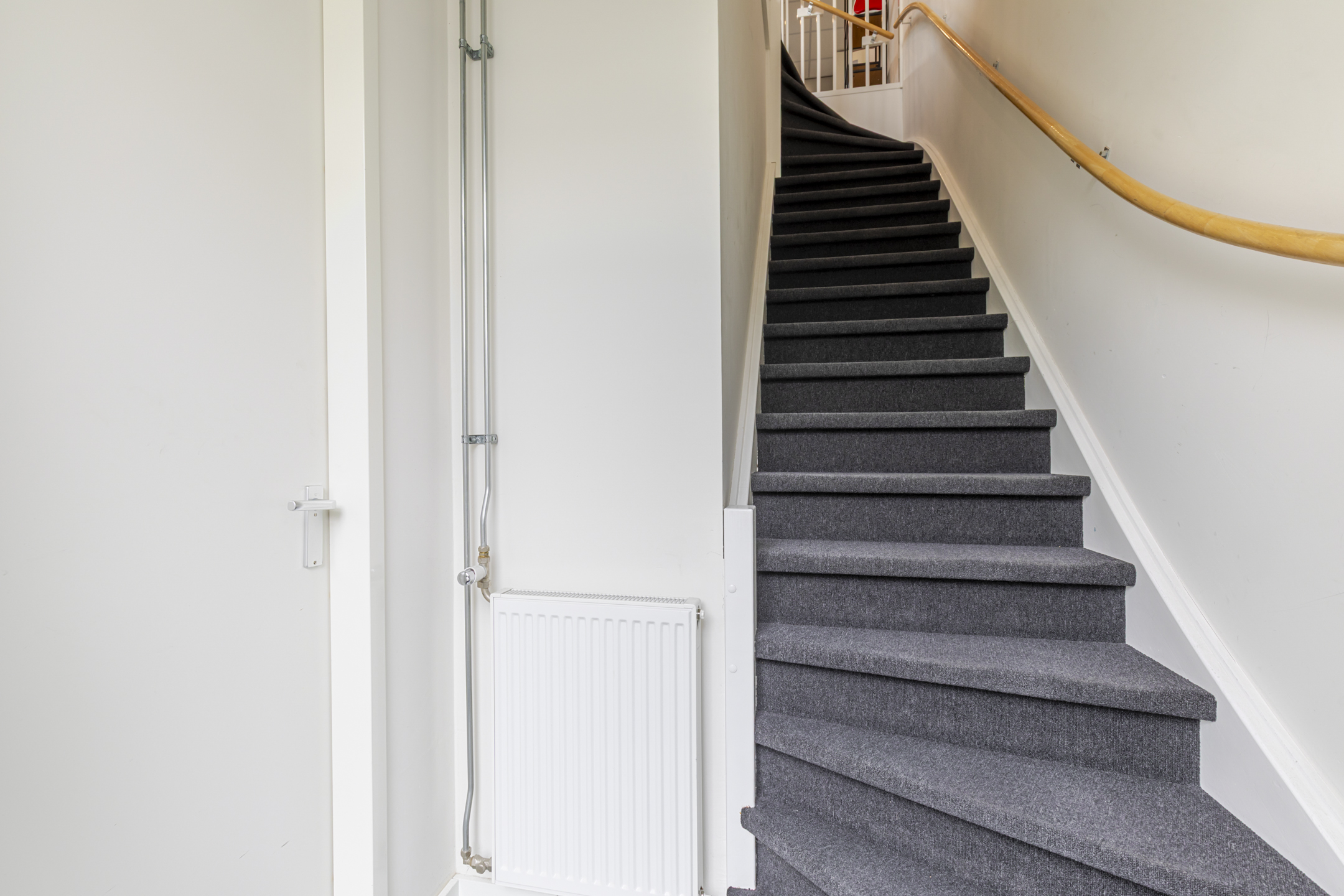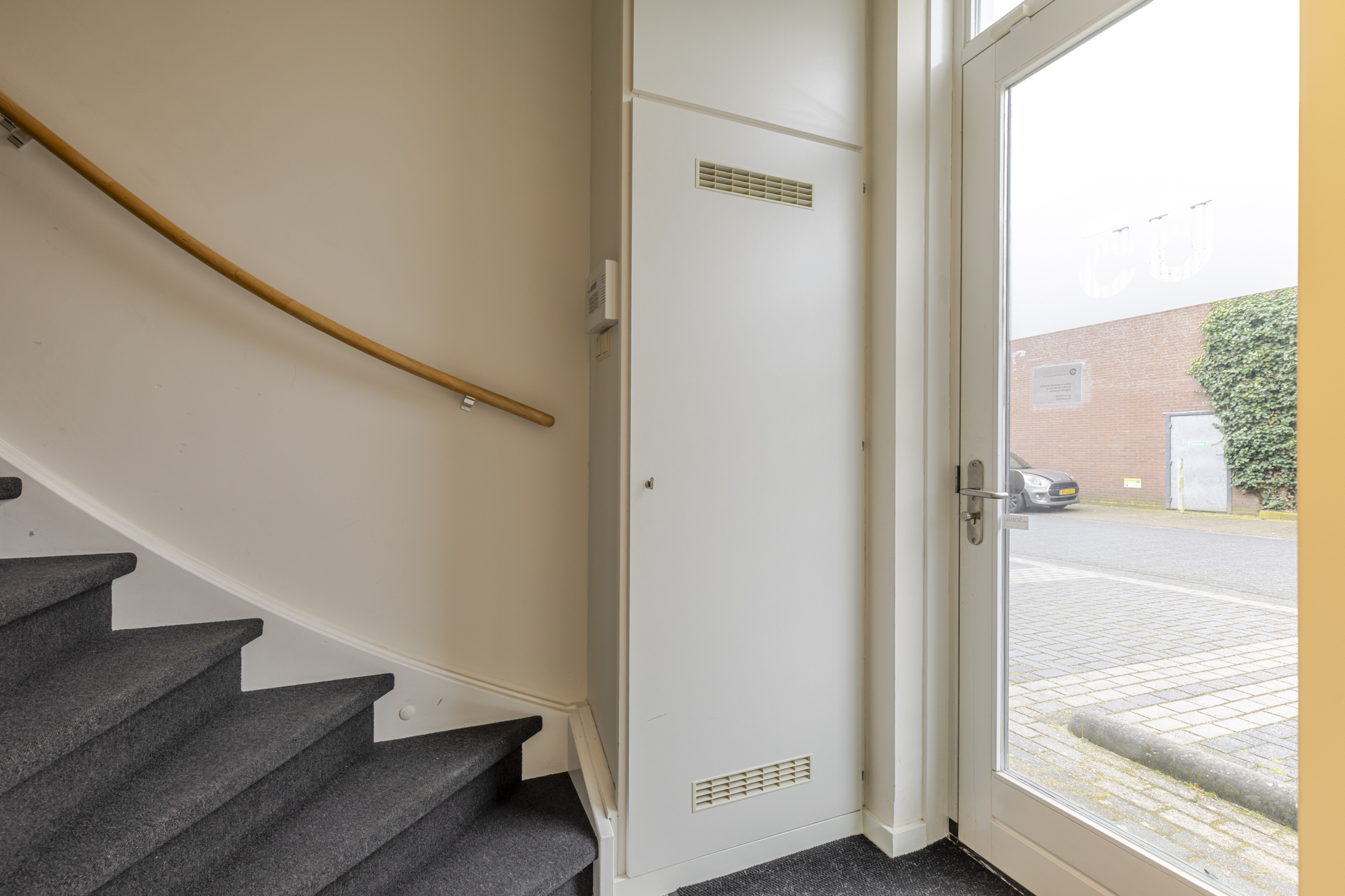 - entreeruimte met meterkast en hardhouten trap v.v. donkergrijze vloerbedekking naar verdieping