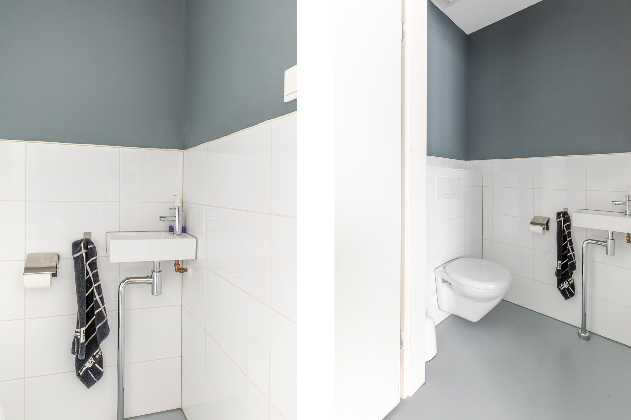 - half hoog betegelde toiletruimte v.v. vrij hangend toilet en fontein