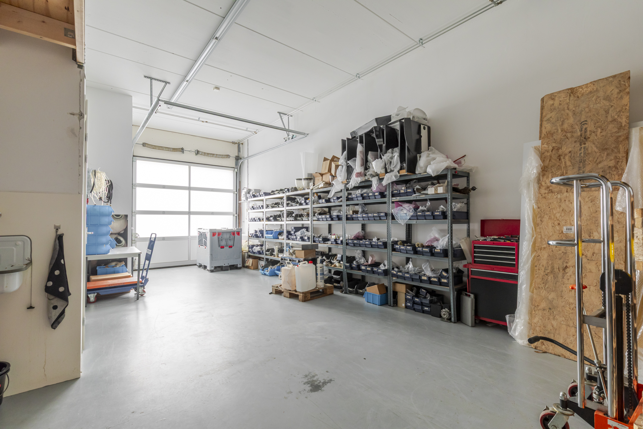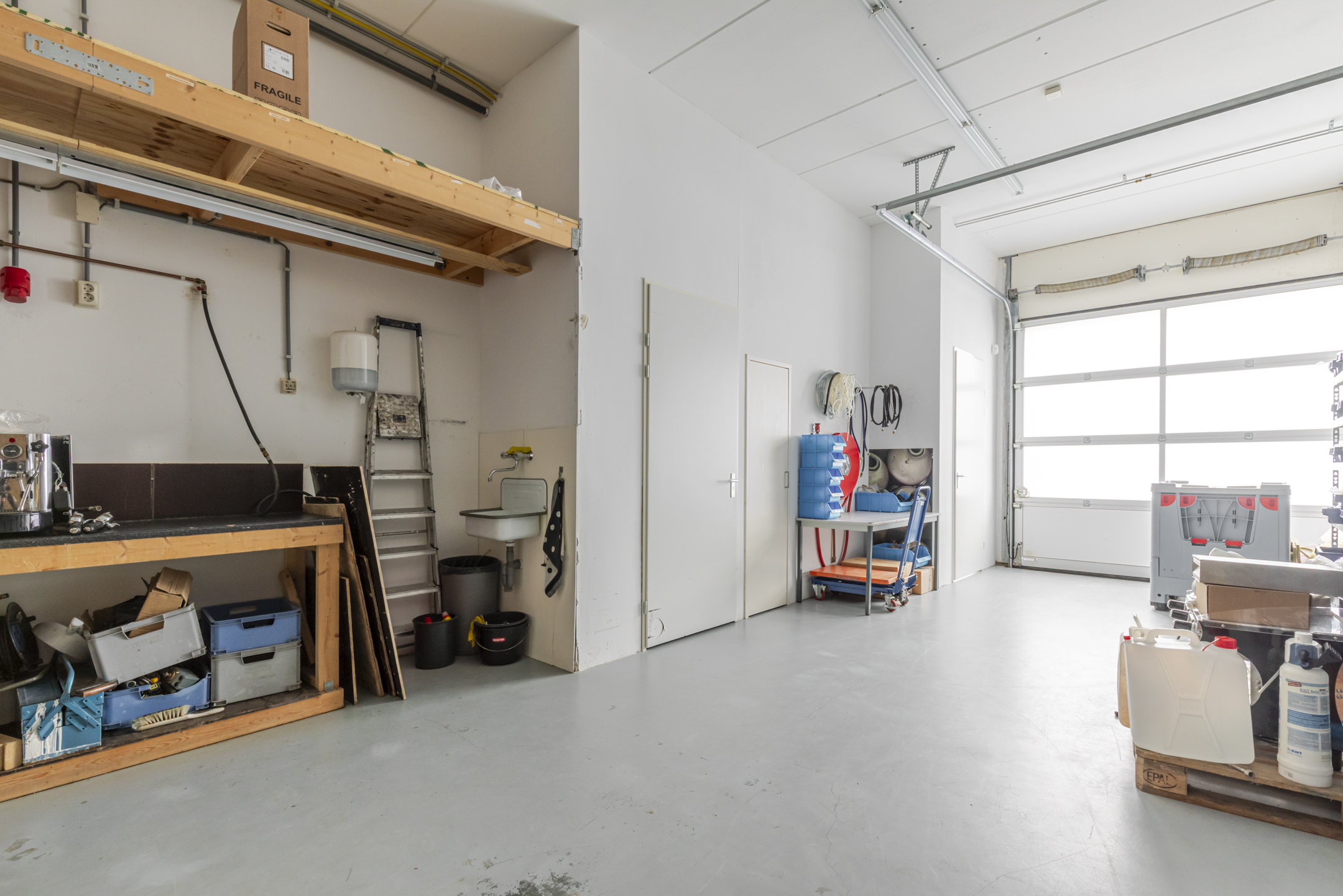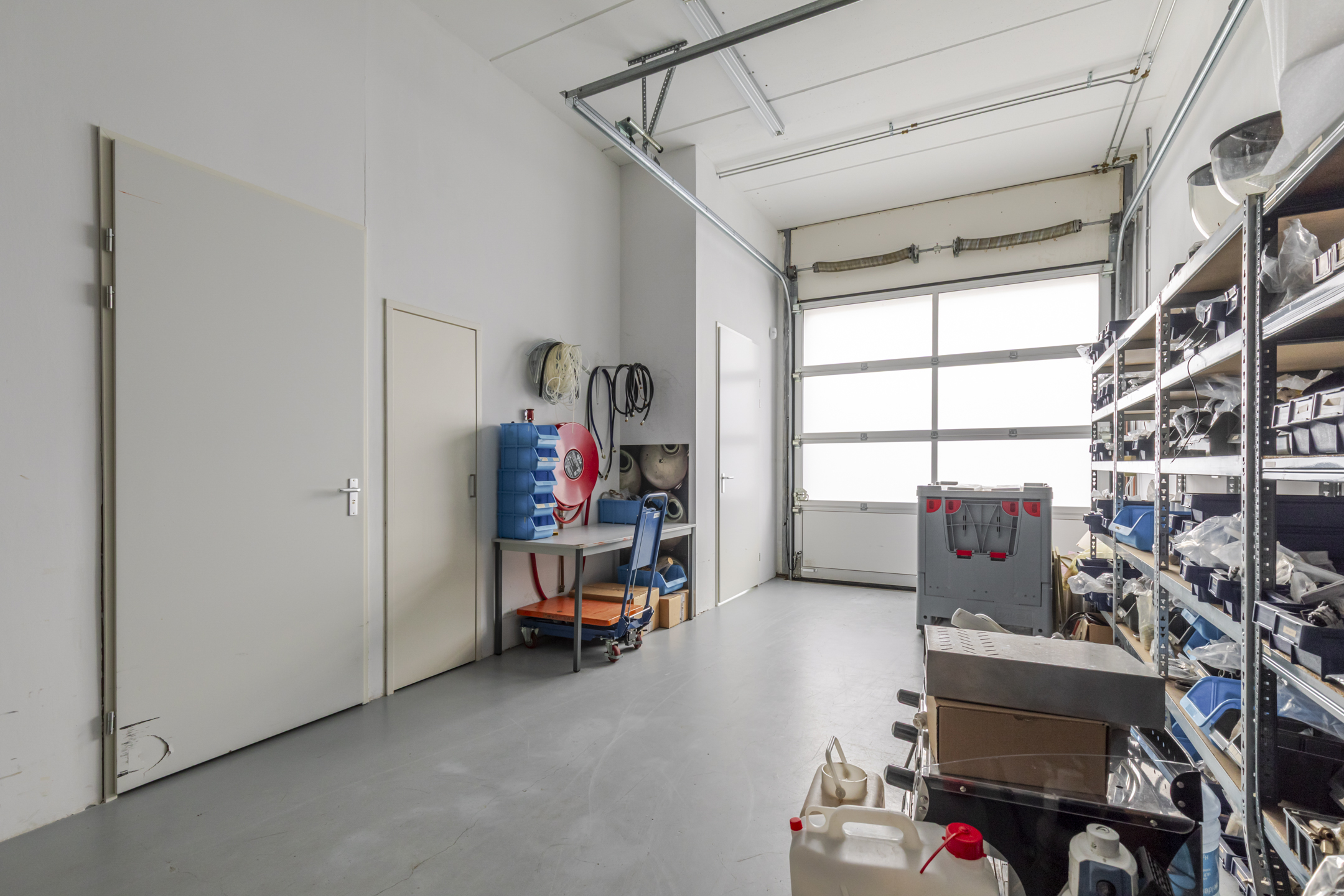 Entree met trapopgang en meterkast. Multifunctionele bedrijfsruimte geschikt voor magazijn, archief of opslag, met een vrije hoogte van circa 3,5 meter. De ruimte is voorzien van een monolithisch afgewerkte betonvloer en een geïsoleerde overheaddeur. Totale oppervlak begane grond ca. 54 m² bvo.