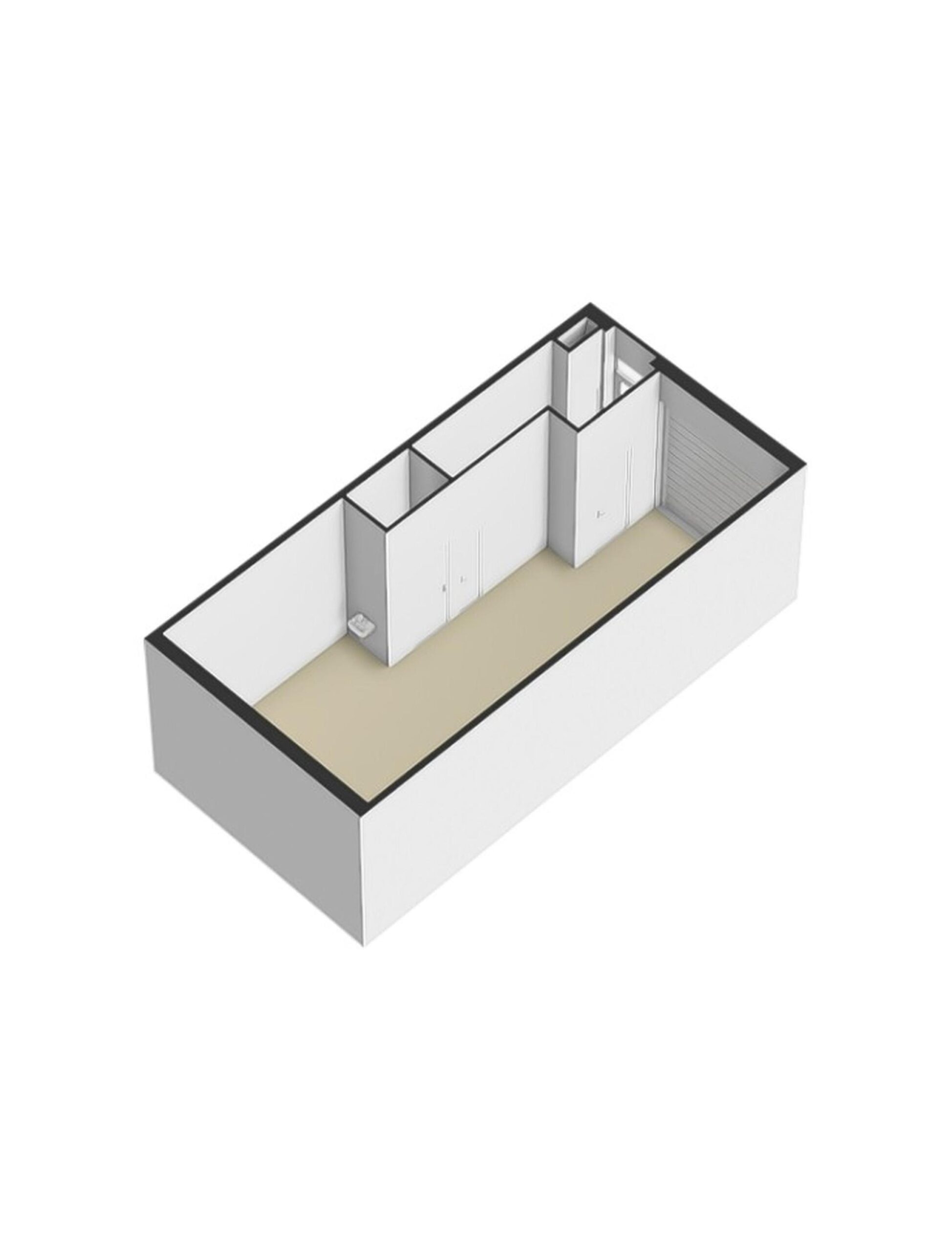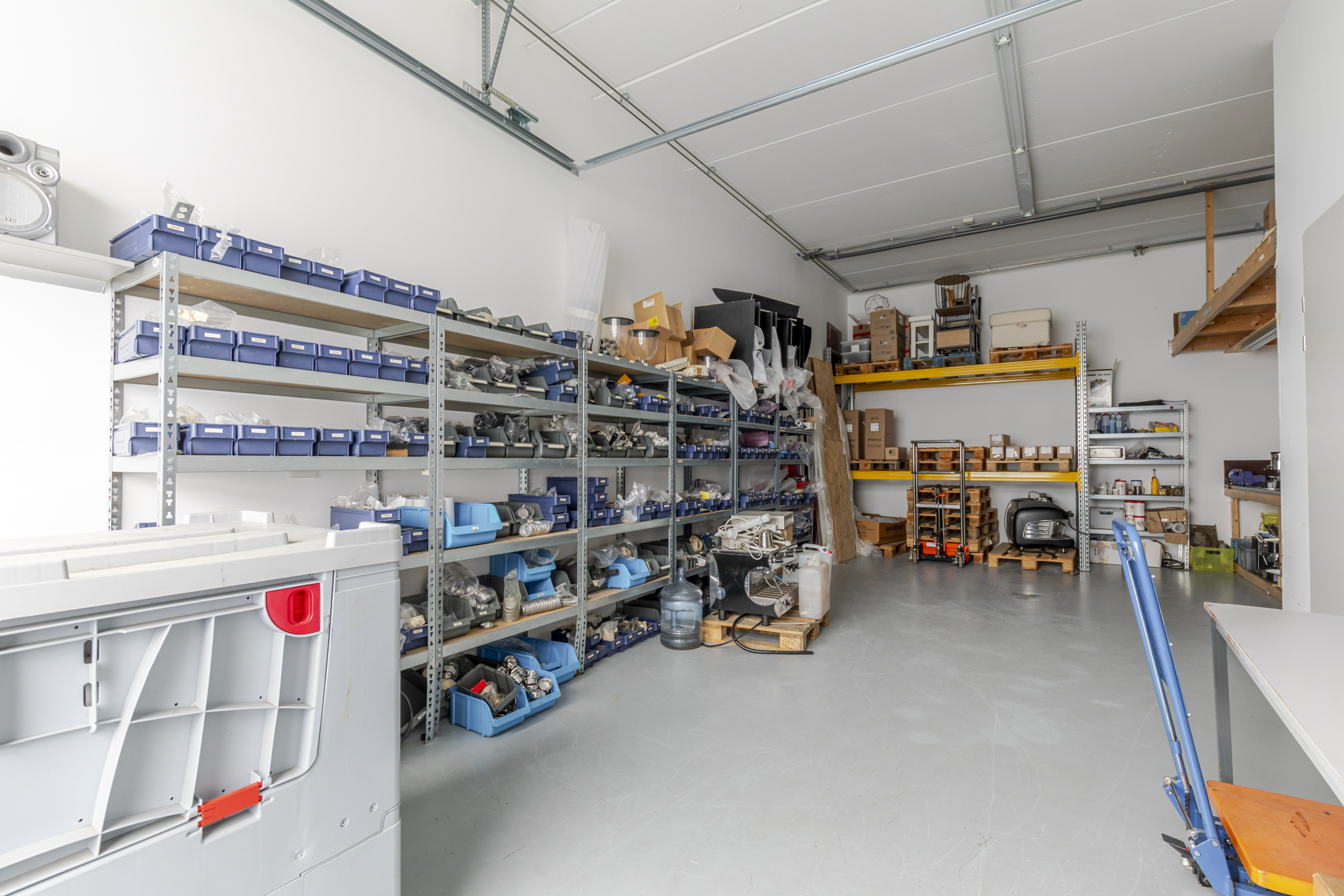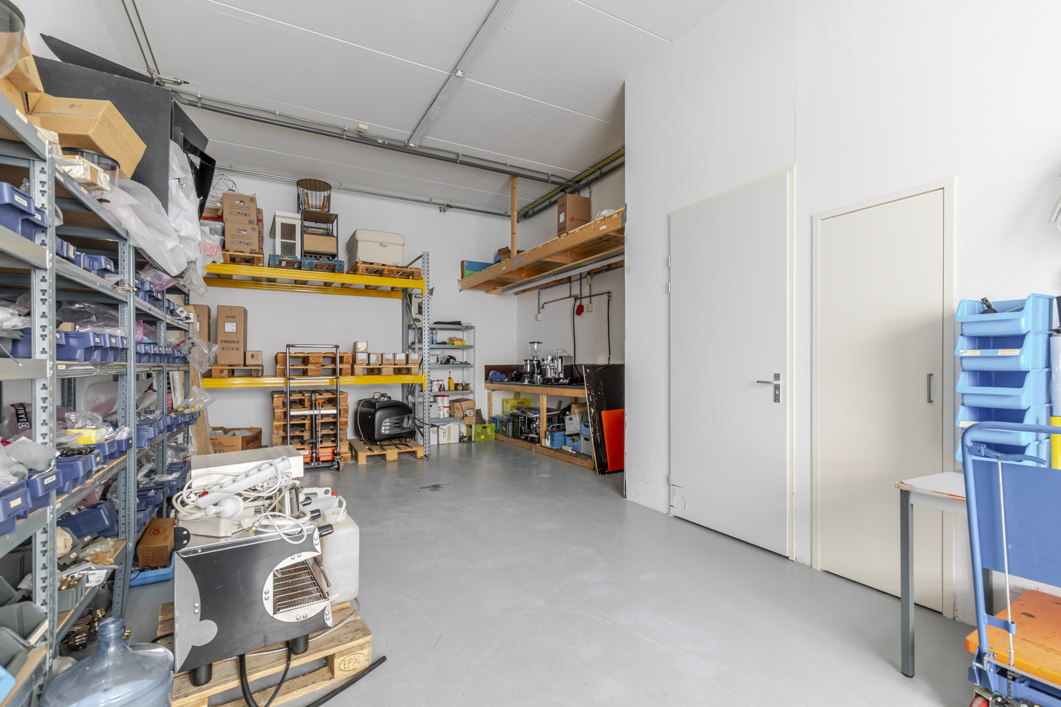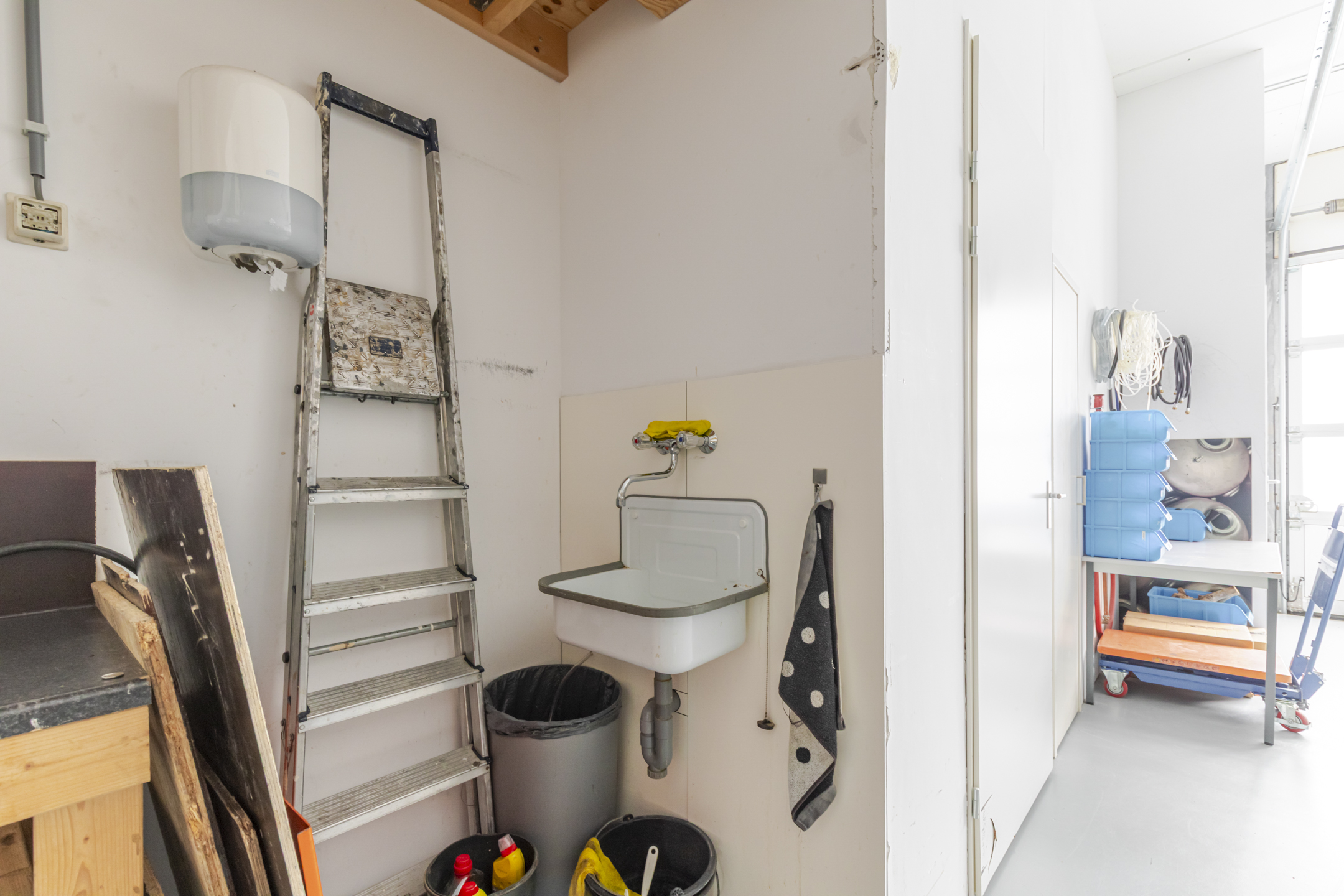 Entree met trapopgang en meterkast. Multifunctionele bedrijfsruimte geschikt voor magazijn, archief of opslag, met een vrije hoogte van circa 3,5 meter. De ruimte is voorzien van een monolithisch afgewerkte betonvloer en een geïsoleerde overheaddeur. Totale oppervlak begane grond ca. 54 m² bvo.