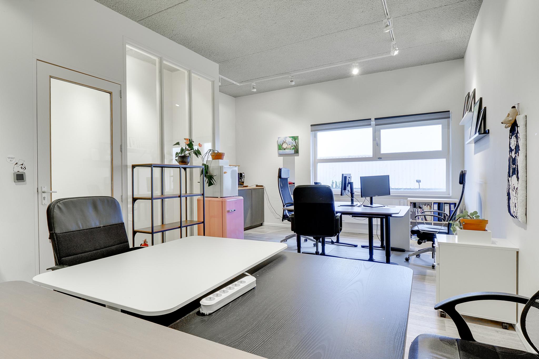 De geïsoleerde overheaddeur is voorzien van glassecties waardoor men ook op de begane grond prettig kan werken. De kantoorverdieping is voorzien van een nette vloerbedekking, een nette pantry, led-opbouw-verlichting en plafonds voorzien van geluidsabsorberend stucwerk.