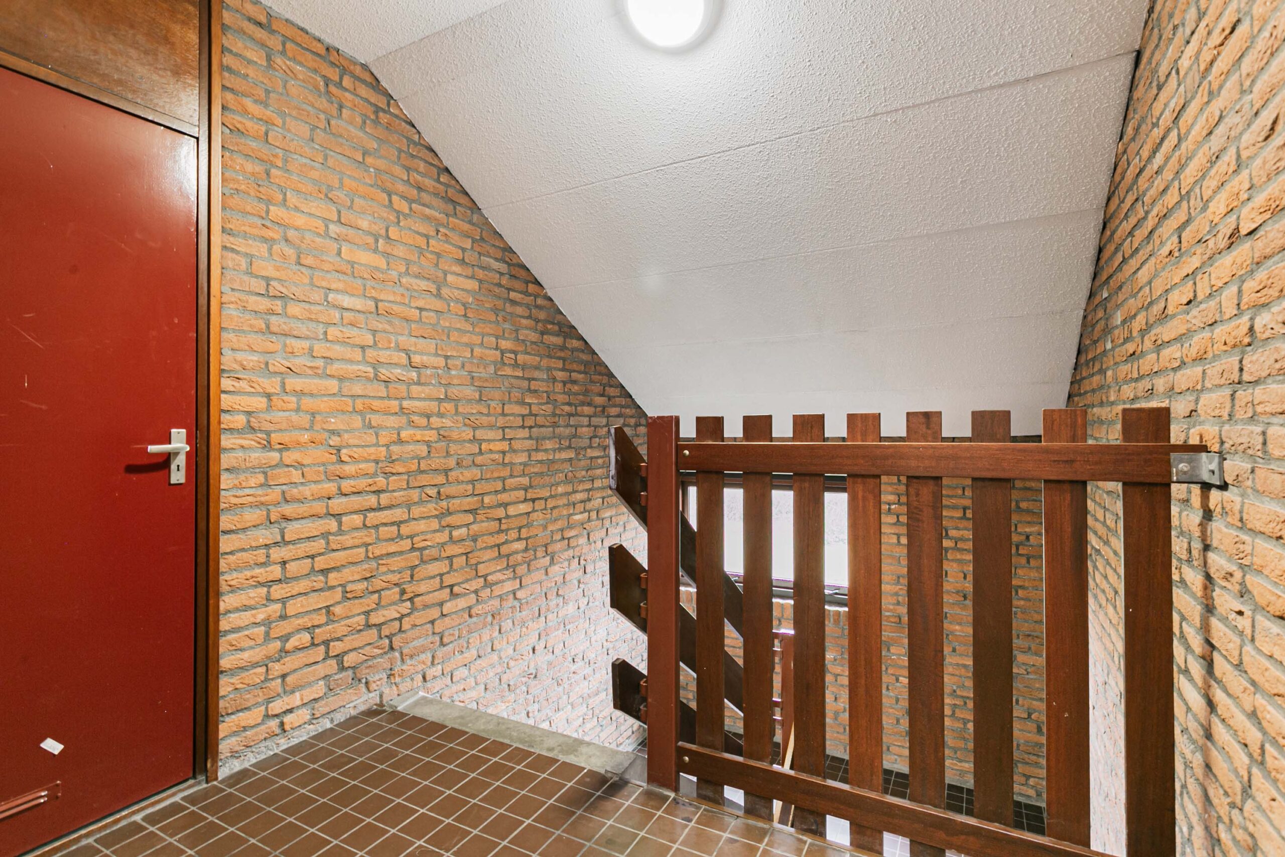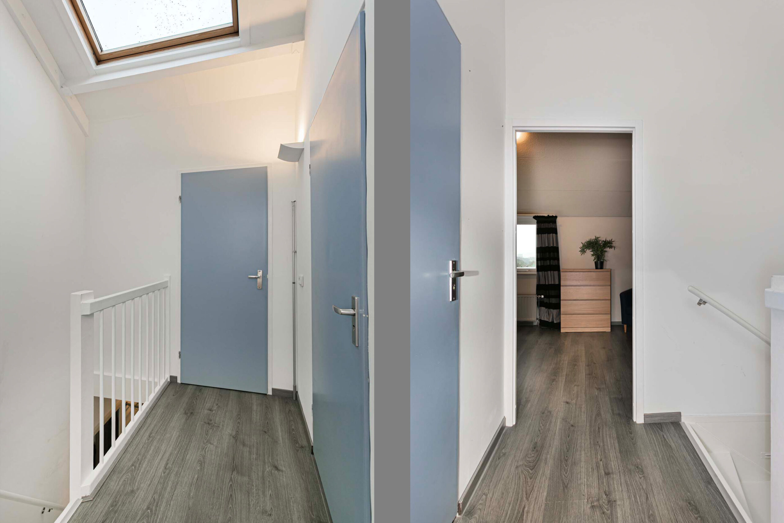 Via de vaste trap bereik je de overloop. Deze is lekker licht door het extra Veluxraam in het schuine dak. De gehele verdieping is afgewerkt met een fraaie laminaatvloer.