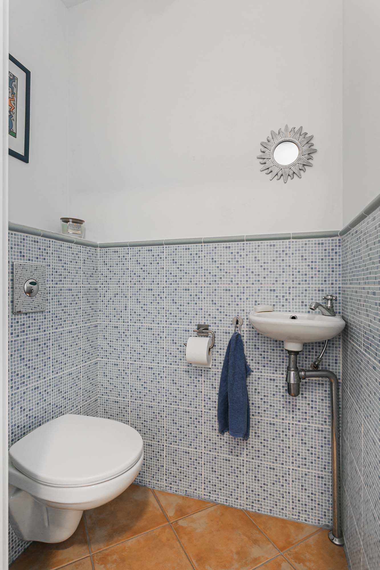 Je stapt binnen in een ruime hal met de meterkast, een modern toilet met fonteintje en de trap naar boven.