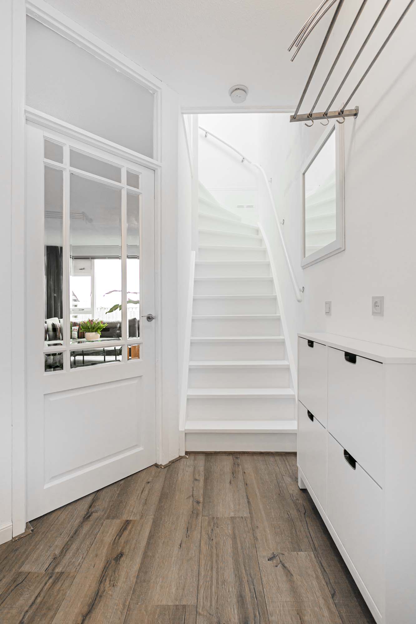 Op de begane grond bevinden zich de gezamenlijke entree, de trapopgang naar de woning en toegang tot de de privé berging: ideaal voor fietsen en extra ruimte voor opslag.