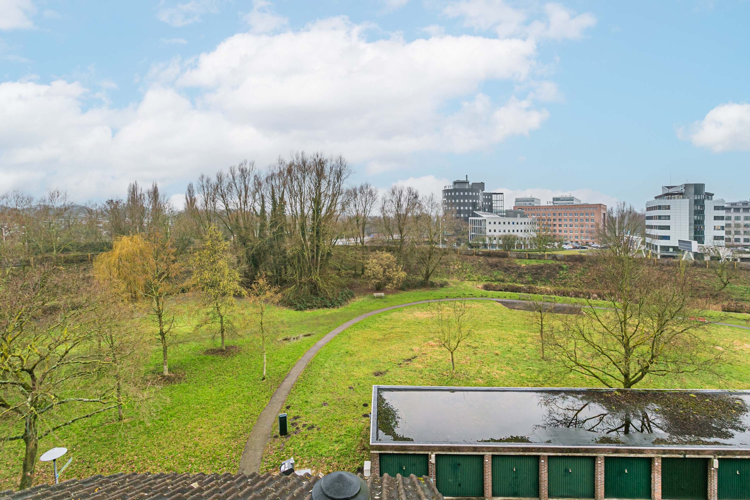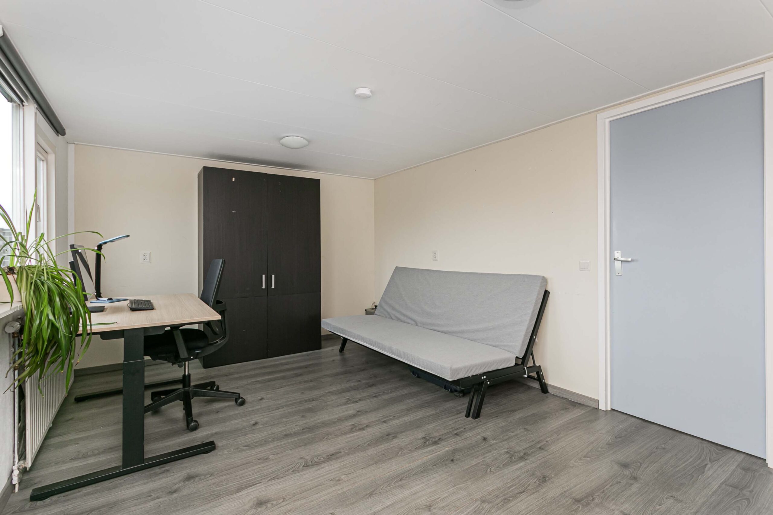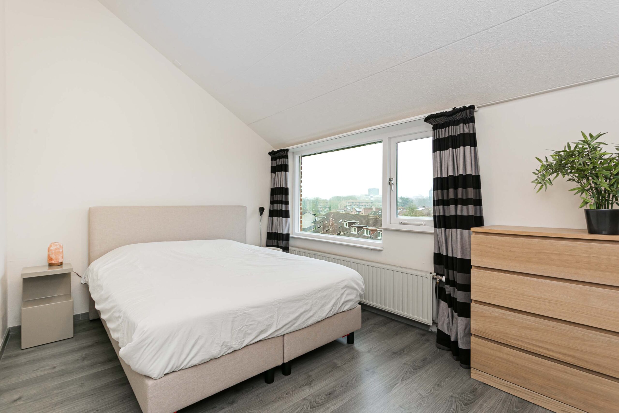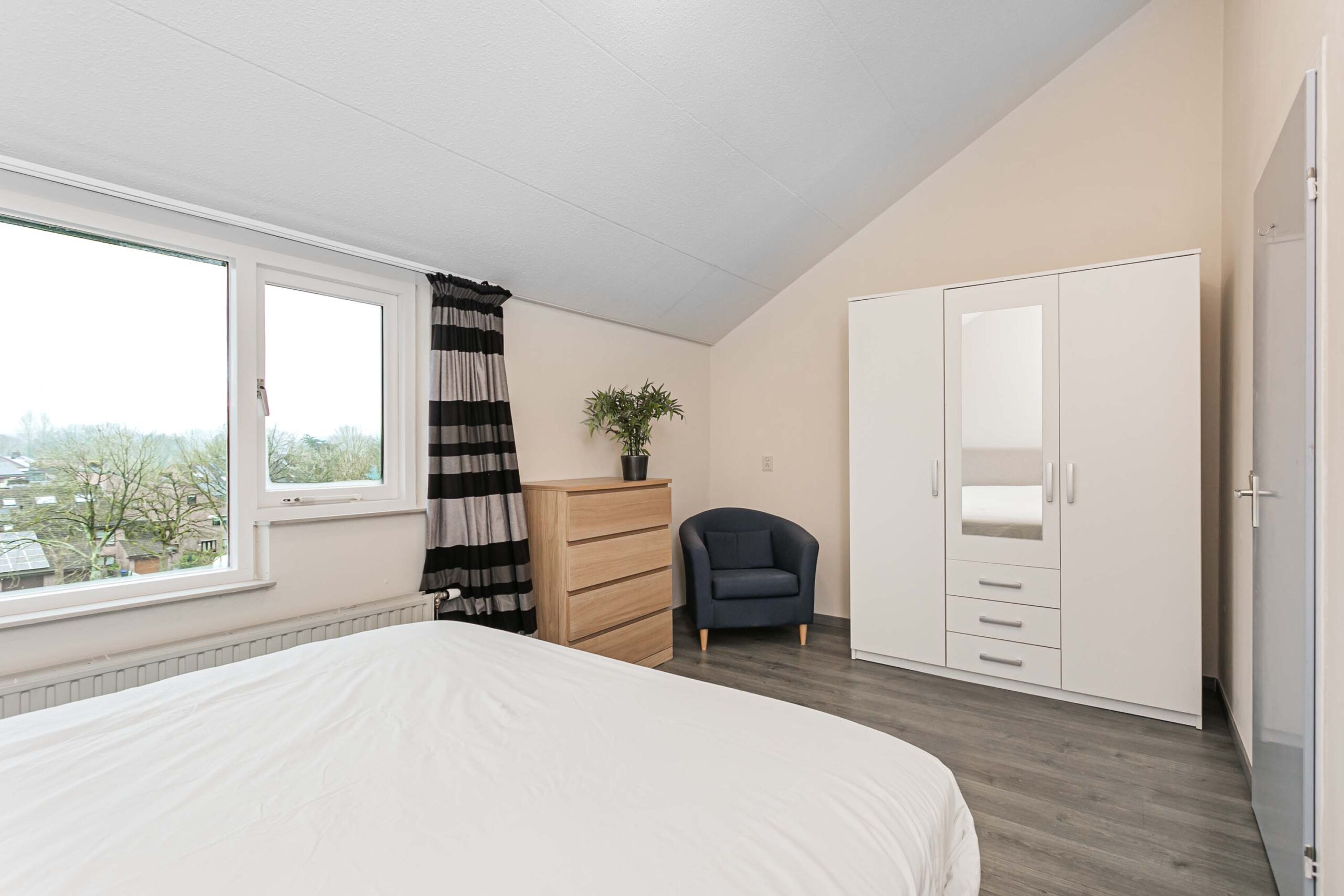 Aan de achterzijde ligt de ruime master bedroom: een lichte, ruimte kamer met hoge nok wat zorgt voor een ruimtelijk gevoel. Deze kamer heeft vrij uitzicht over de achtergelegen wijk Rijnsweerd.