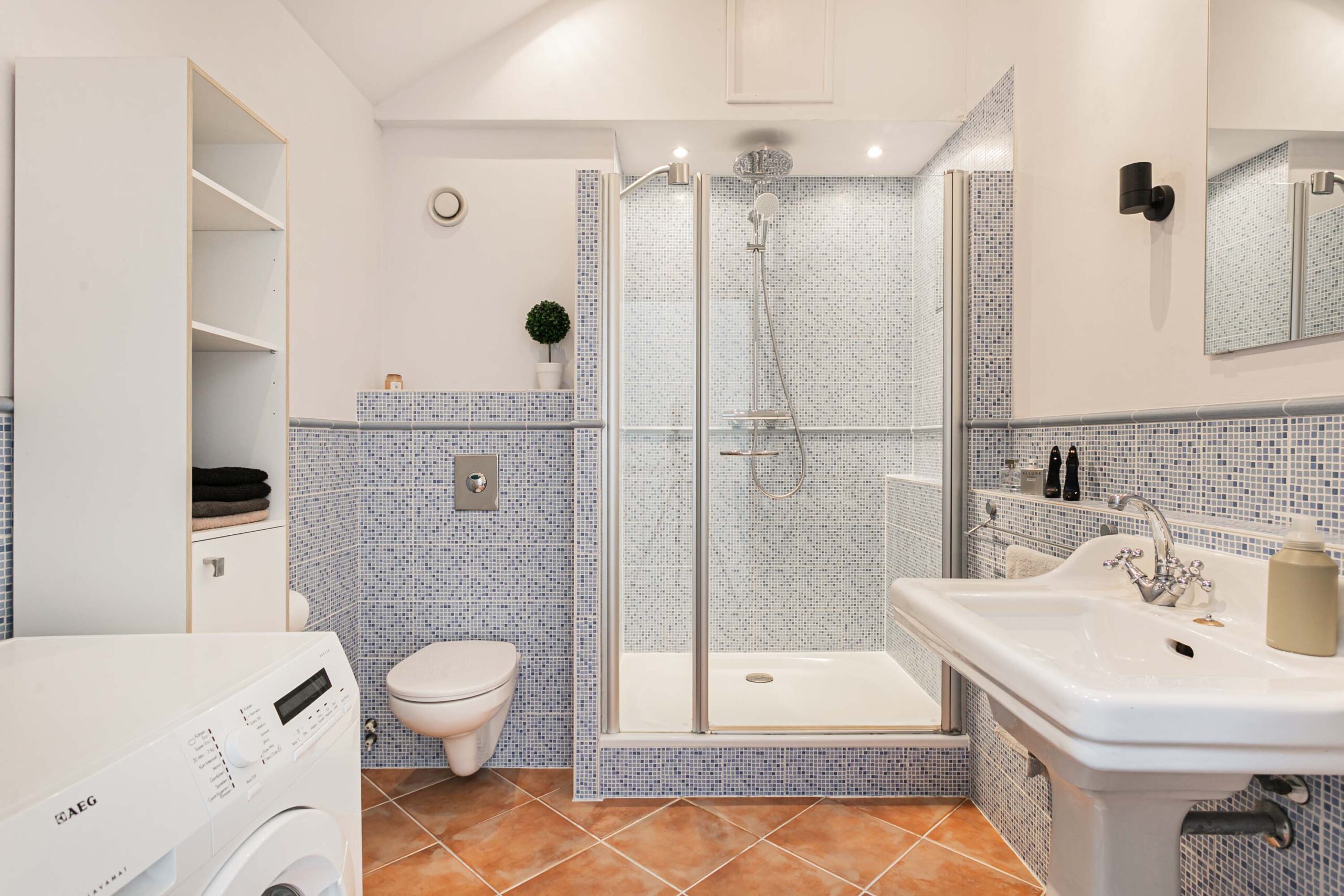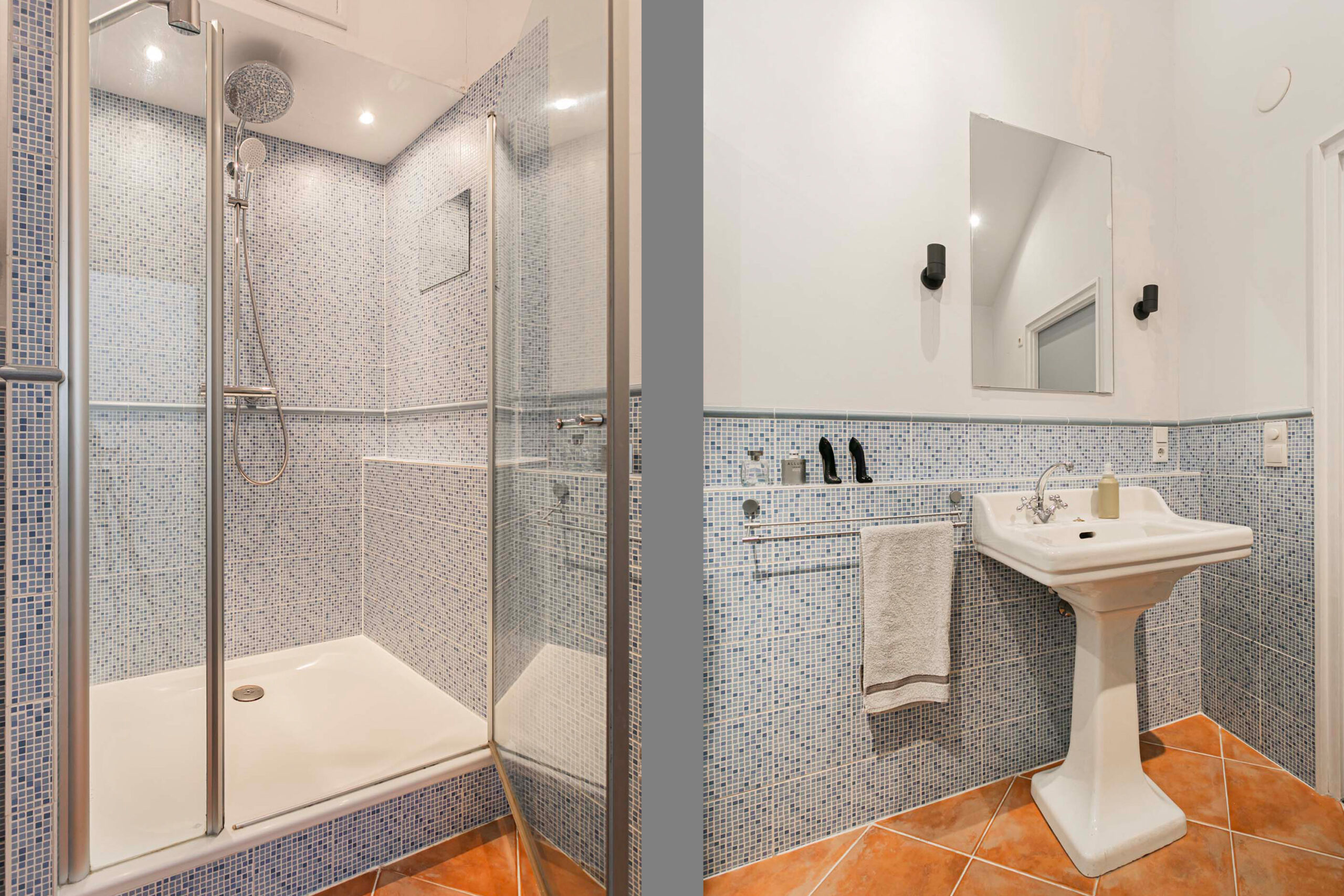 De moderne badkamer is uitgevoerd met frisse blauwwitte tegels en is voorzien van een douchecabine met regendouche, wastafel, 2e toilet en wasmachineaansluiting. Het hoge schuine plafond zorgt voor een extra ruimtelijk effect.
