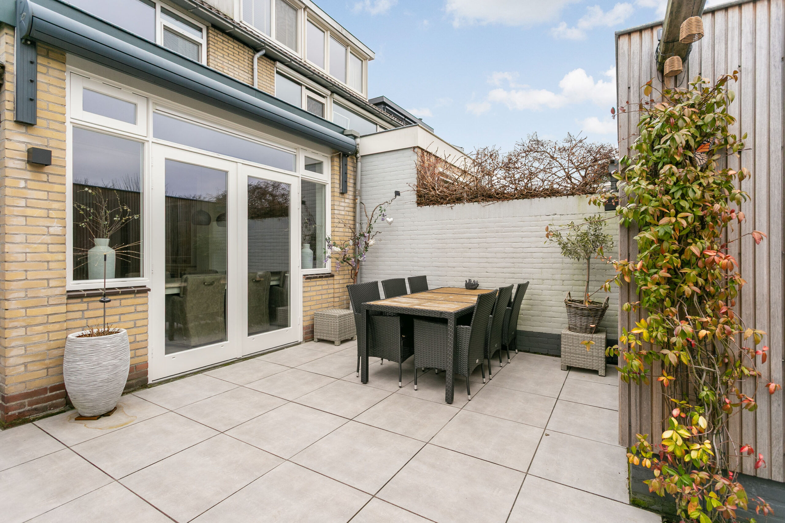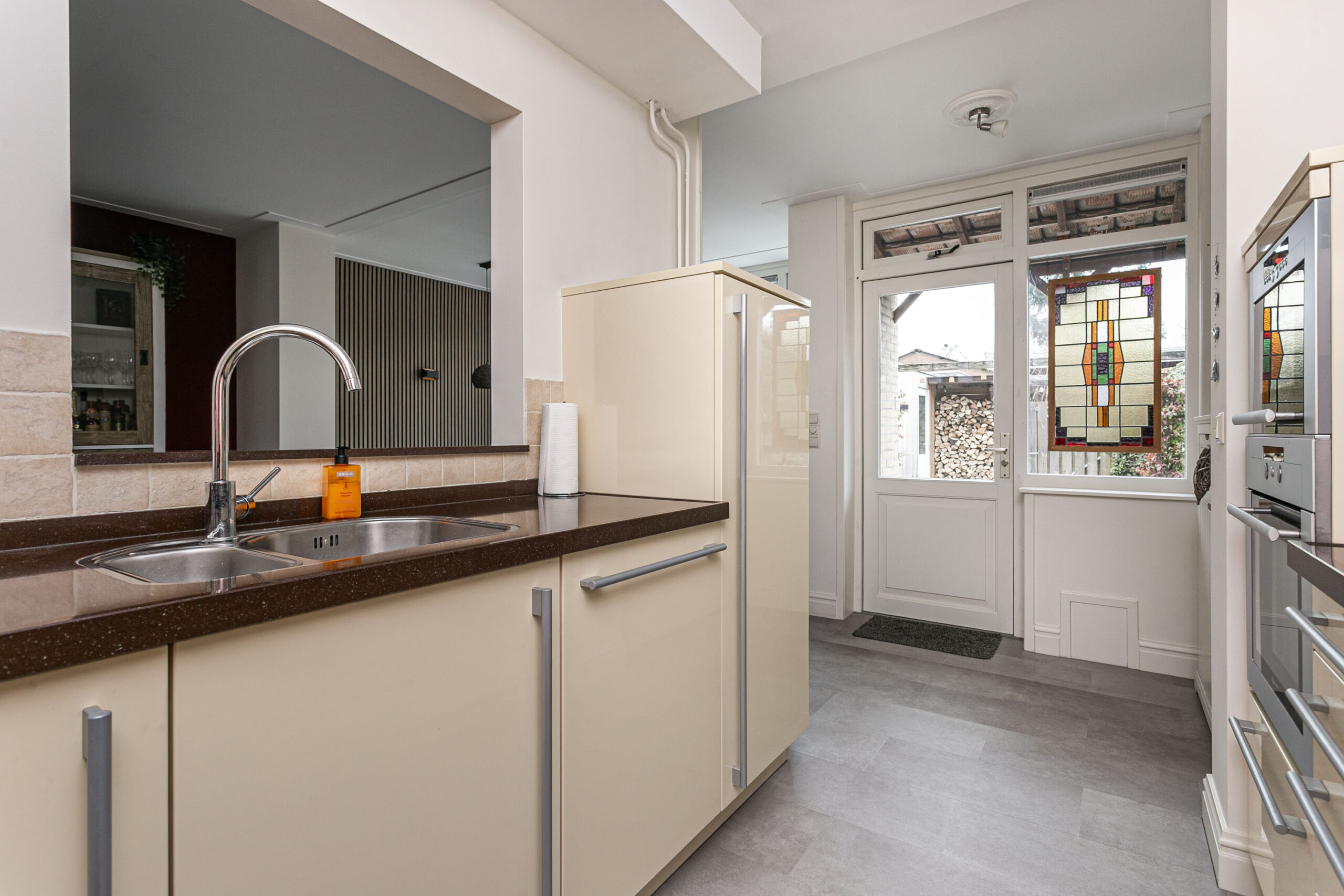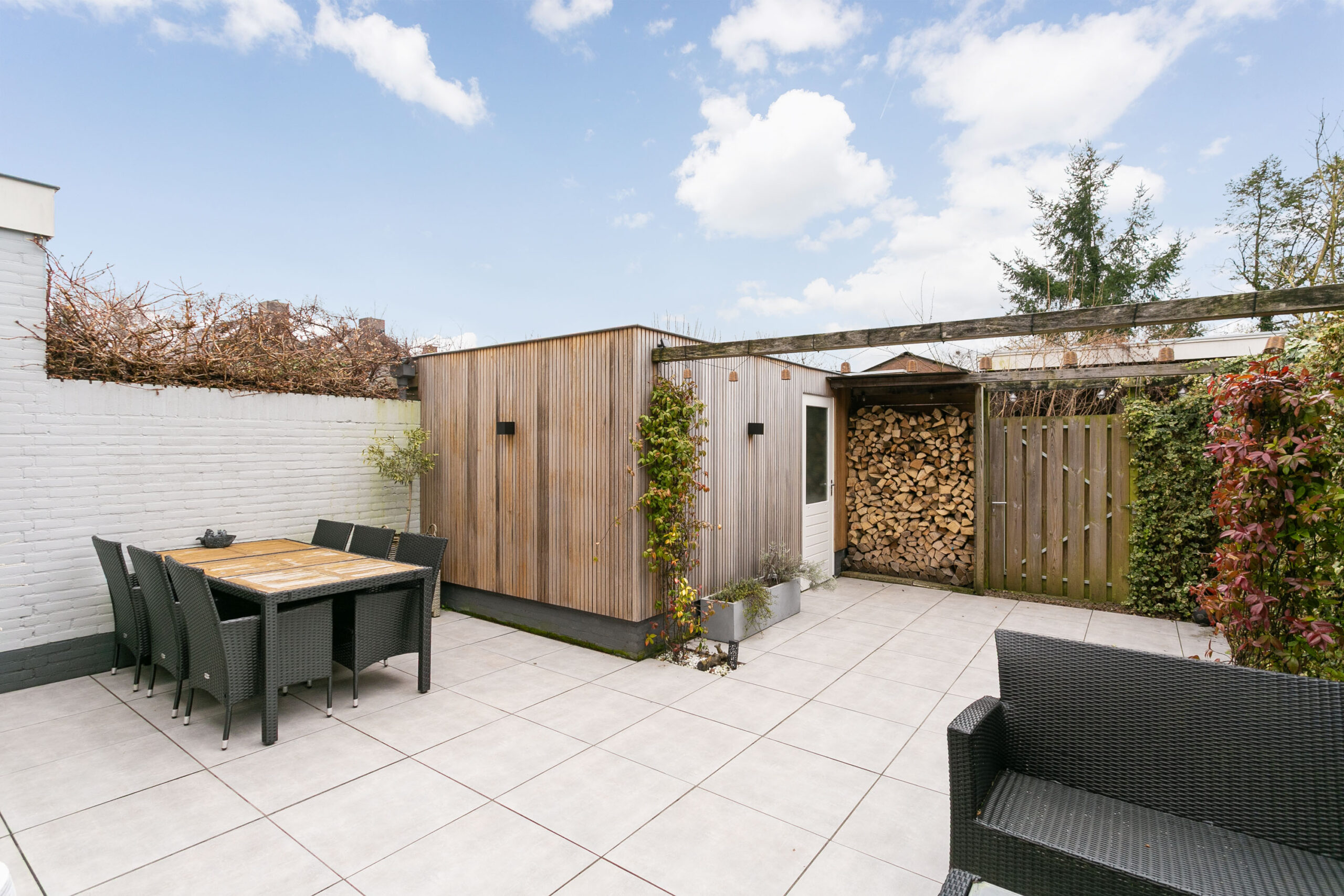 Vanuit de keuken is er eveneens toegang tot de zonnige achtertuin. Tuin is afgewerkt met grote, lichte tegels, de berging is sfeervol bekleed met houten panelen. Via de achterom is er ontsluiting naar de openbare weg.