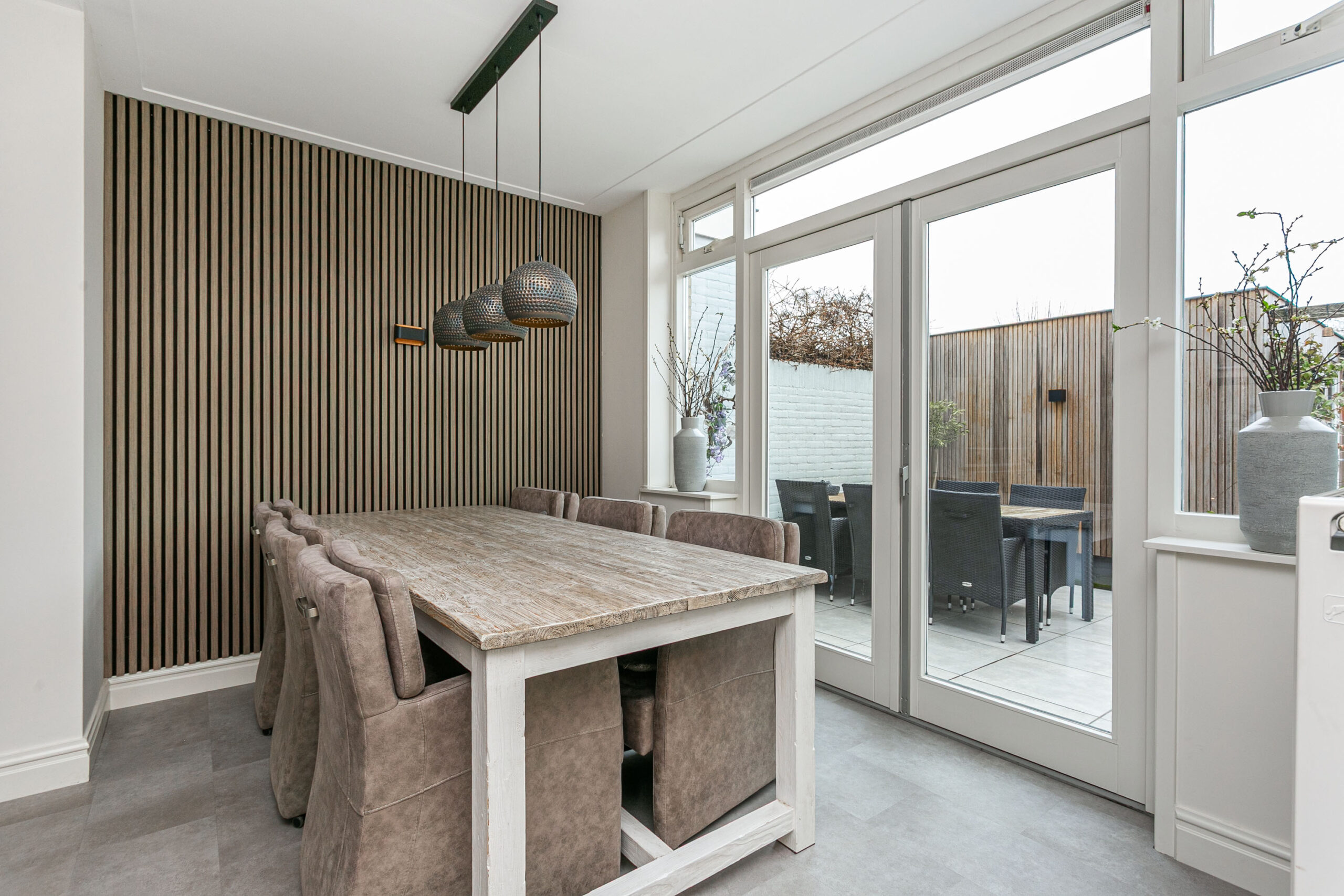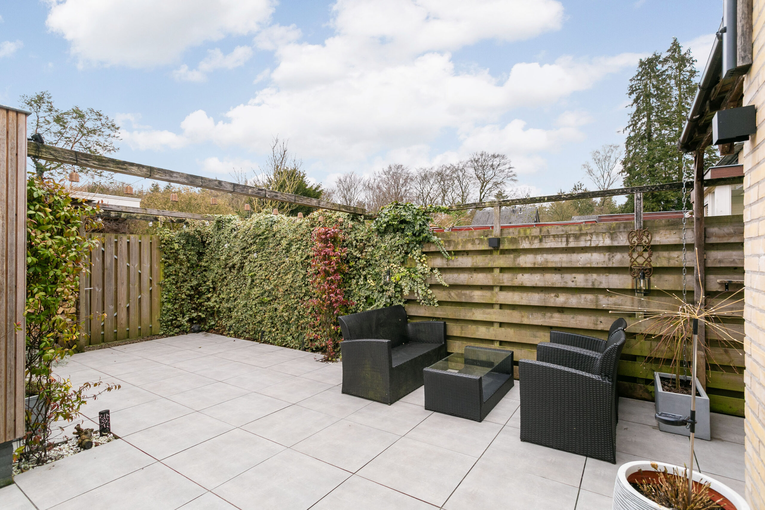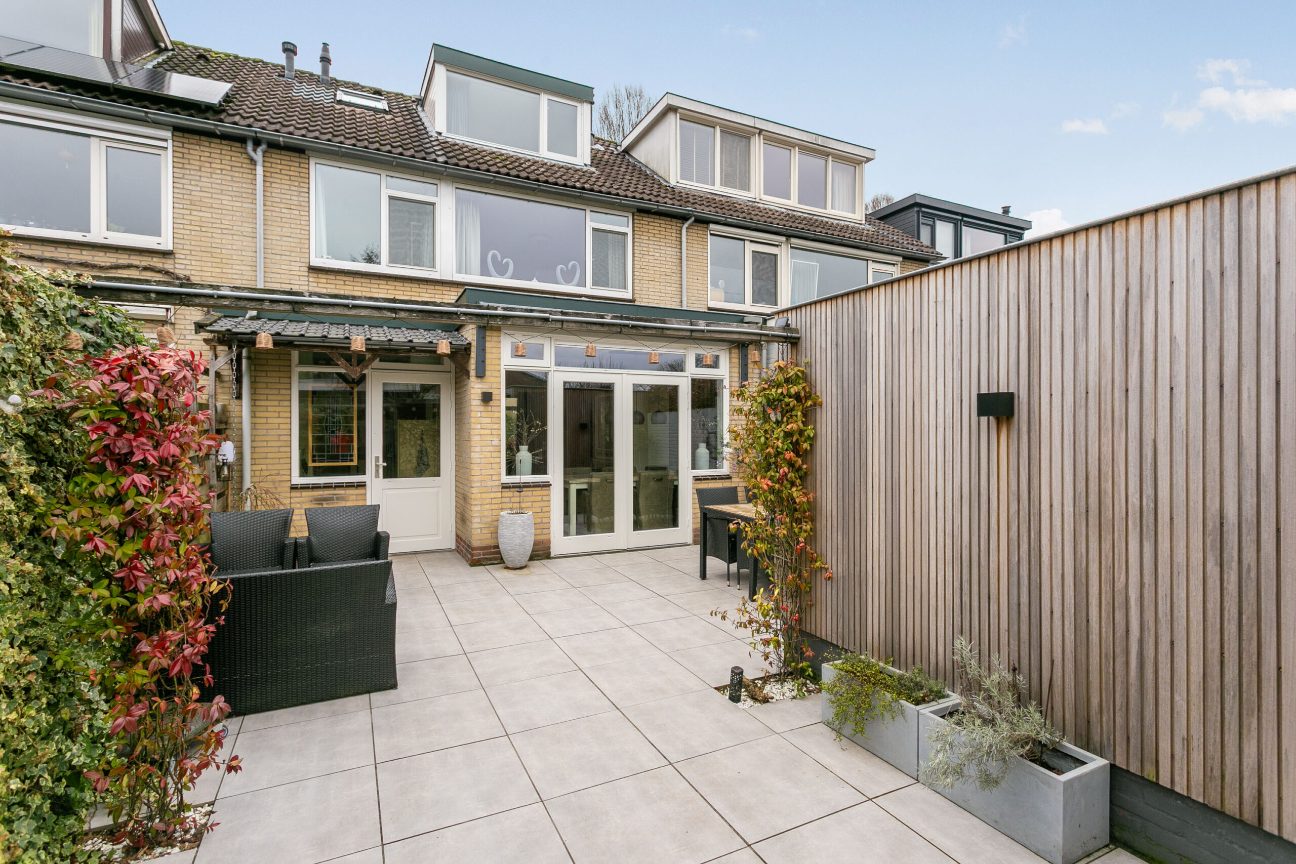 Vanuit de keuken is er eveneens toegang tot de zonnige achtertuin. Tuin is afgewerkt met grote, lichte tegels, de berging is sfeervol bekleed met houten panelen. Via de achterom is er ontsluiting naar de openbare weg.