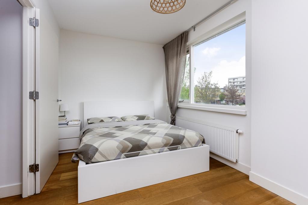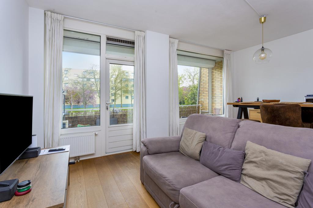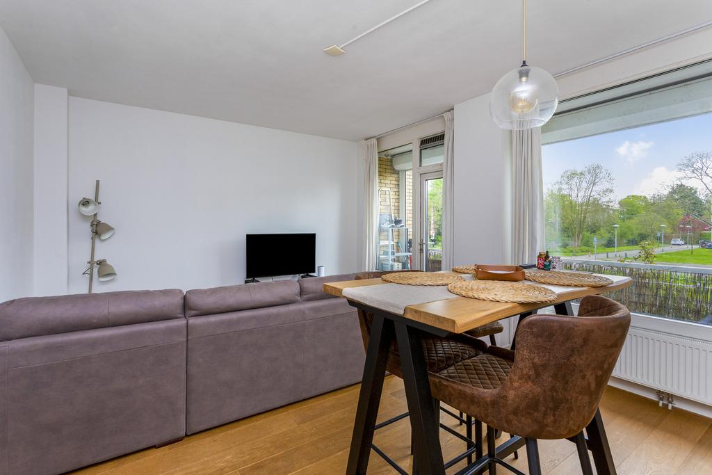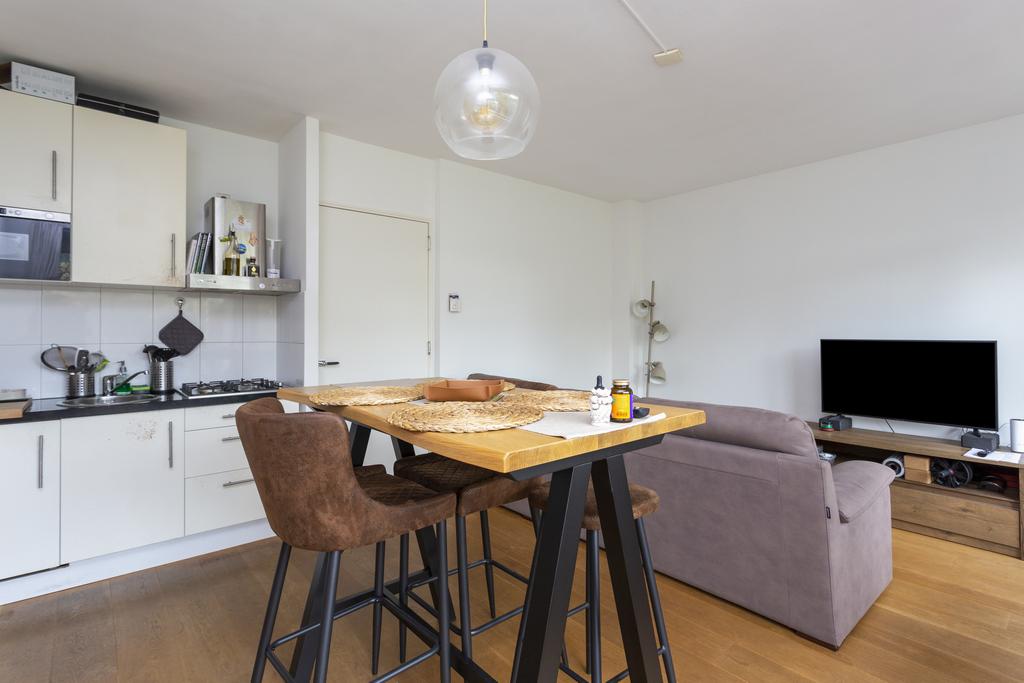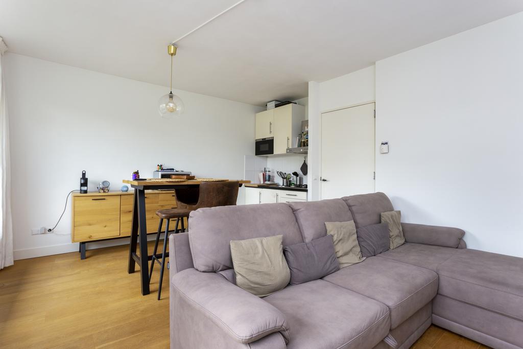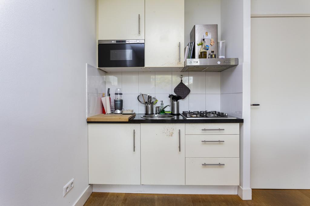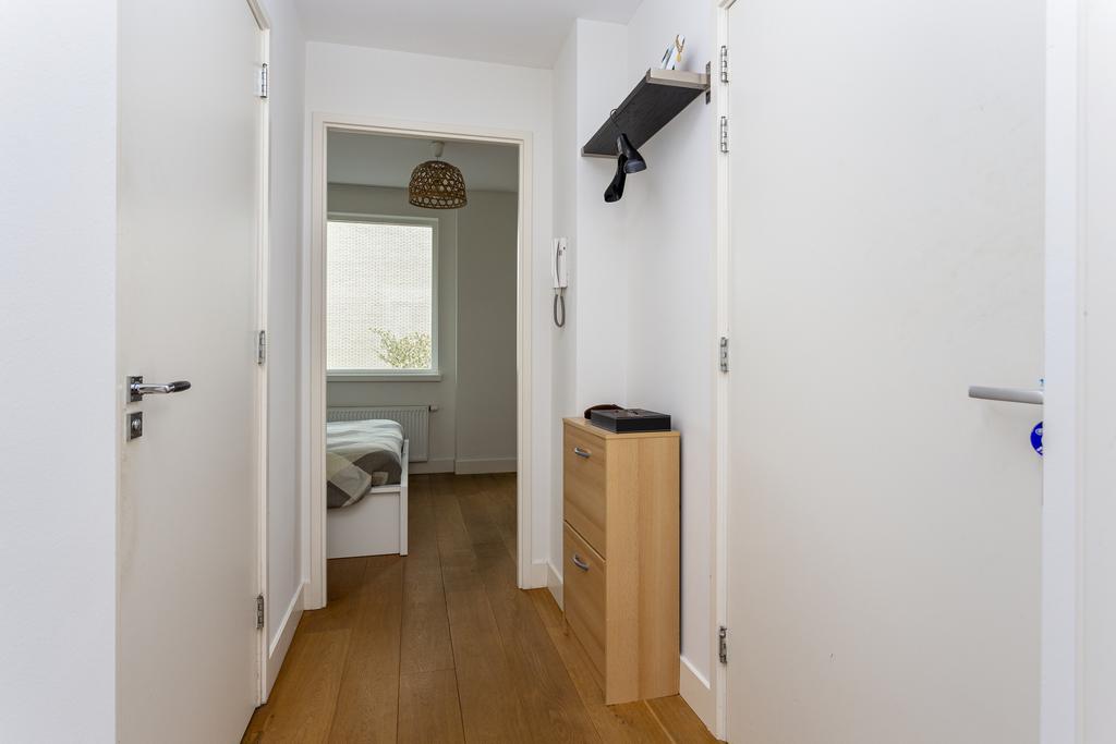 Entree tot de woning met hal. Aan de voorzijde is een riante slaapkamer met grote kledingkast. Keurig nette badkamer, volledig betegeld, met inloopdouche, wastafel, toilet (wandcloset) en aansluiting t.b.v. wasmachine. De lichte living aan de achterzijde van de woning bestaat uit een woonkamer met open keuken en deur naar het zonnige balkon. De keuken is voorzien van gaskookplaat, afzuigkap, magnetron en koelkast. Het gehele appartement (m.u.v. badkamer) is afgewerkt met een houten parketvloer.