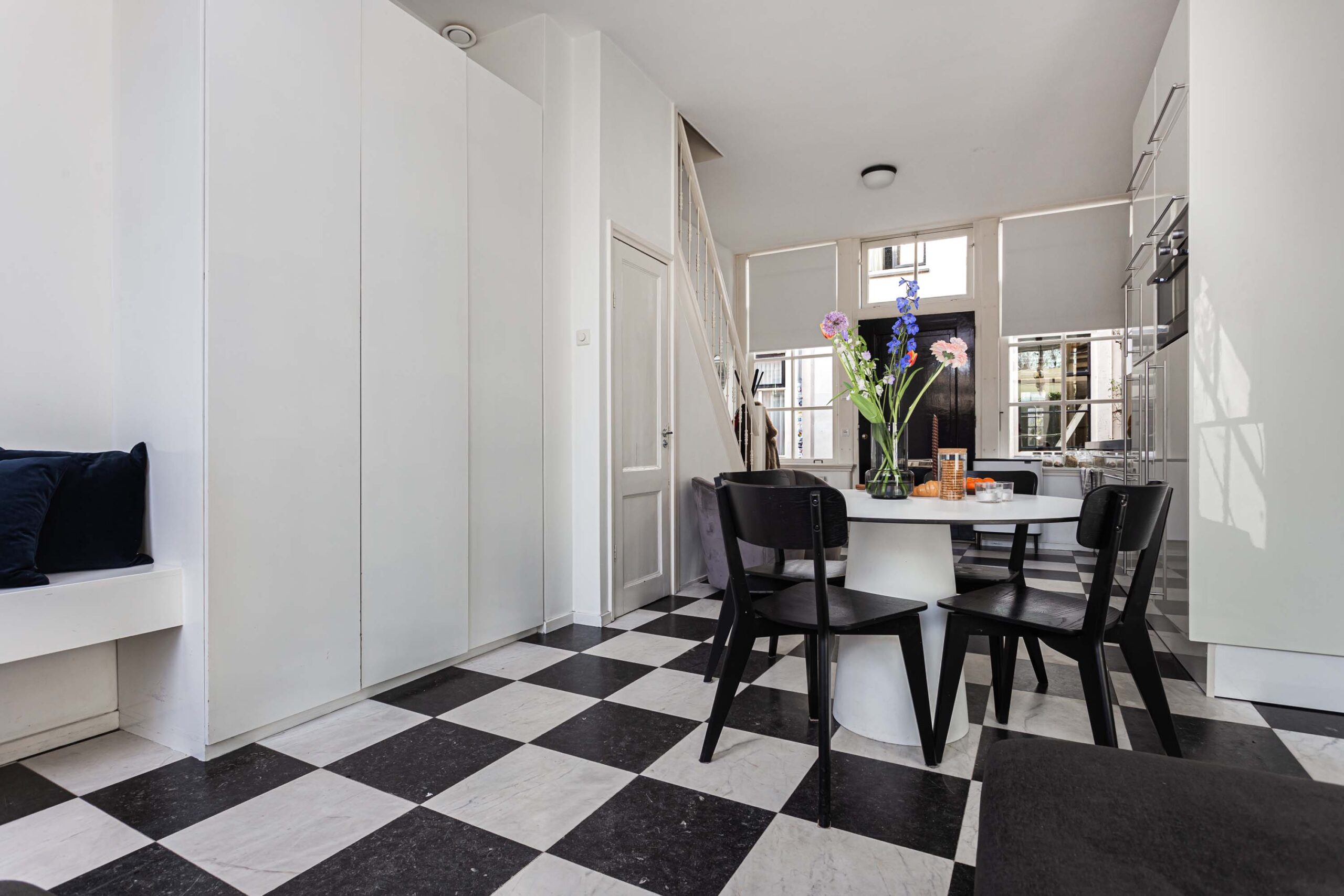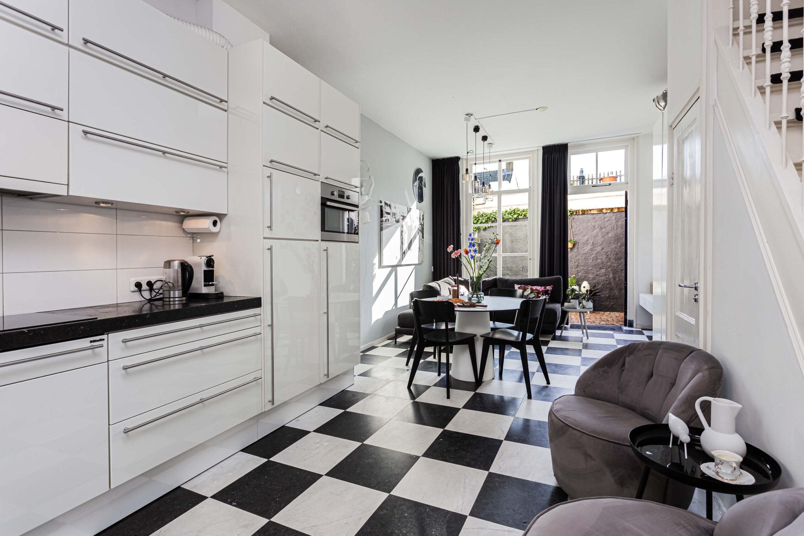 Entree tot riante woonkeuken met fraaie natuurstenen vloer (voorzien van vloerverwarming), rechte Sie-Matic keuken met inbouwapparatuur: inductiekookplaat, afzuigkap, combi-oven, koelkast met vriesvak en vaatwasser. Vanuit de woonkeuken is er toegang tot de beschutte en zonnige achtertuin, waar je vanaf de eerste zonnestralen in het jaar heerlijk buiten kunt vertoeven.