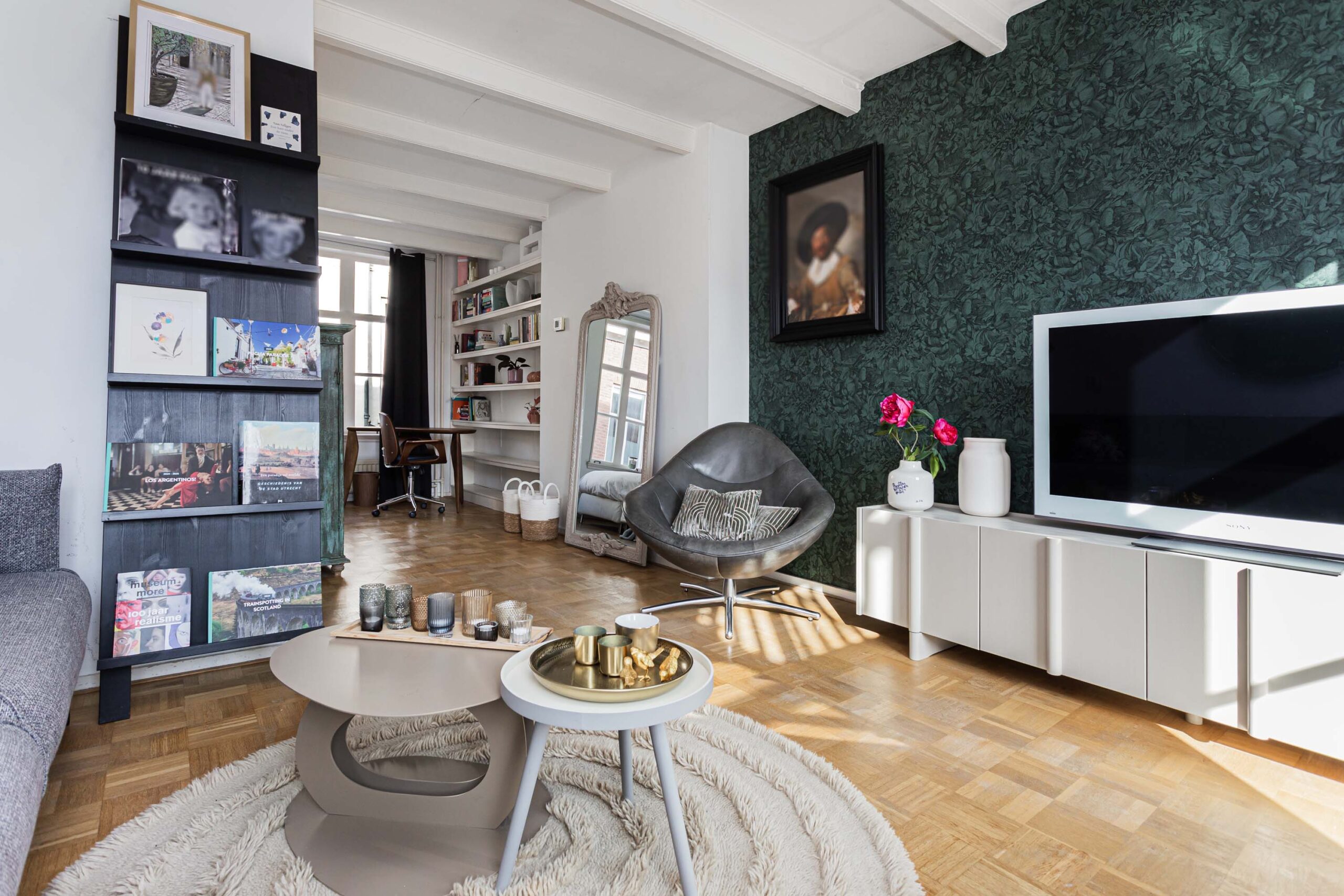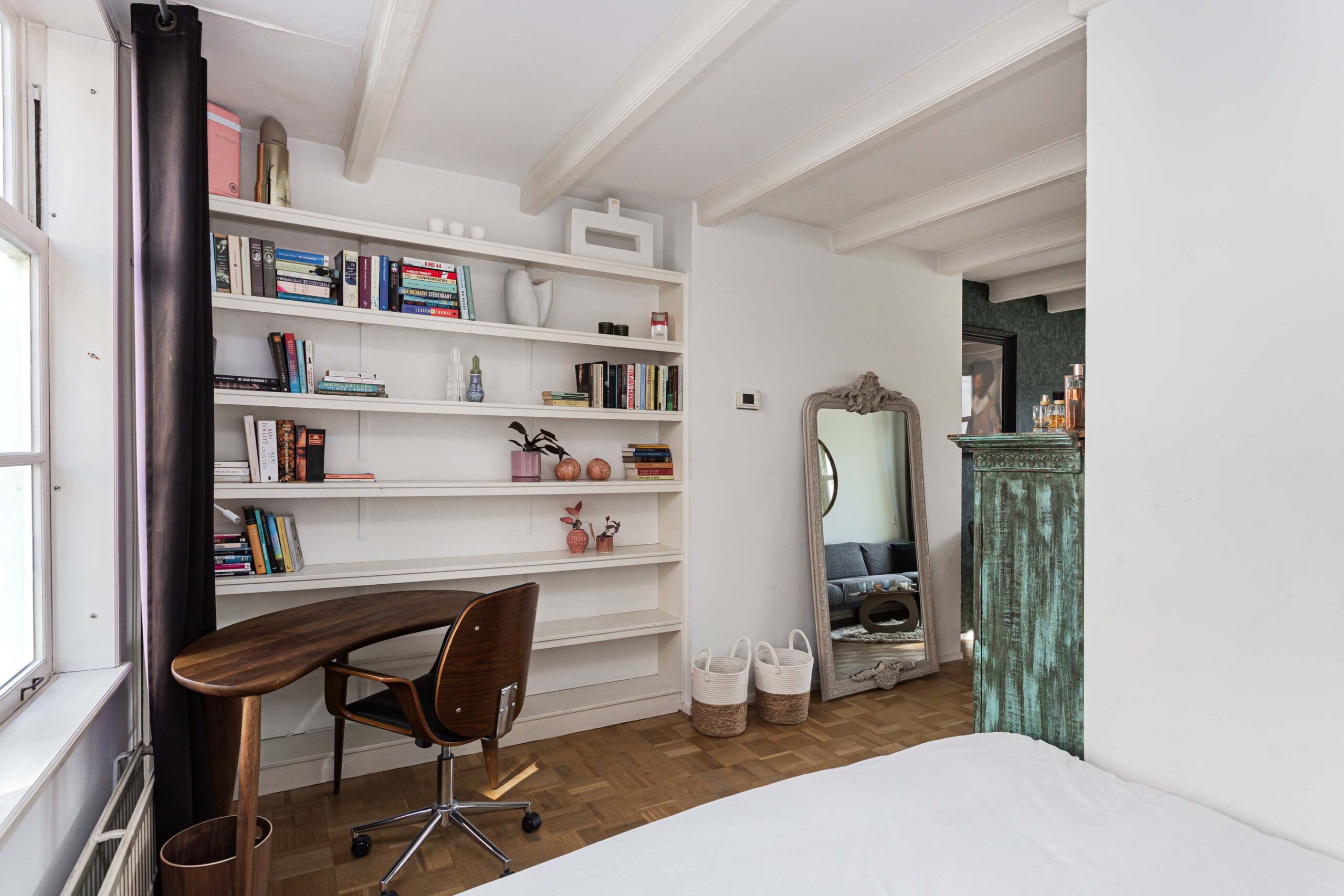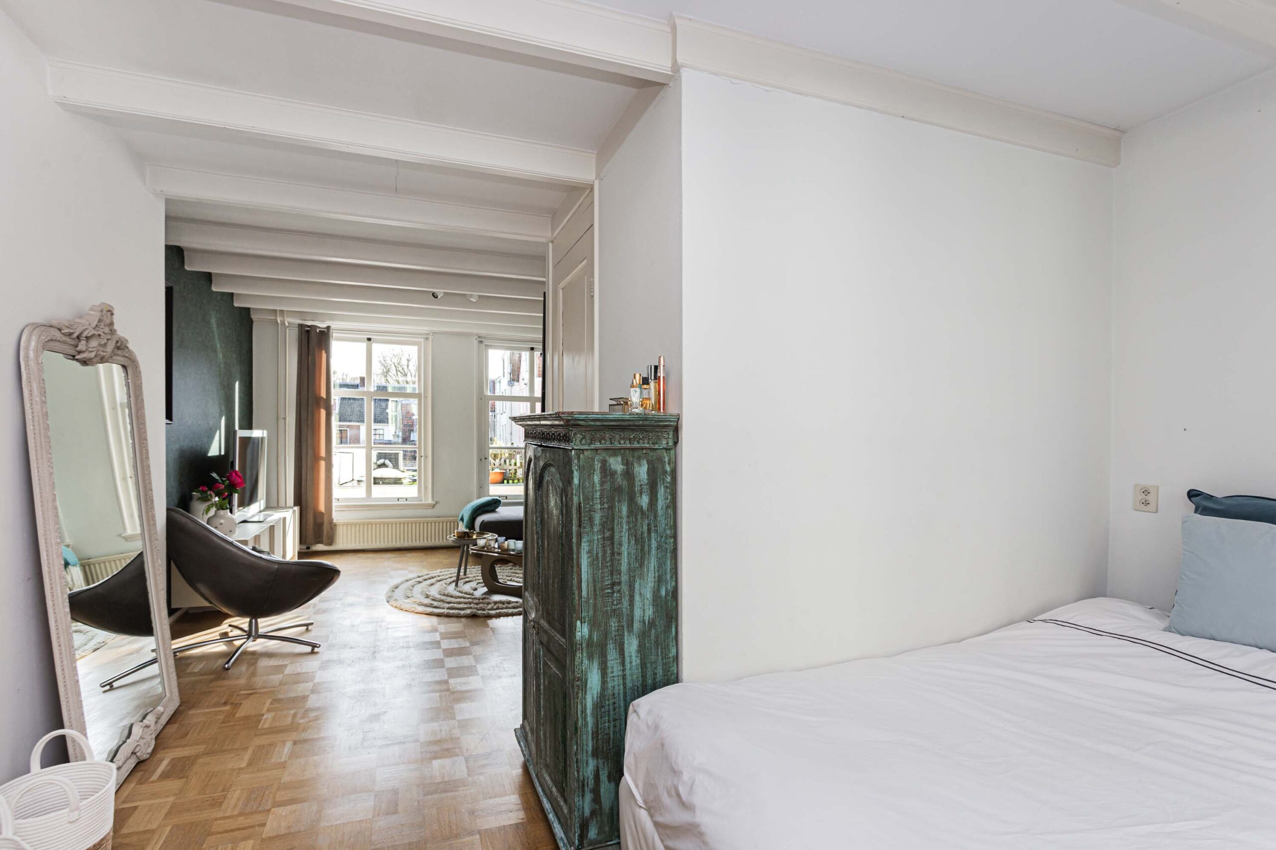 Ruime open verdieping met woonkamer en aan de voorzijde thans een slaapgedeelte welke gemakkelijk ingericht kan worden als werkplek. De verdieping is voorzien van een parketvloer. De wanden zijn grotendeels van glad stucwerk.