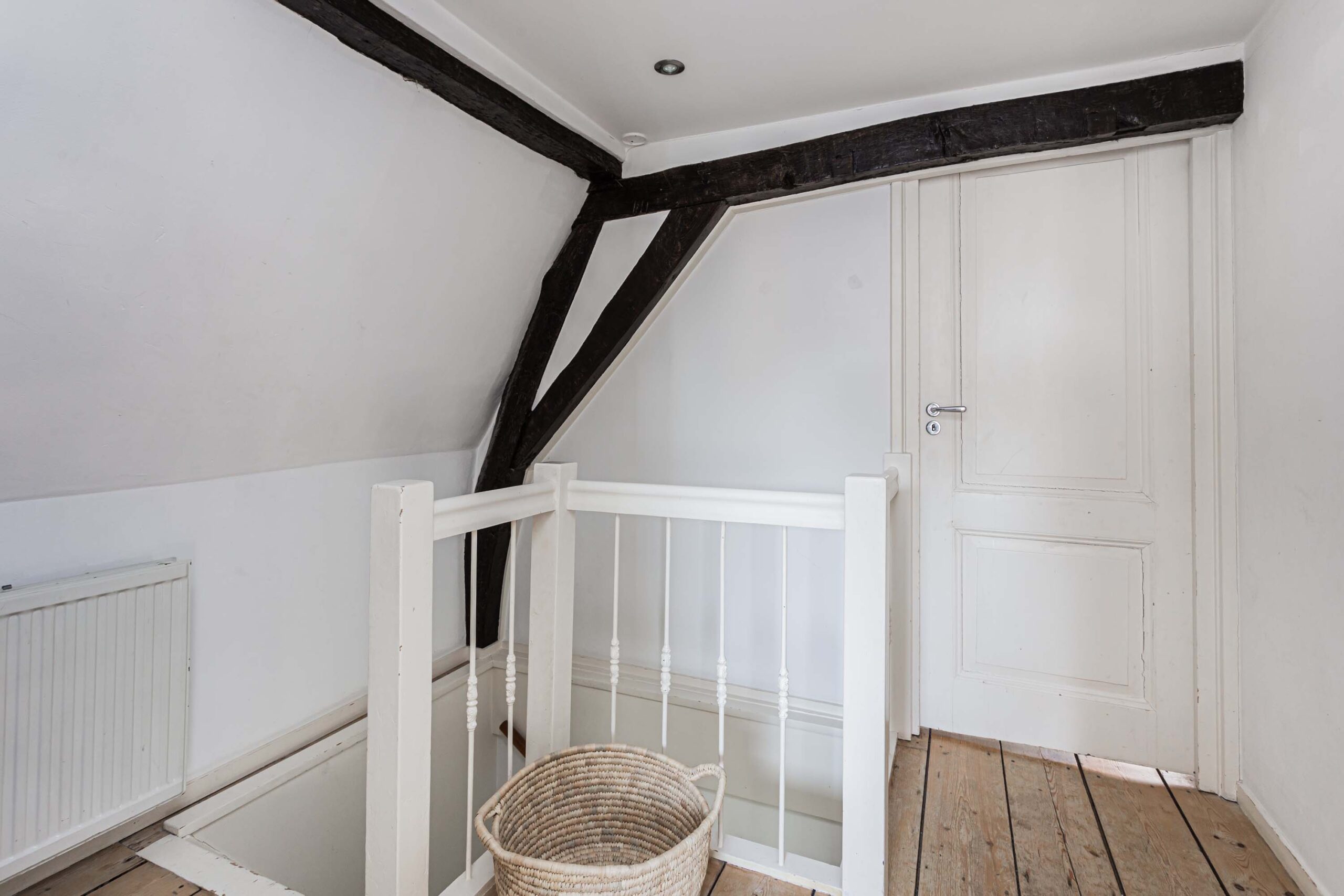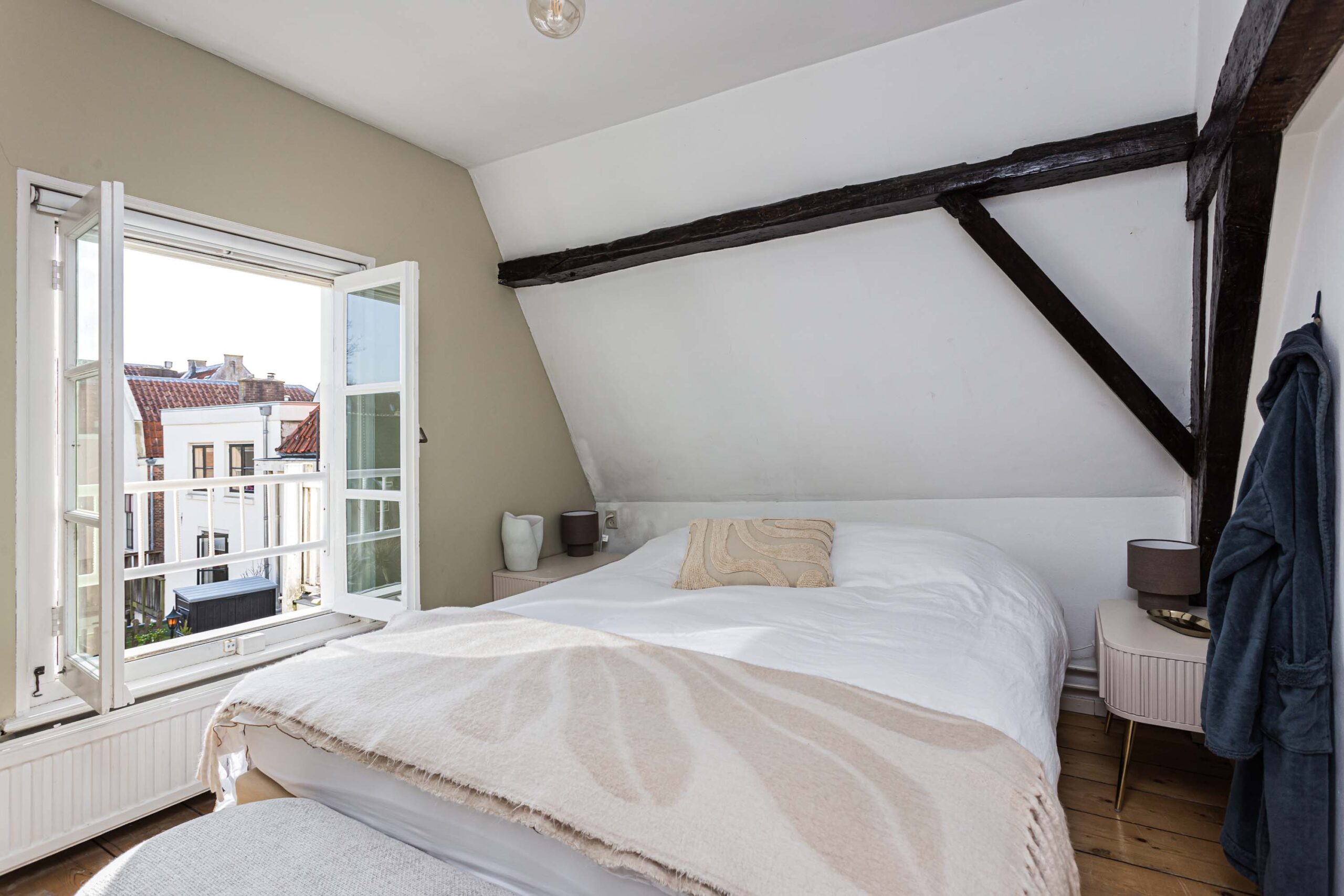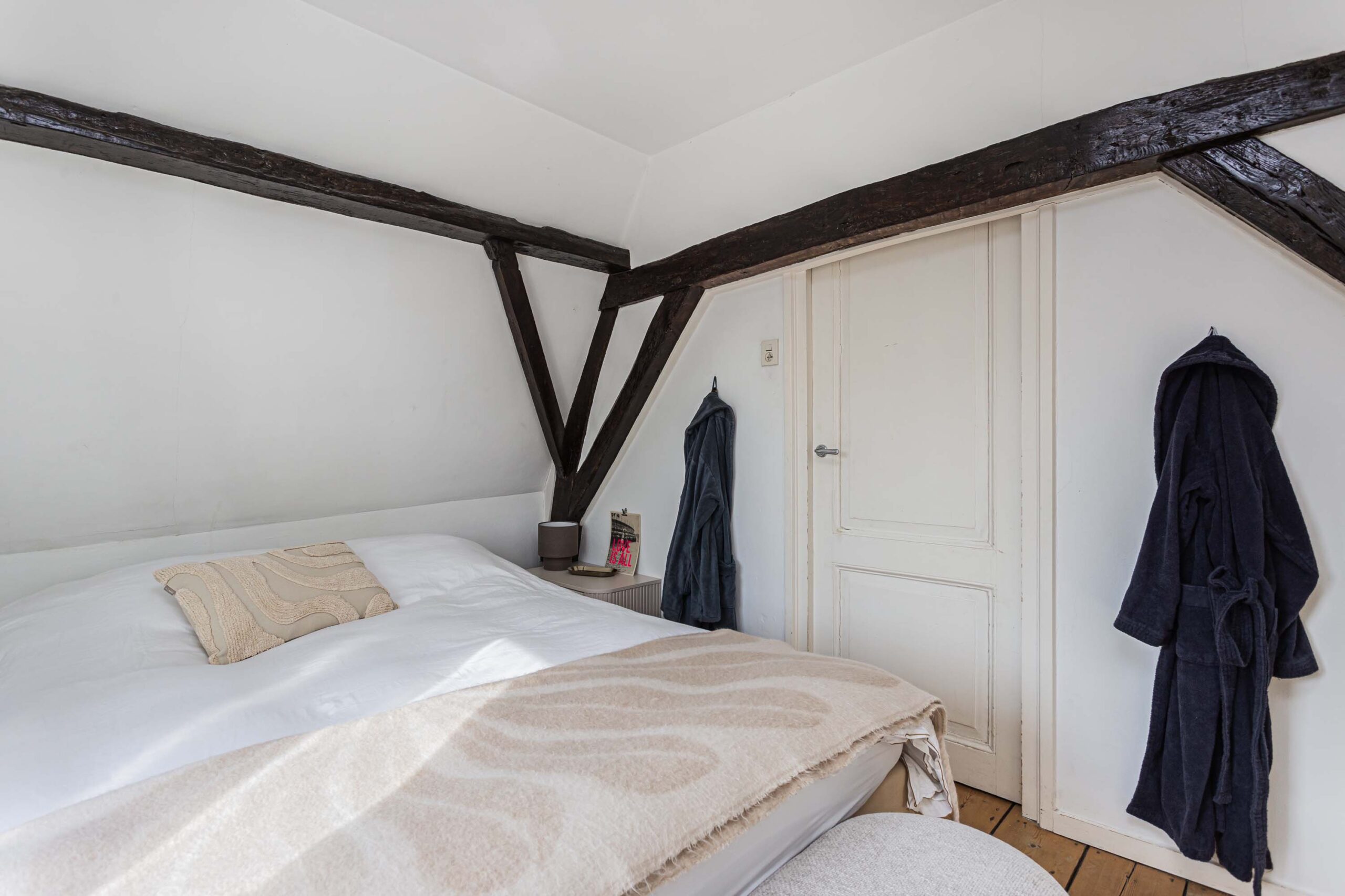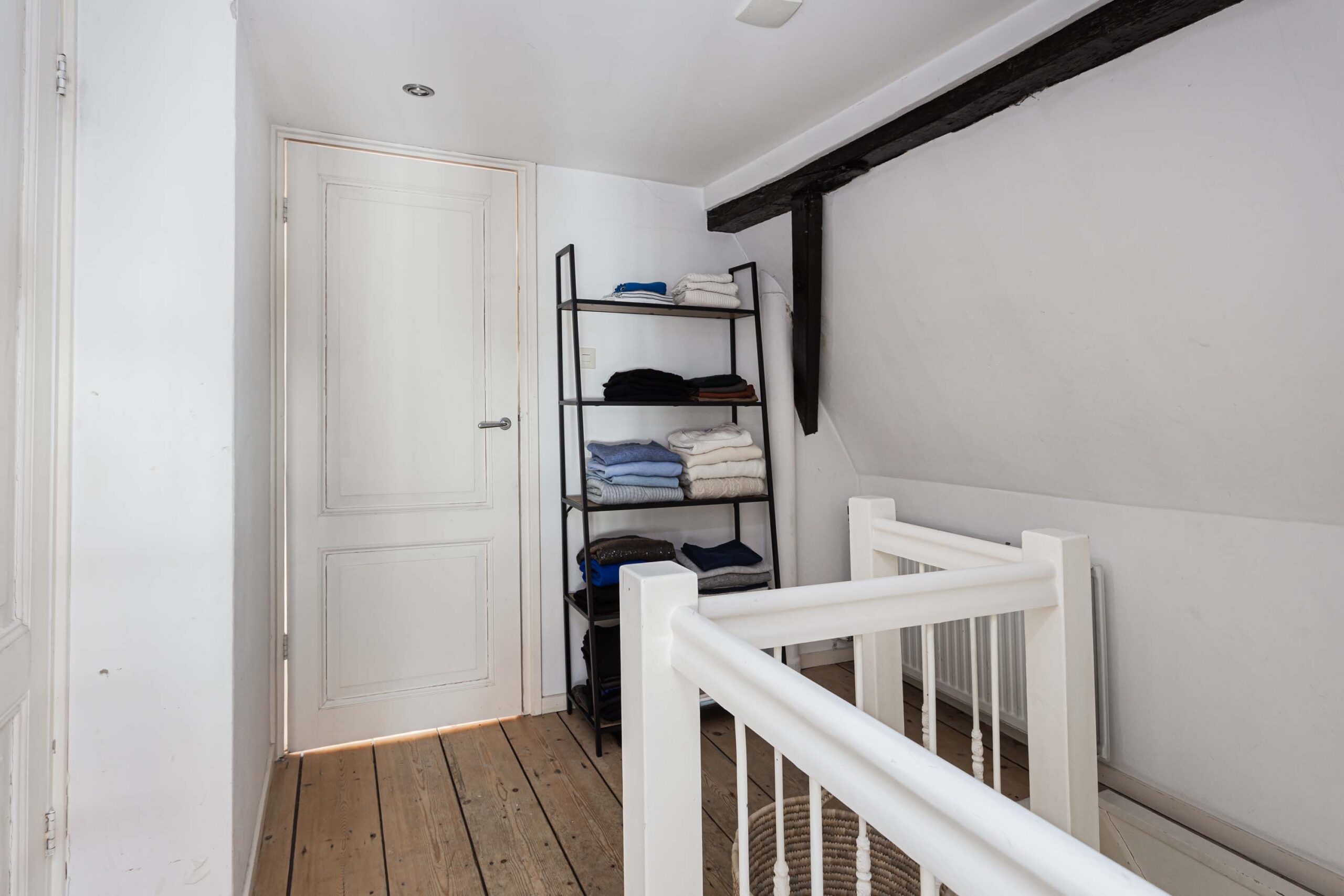 Overloop met toegang tot 2 slaapkamers en de geheel vernieuwde badkamer. Deze verdieping beschikt over een houten plankenvloer. Daarnaast zijn de fraaie monumentale dakbalken in het zicht. De voorslaapkamer is voorzien van open kastruimte en slaapentresol met dakramen, vanwaar een prachtig zicht is op de Domtoren. Bergvliering bereikbaar van entresol. De luxe en moderne badkamer (2025) is voorzien van inloopdouche met regendouche, ingebouwde kranen, wastafelmeubel en wandcloset. In de badkamer is smaakvol zwart sanitair toegepast.