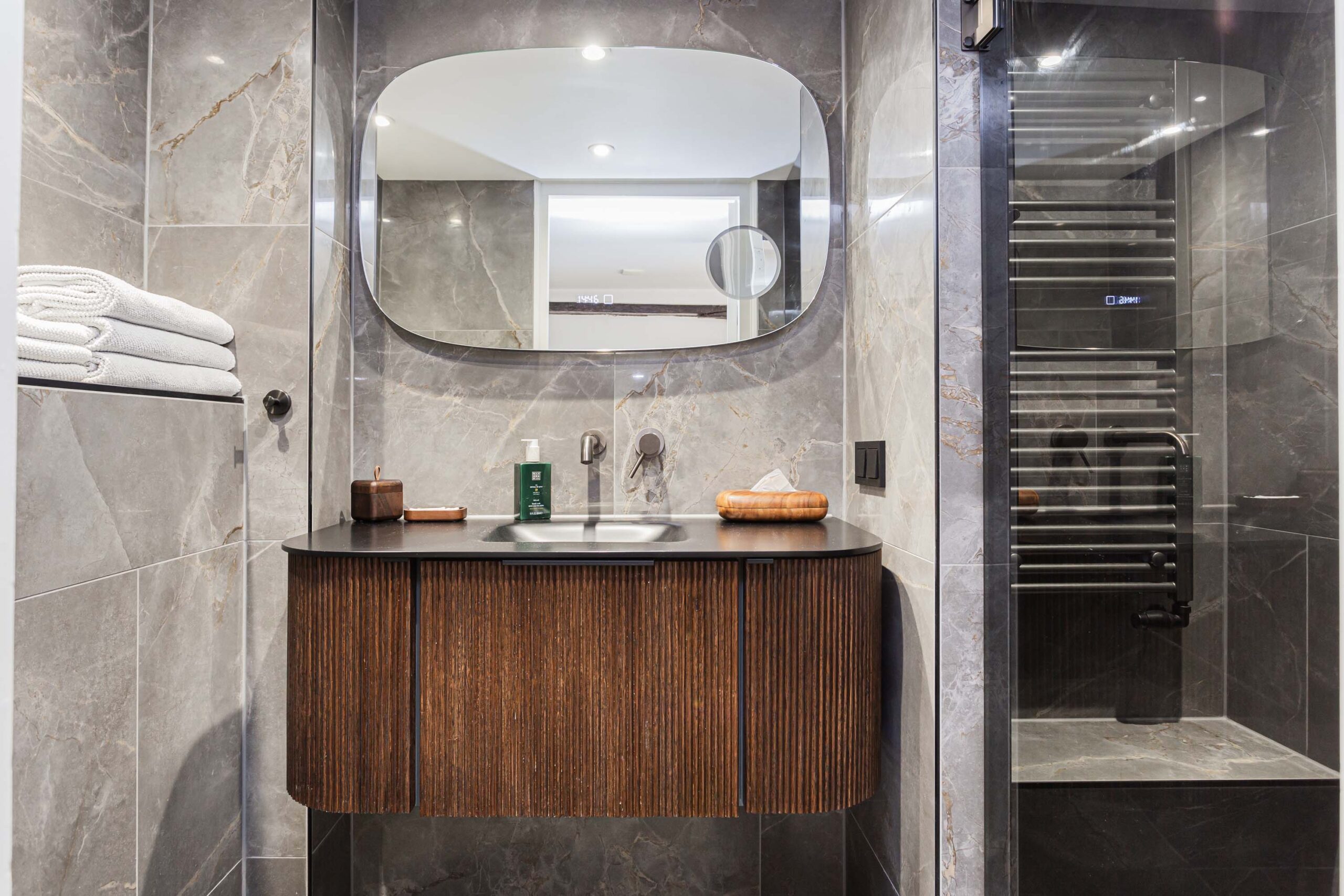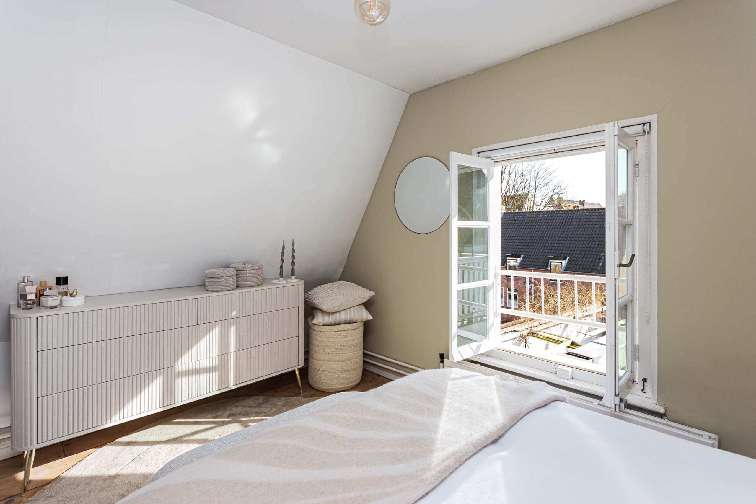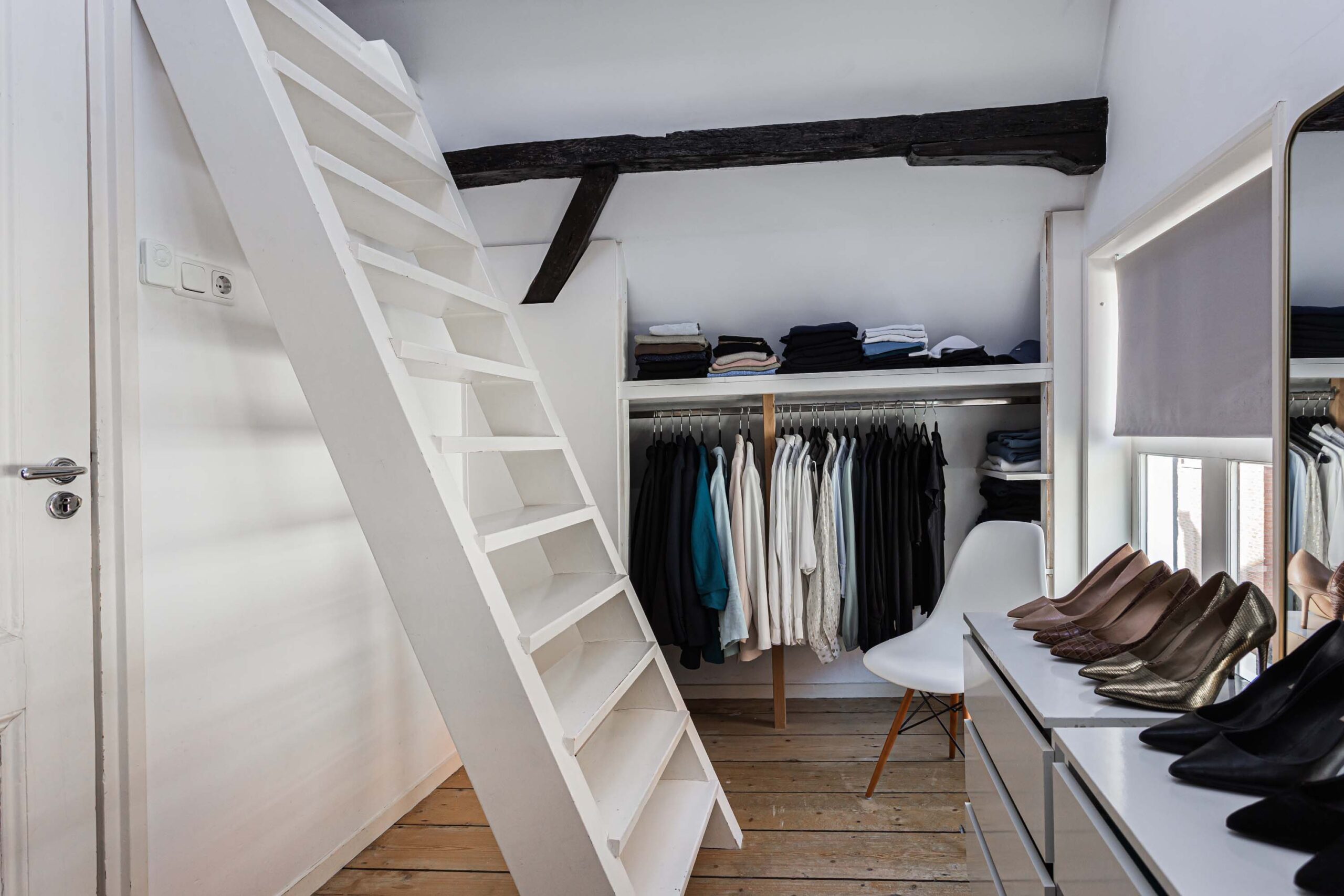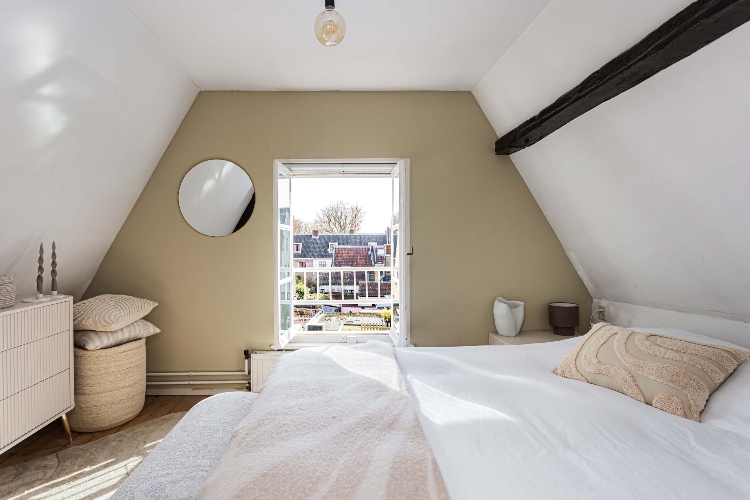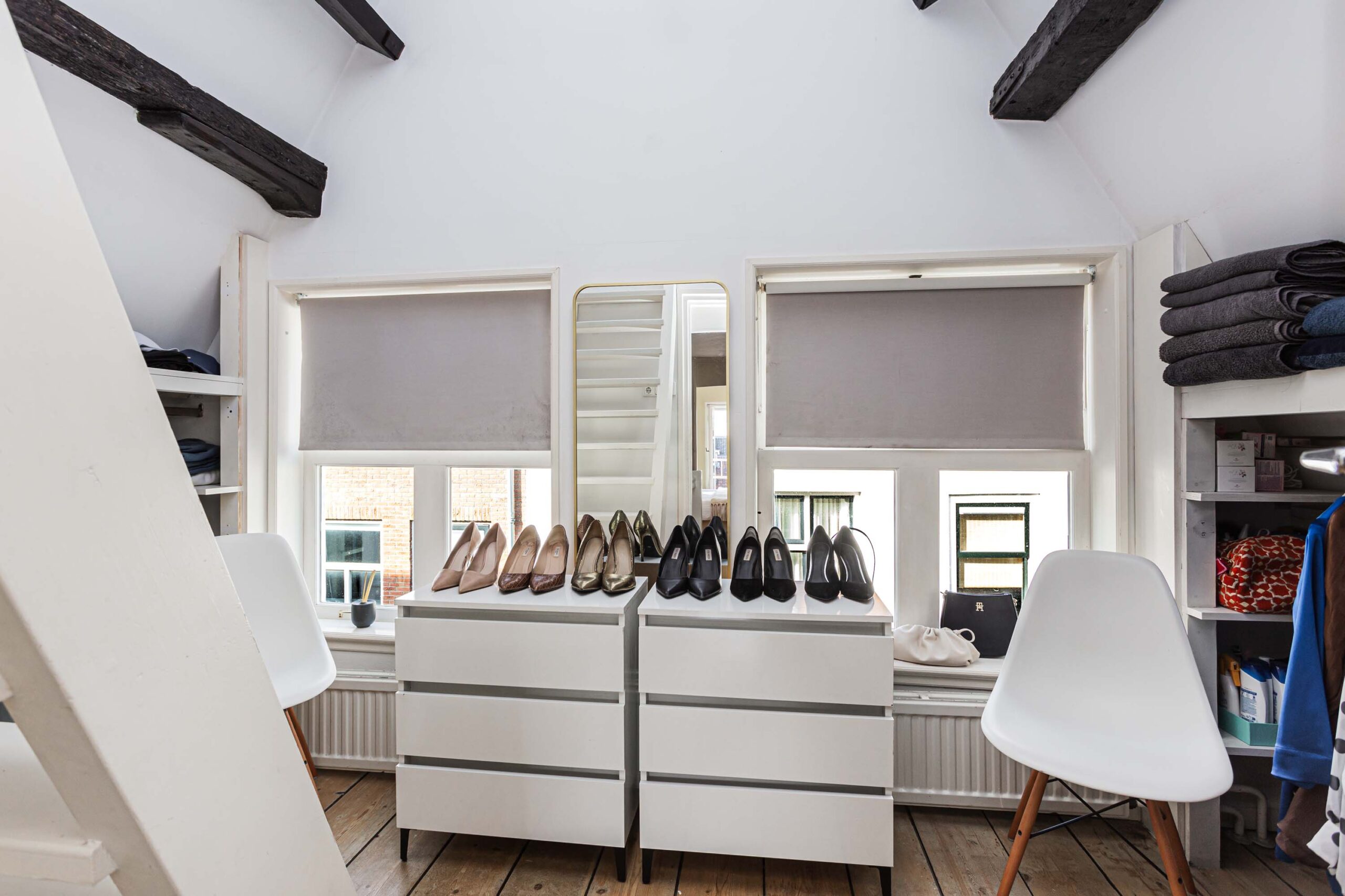 Overloop met toegang tot 2 slaapkamers en de geheel vernieuwde badkamer. Deze verdieping beschikt over een houten plankenvloer. Daarnaast zijn de fraaie monumentale dakbalken in het zicht. De voorslaapkamer is voorzien van open kastruimte en slaapentresol met dakramen, vanwaar een prachtig zicht is op de Domtoren. Bergvliering bereikbaar van entresol. De luxe en moderne badkamer (2025) is voorzien van inloopdouche met regendouche, ingebouwde kranen, wastafelmeubel en wandcloset. In de badkamer is smaakvol zwart sanitair toegepast.