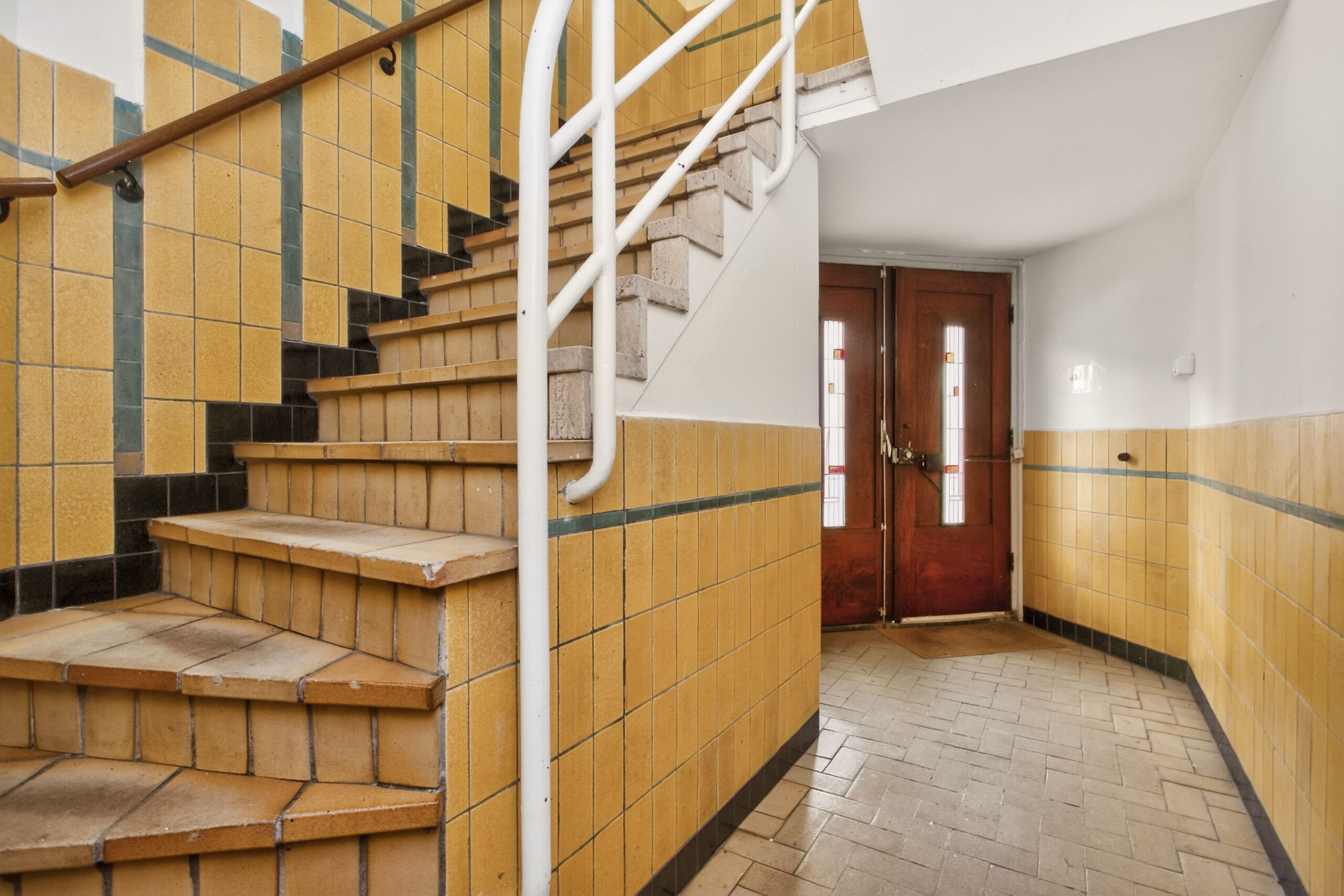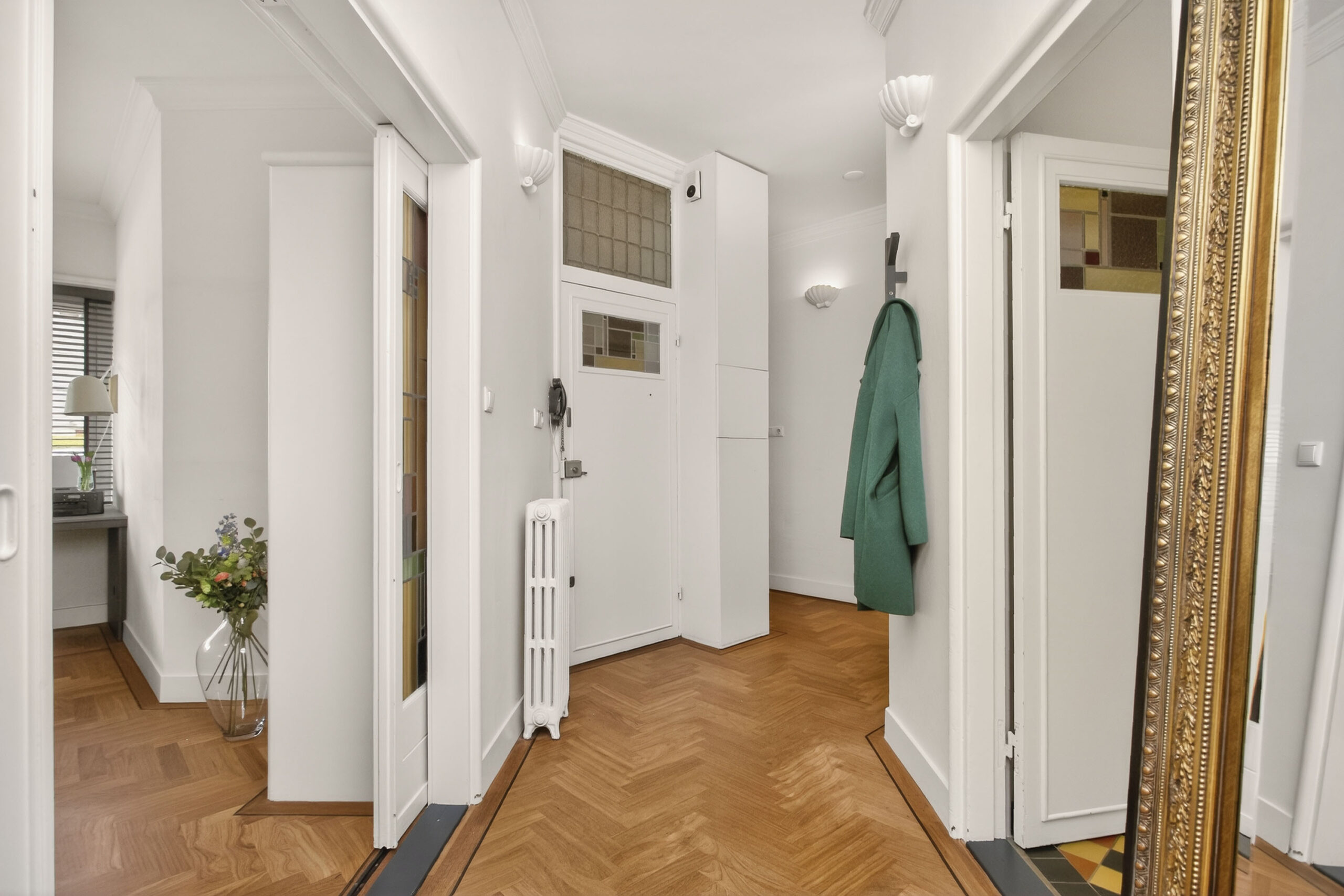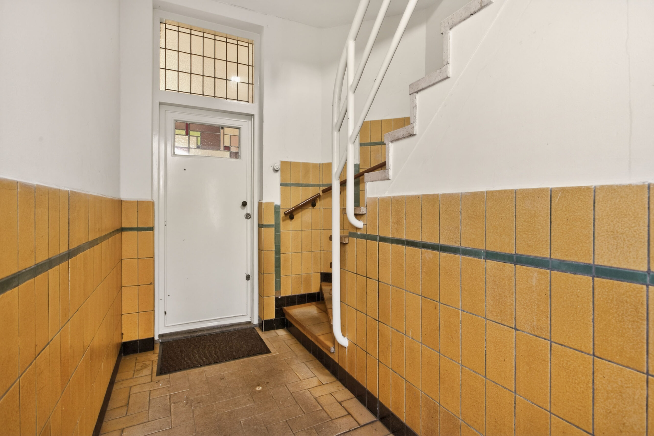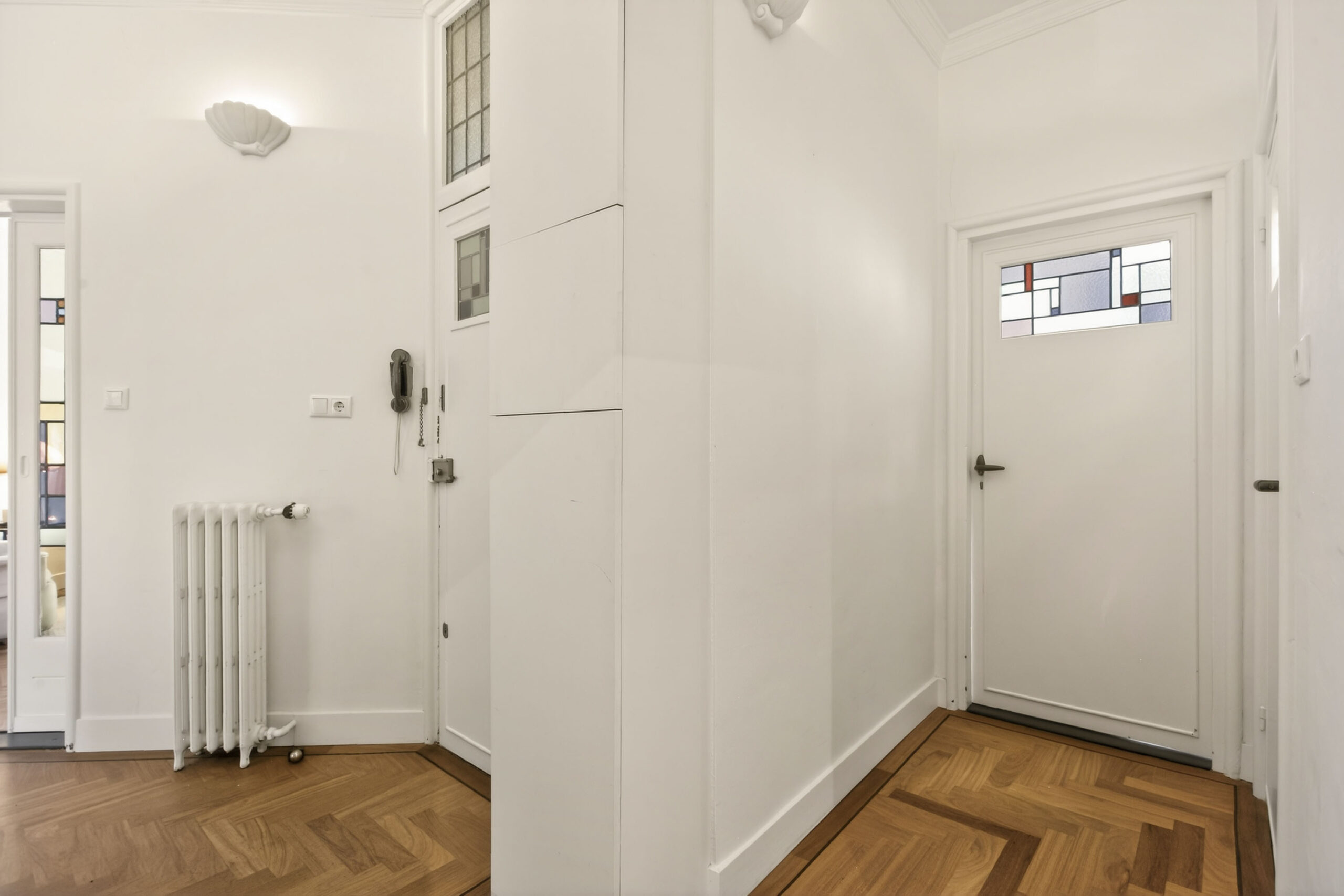 Centrale entree met sfeervolle hal. Entree naar de woning, in de hal valt meteen al op dat veel details optimaal bewaard zijn gebleven, stucplafonds met ornamenten en lijsten, visgraat parketvloer, paneeldeuren, en-suite deuren met glas-in-lood. Toilet met wandcloset en fontein.