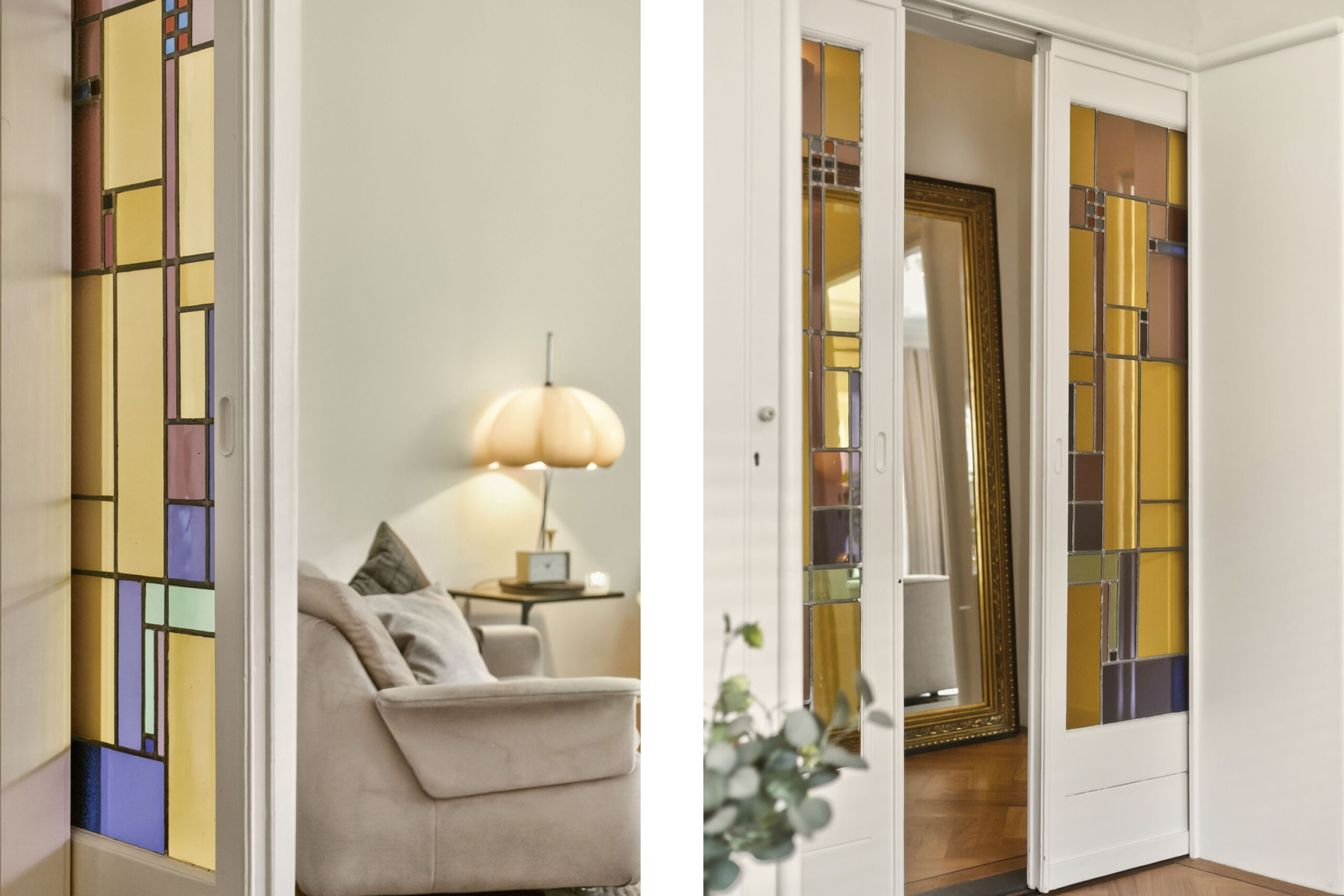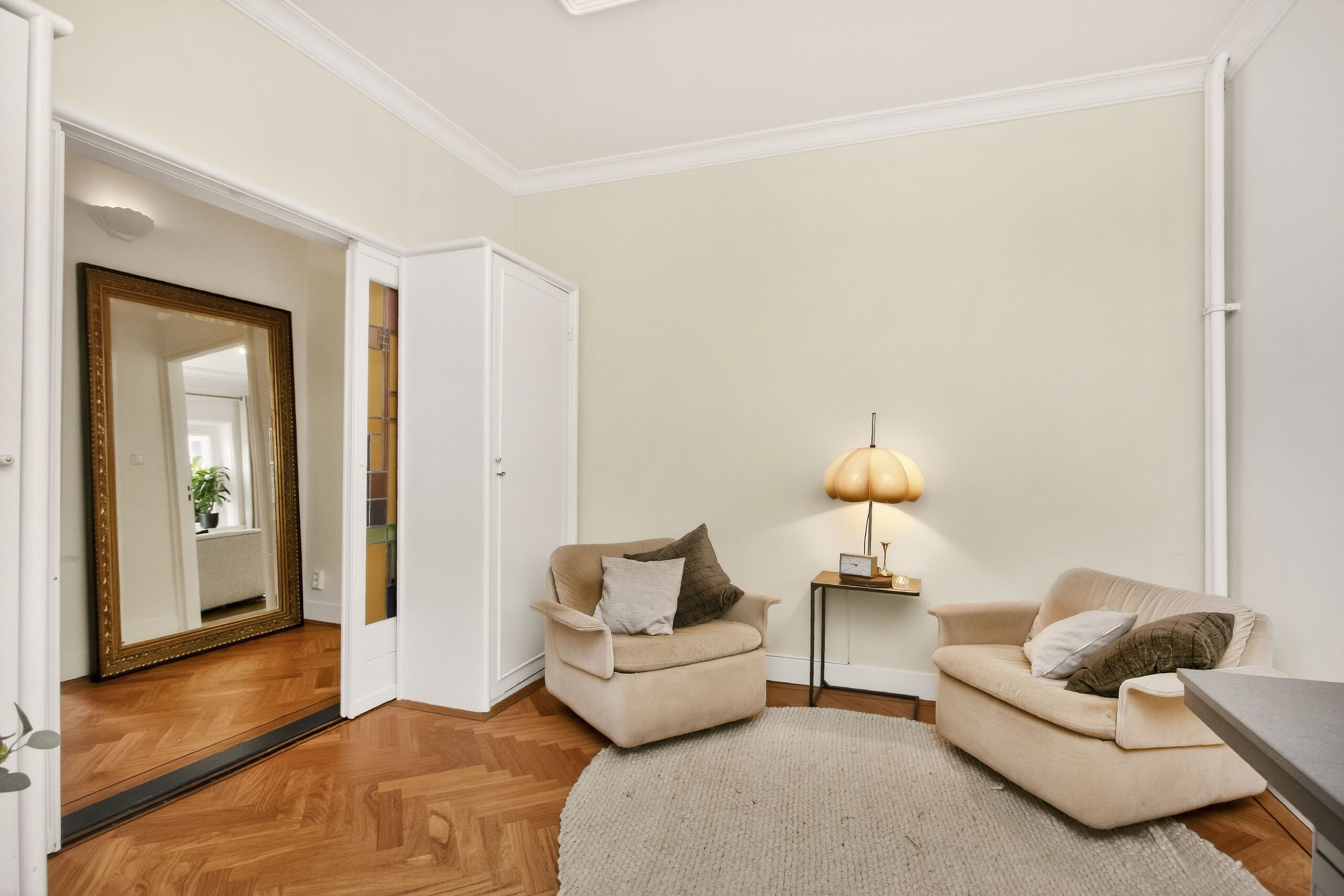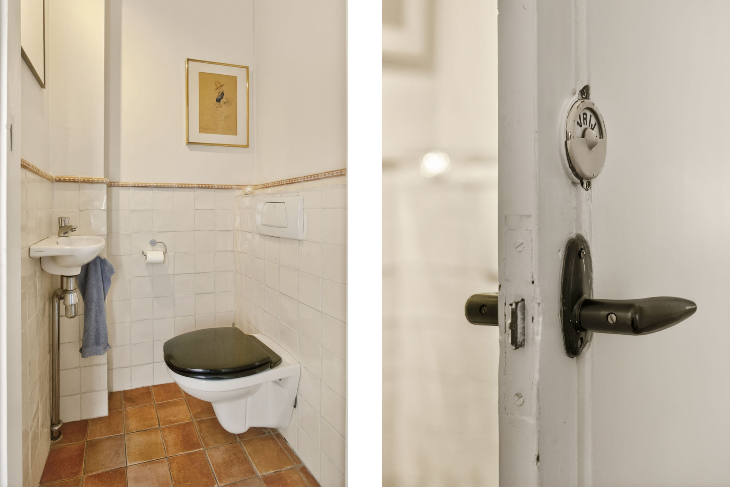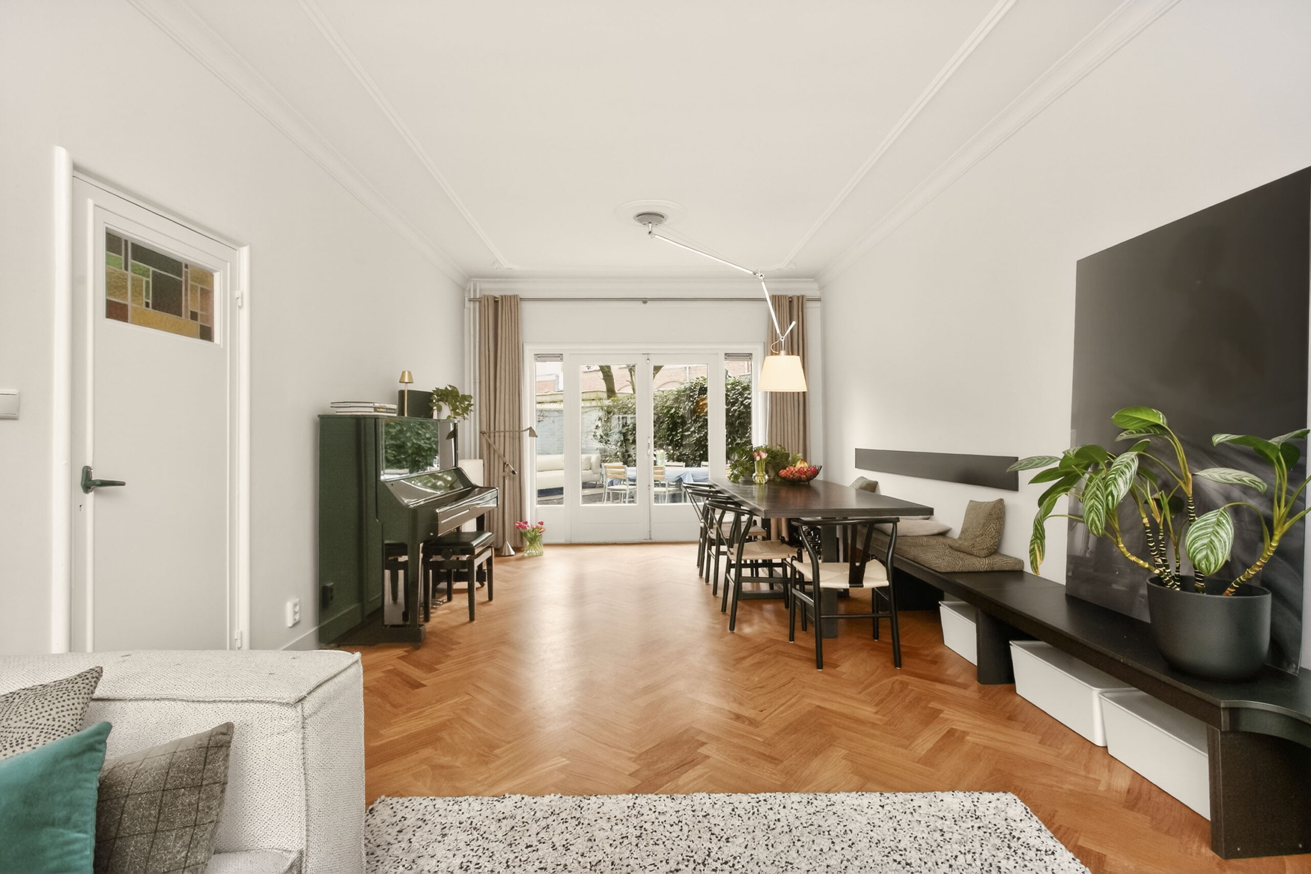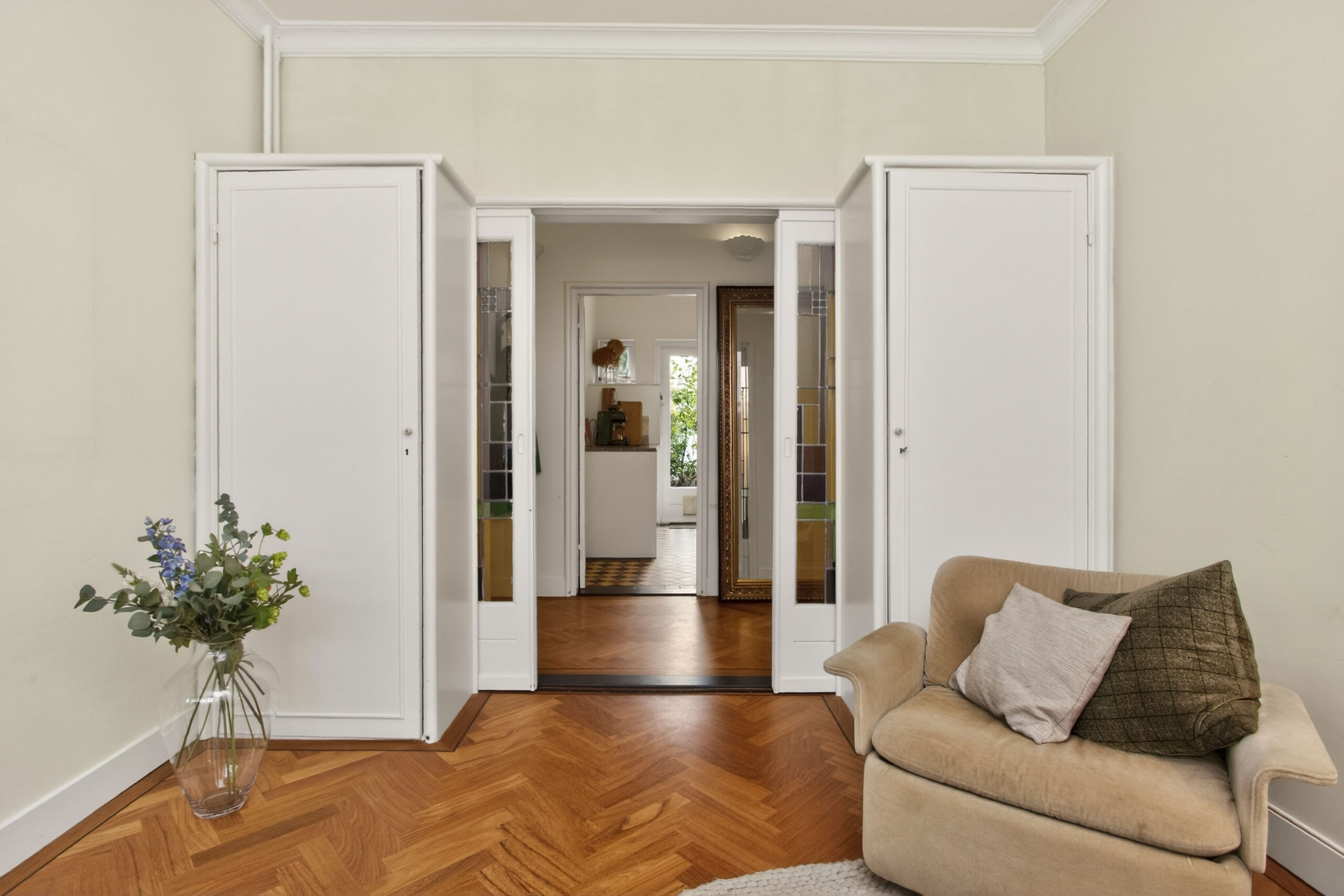 Centrale entree met sfeervolle hal. Entree naar de woning, in de hal valt meteen al op dat veel details optimaal bewaard zijn gebleven, stucplafonds met ornamenten en lijsten, visgraat parketvloer, paneeldeuren, en-suite deuren met glas-in-lood. Toilet met wandcloset en fontein.
