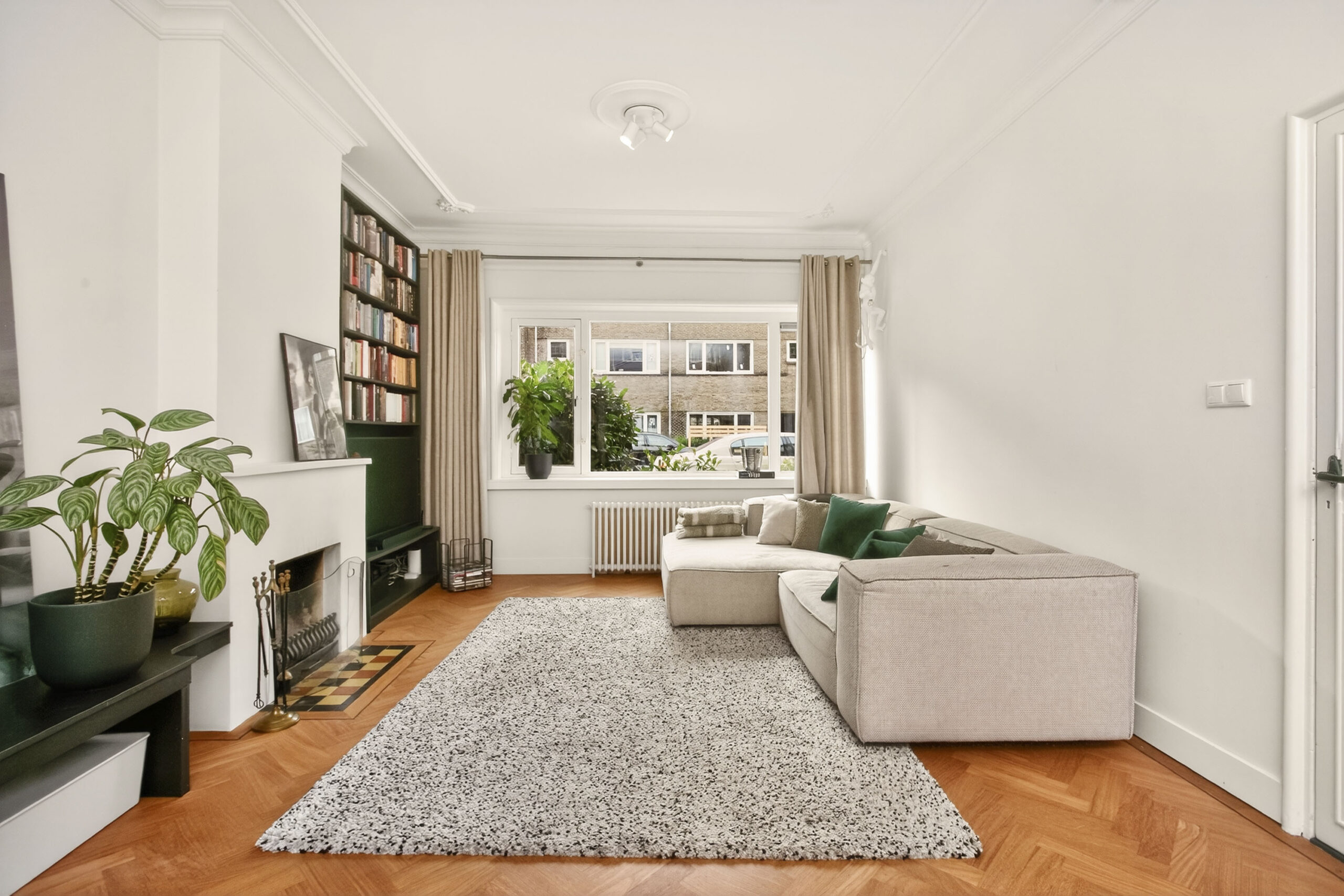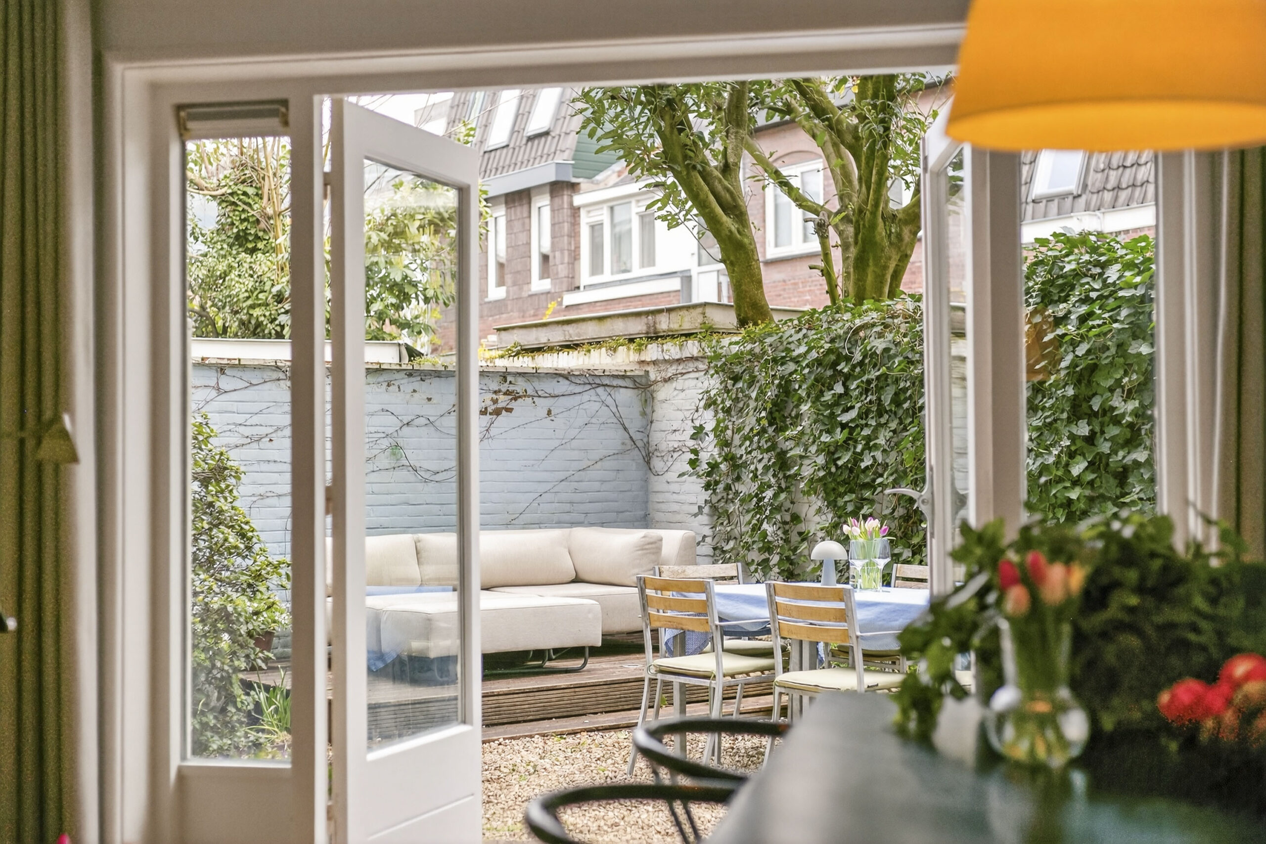 Riante, zeer lichte woonkamer met open haard, dubbele openslaande deuren naar de leuk aangelegde tuin met terrassen en verrassend veel groen.
