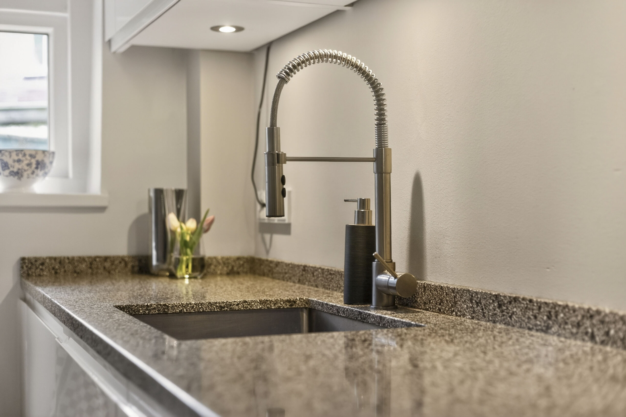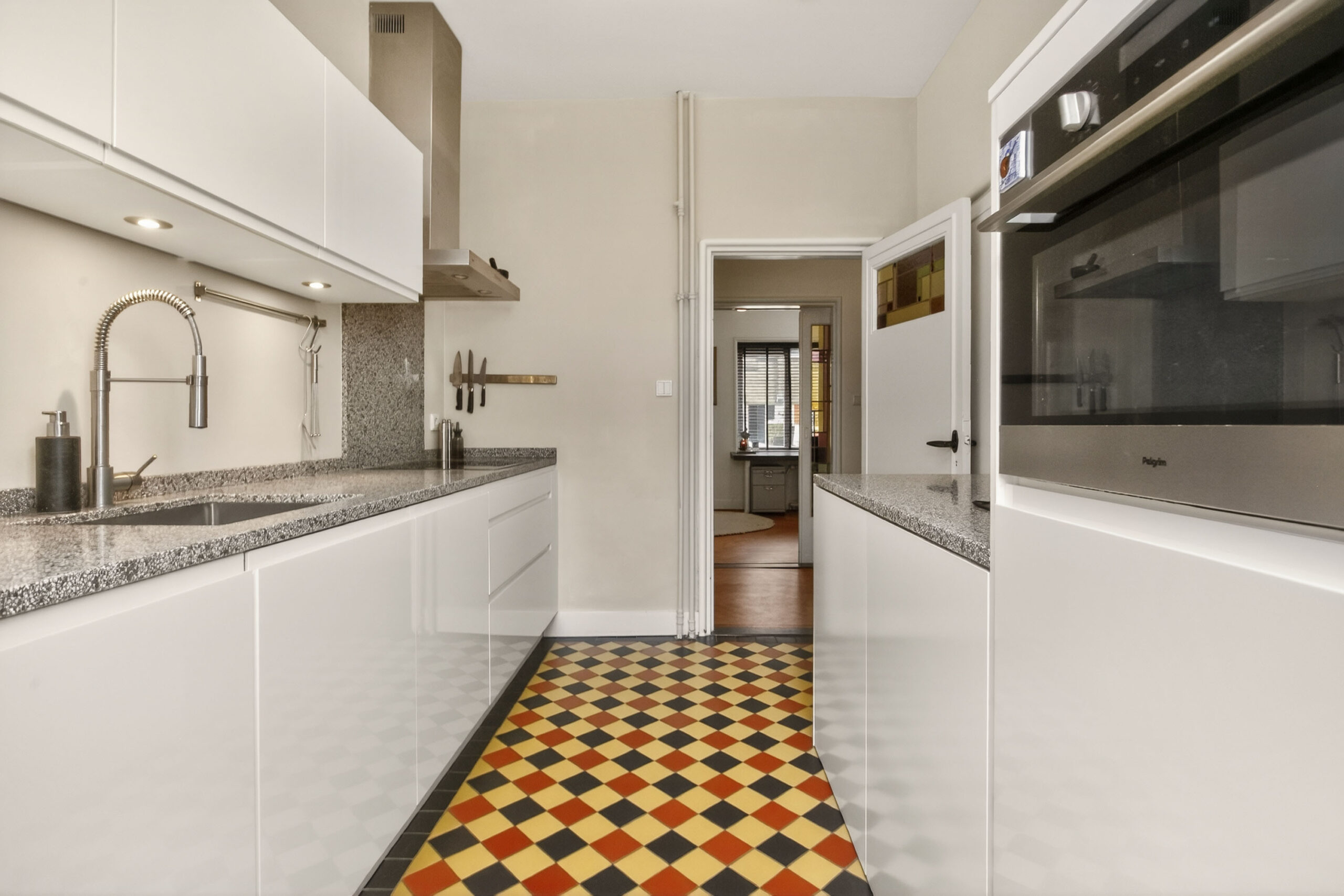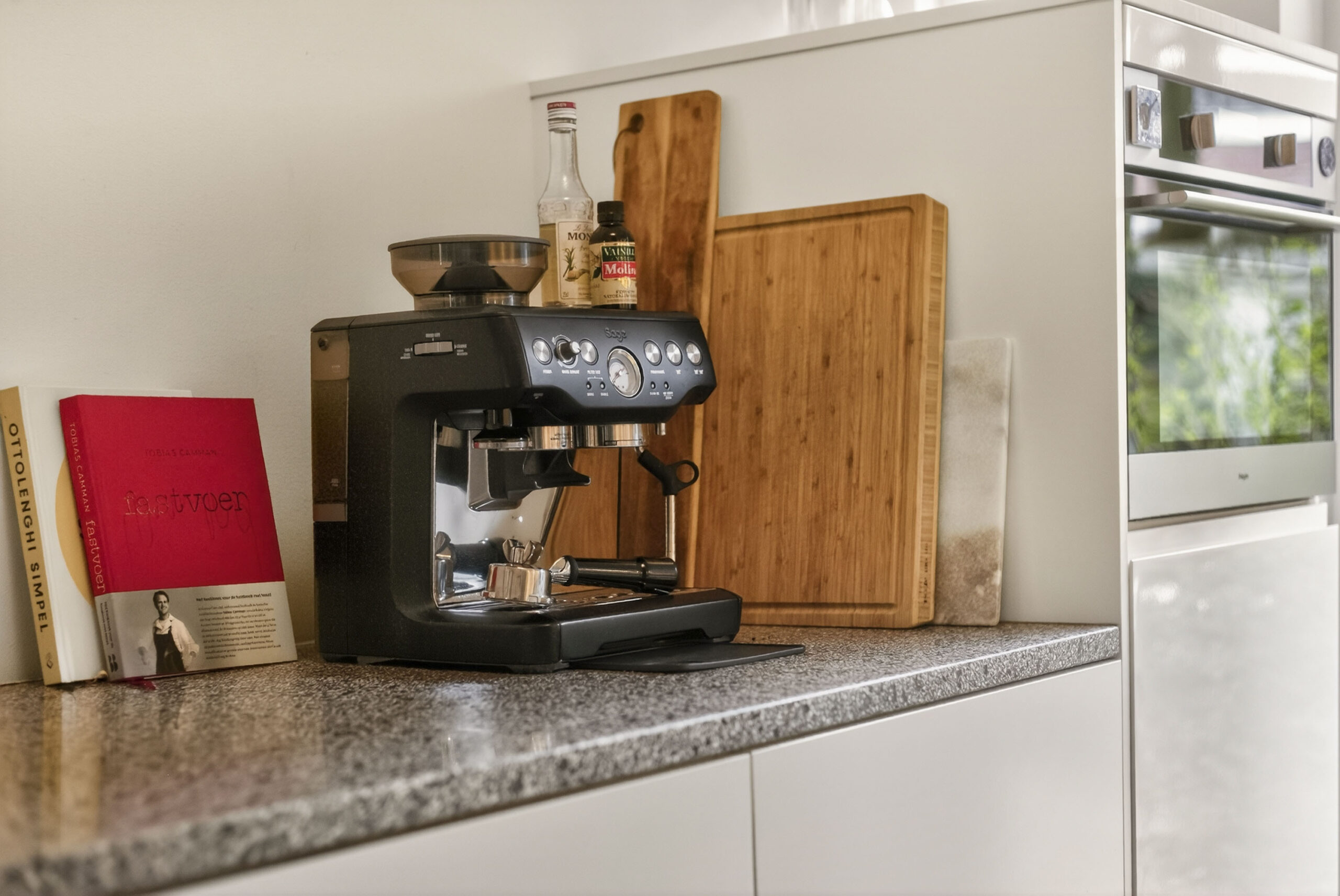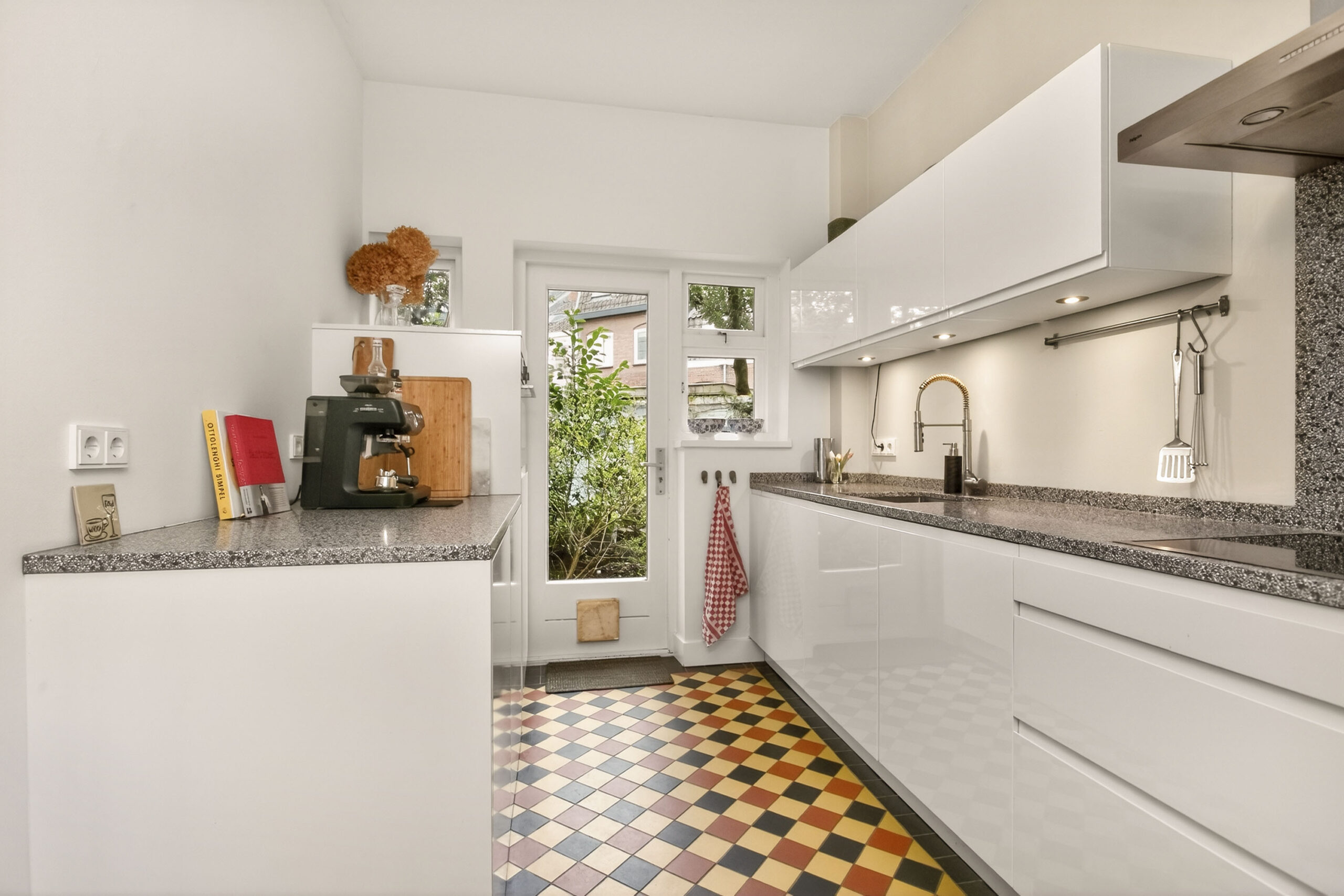 Dichte keuken met modern keukenblok en ingebouwde apparatuur, namelijk: inductiekookplaat, afzuigkap, oven, koelkast en vaatwasser, verder veel kastruimte en granito werkbladen.