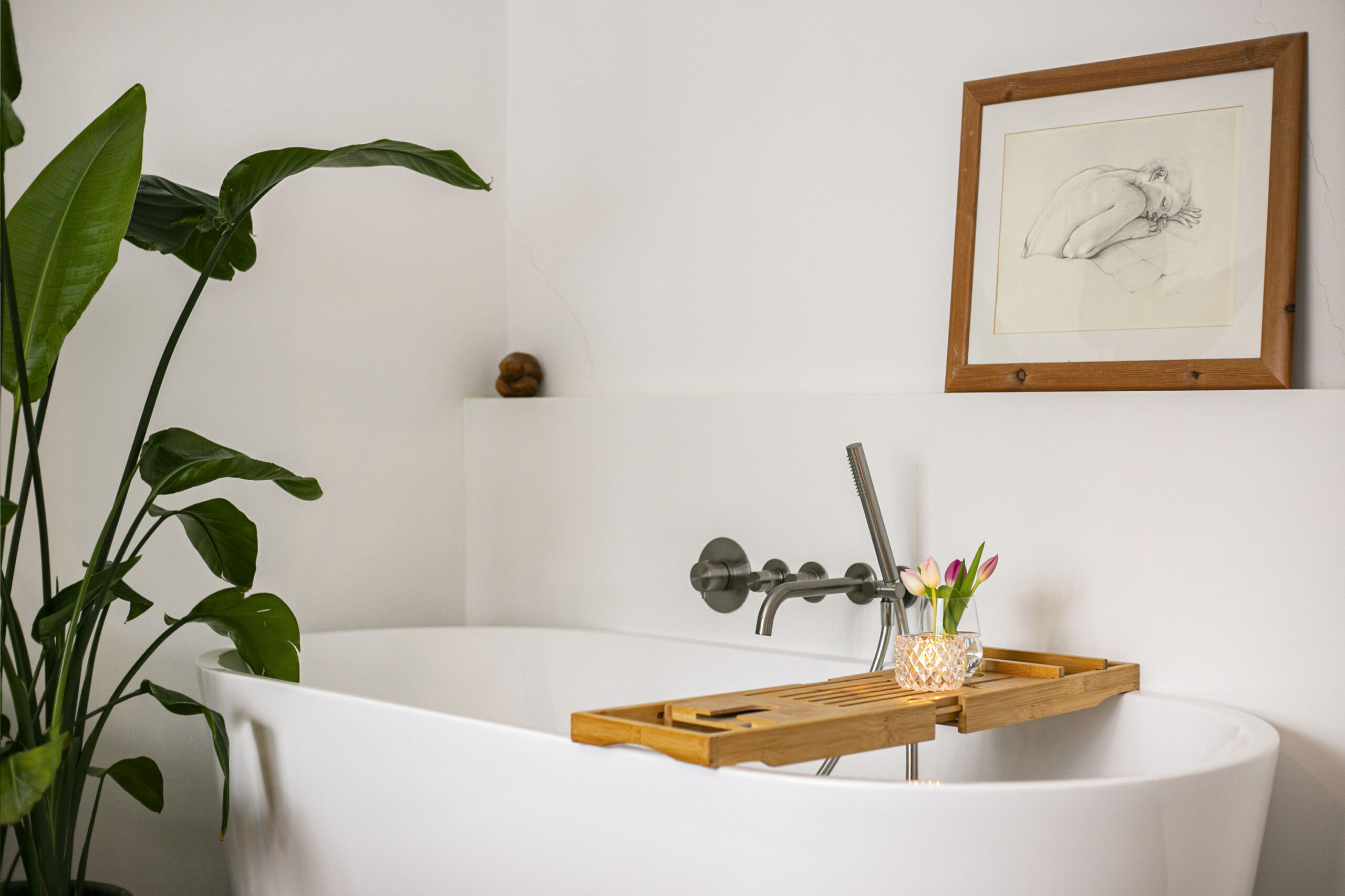 De in 2020 geheel vernieuwde badkamer is voorzien van moderne betegeling, inloopdouche met regen- en handdouche, dubbele wastafel met volledig geïntegreerde kranen. Alle kranen zijn in de kleur "gun metal".