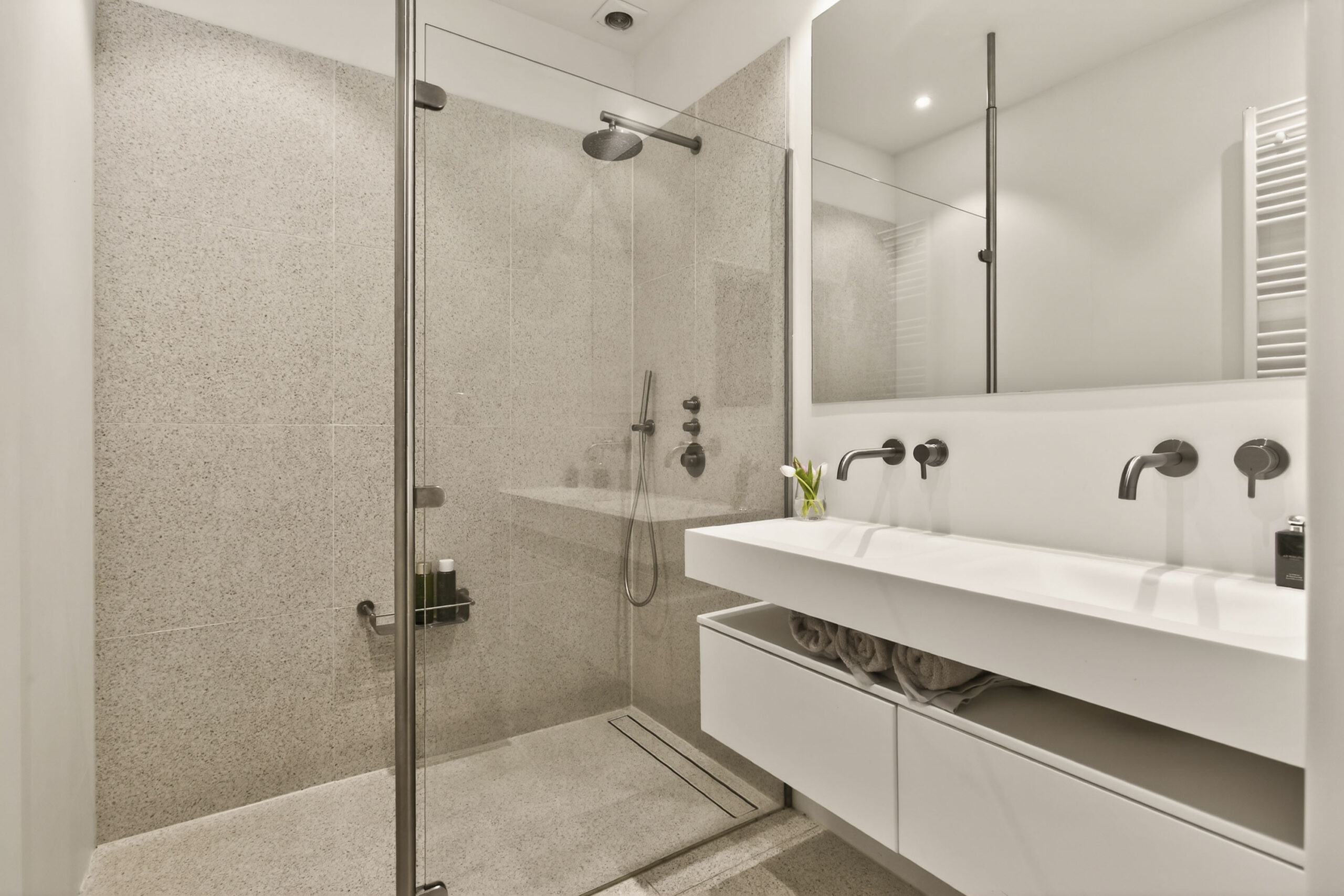 - Badkamervoorzieningen Dubbele wastafel, inloopdouche