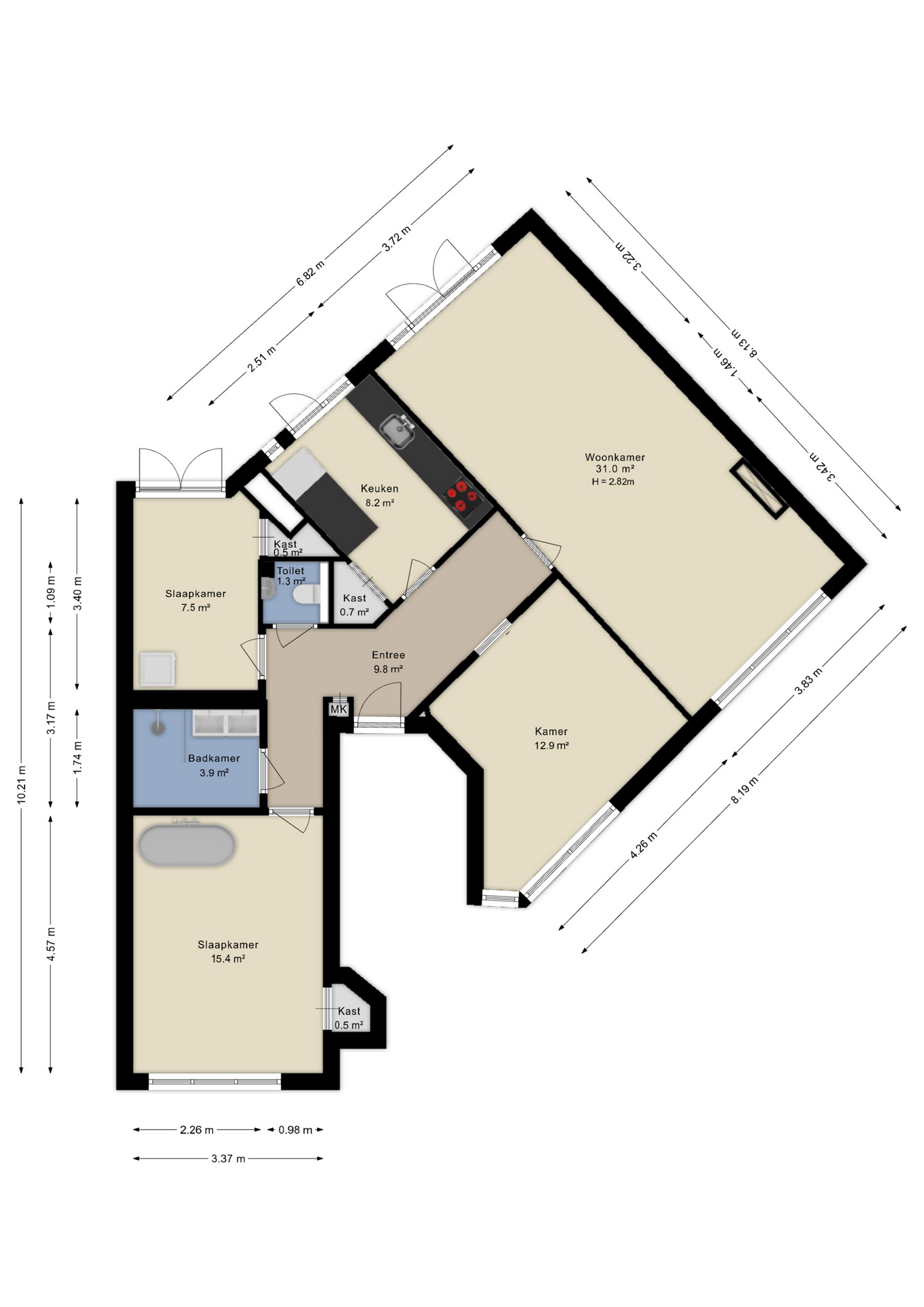 Het appartement heeft 3 slaapkamers. De hoofdslaapkamer beschikt over een ingebouwde kast en een vrijstaand ligbad. 1 slaapkamer heeft naast ingebouwde kastruimte ook een aansluiting voorwasmachine en droger.