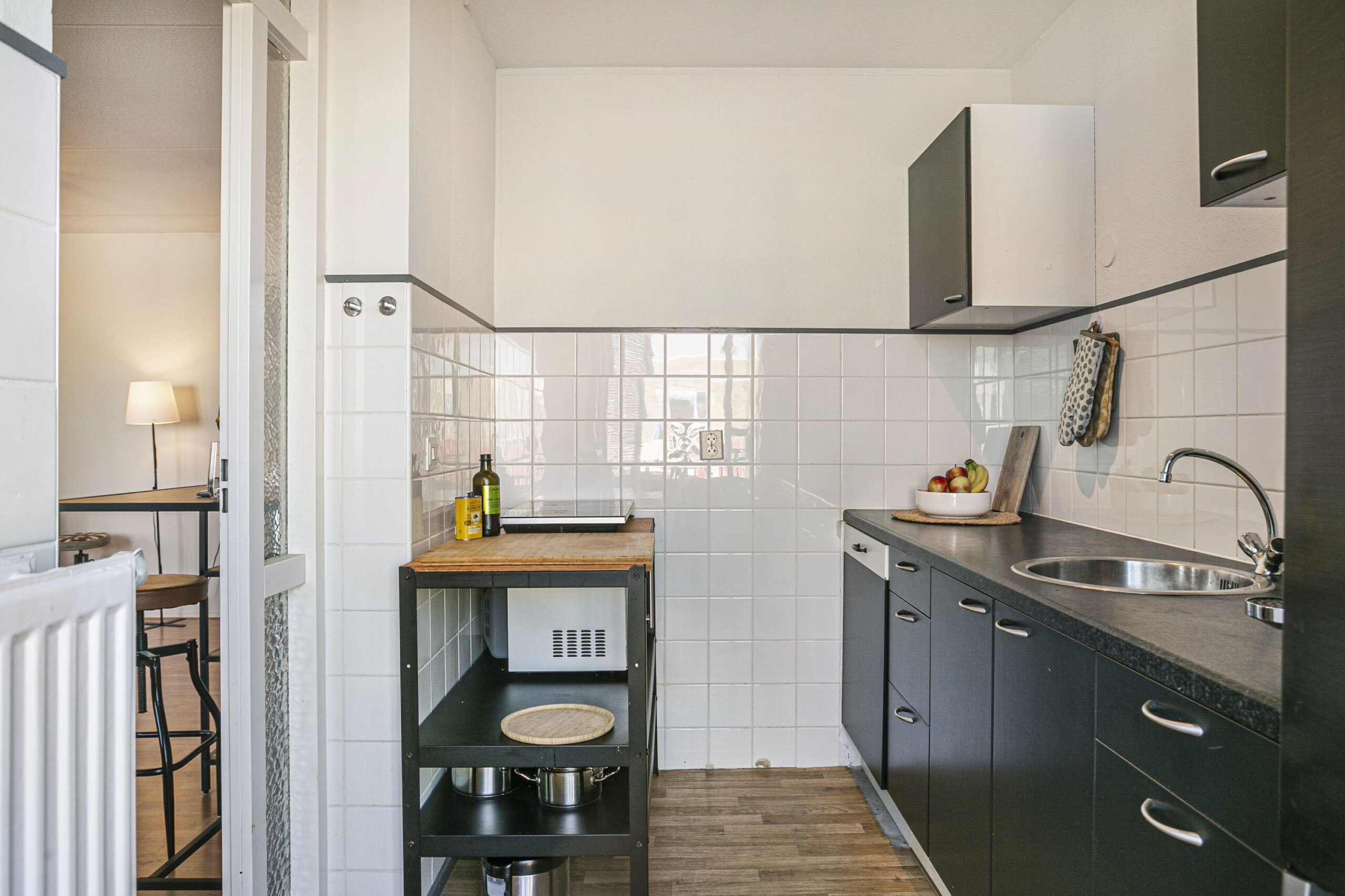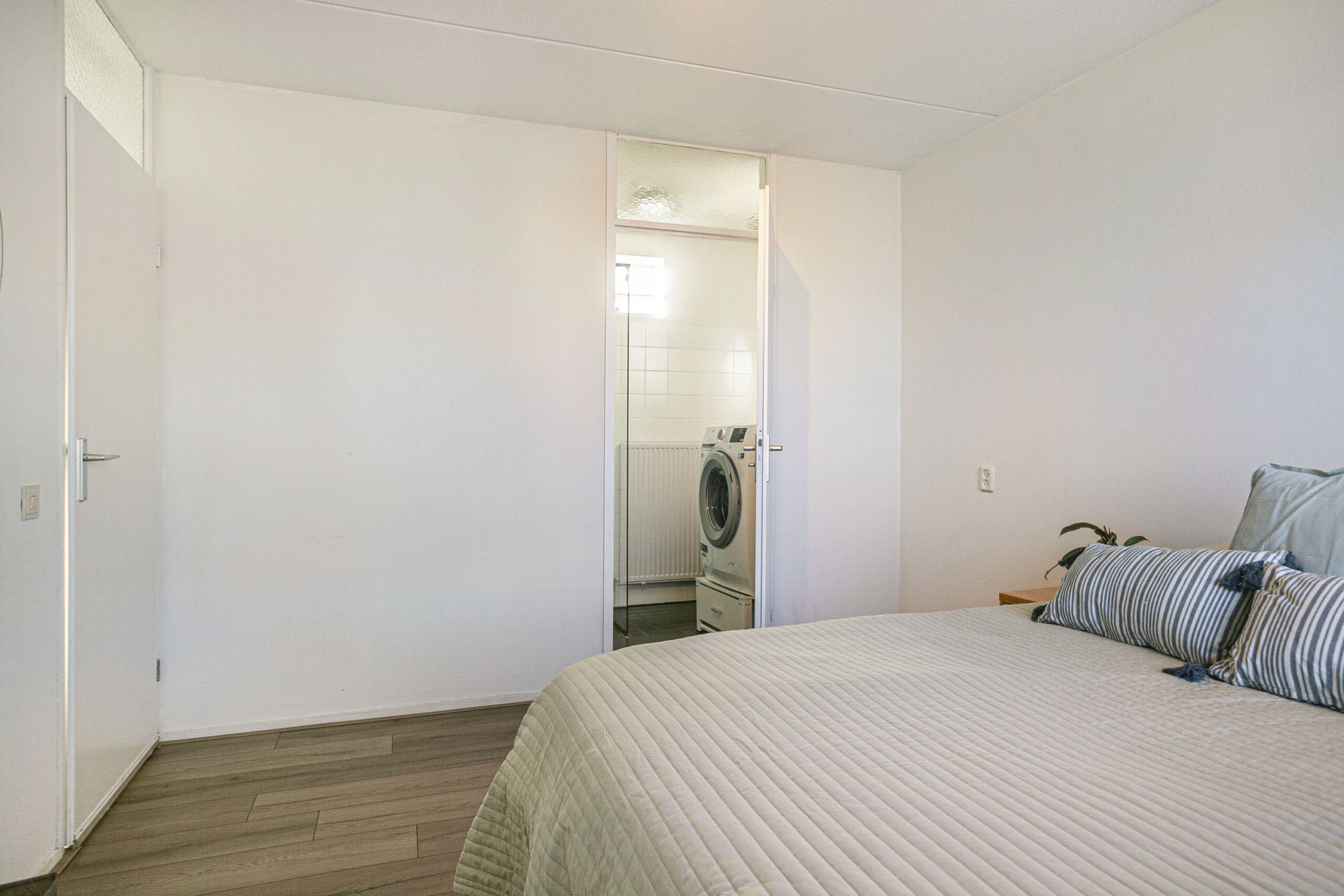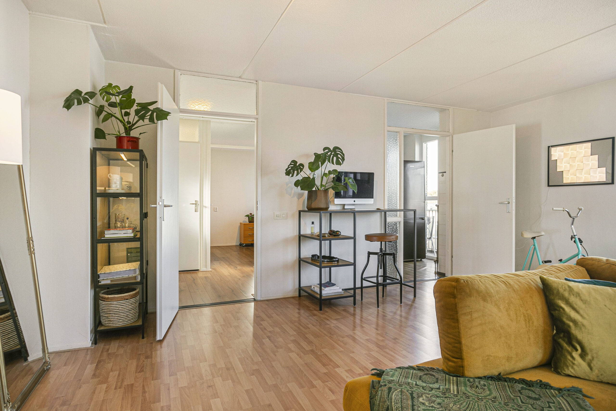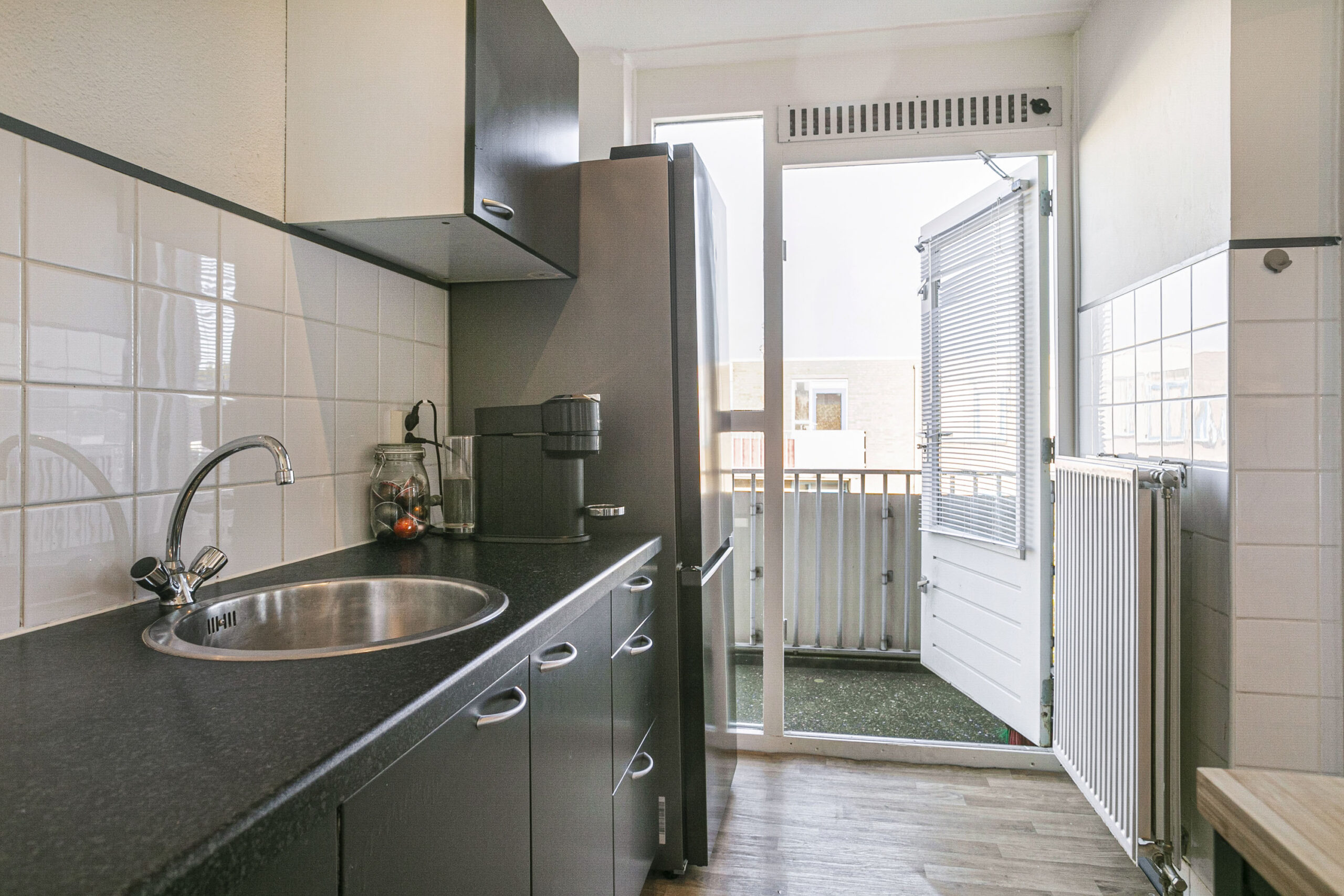 Via korte galerij is er toegang tot de woning. Hal met meterkast en bergkast met combiketel (Remeha HR, 2023), toilet met fontein. Ruime slaapkamer met laminaatvloer en aansluitend de badkamer. De badkamer is voorzien van inloopdouche, wastafelmeubel en wasmachine aansluiting. Royale woonkamer met fraai uitzicht over de wijk, laminaatvloeren, lichte wanden en plafonds en aansluitend zit de dichte keuken. Keuken met eenvoudige maar nette keukenopstelling met vaatwasser en koel/vriescombinatie (2022). Vanuit de keuken is het balkon (op het noordwesten) te bereiken.