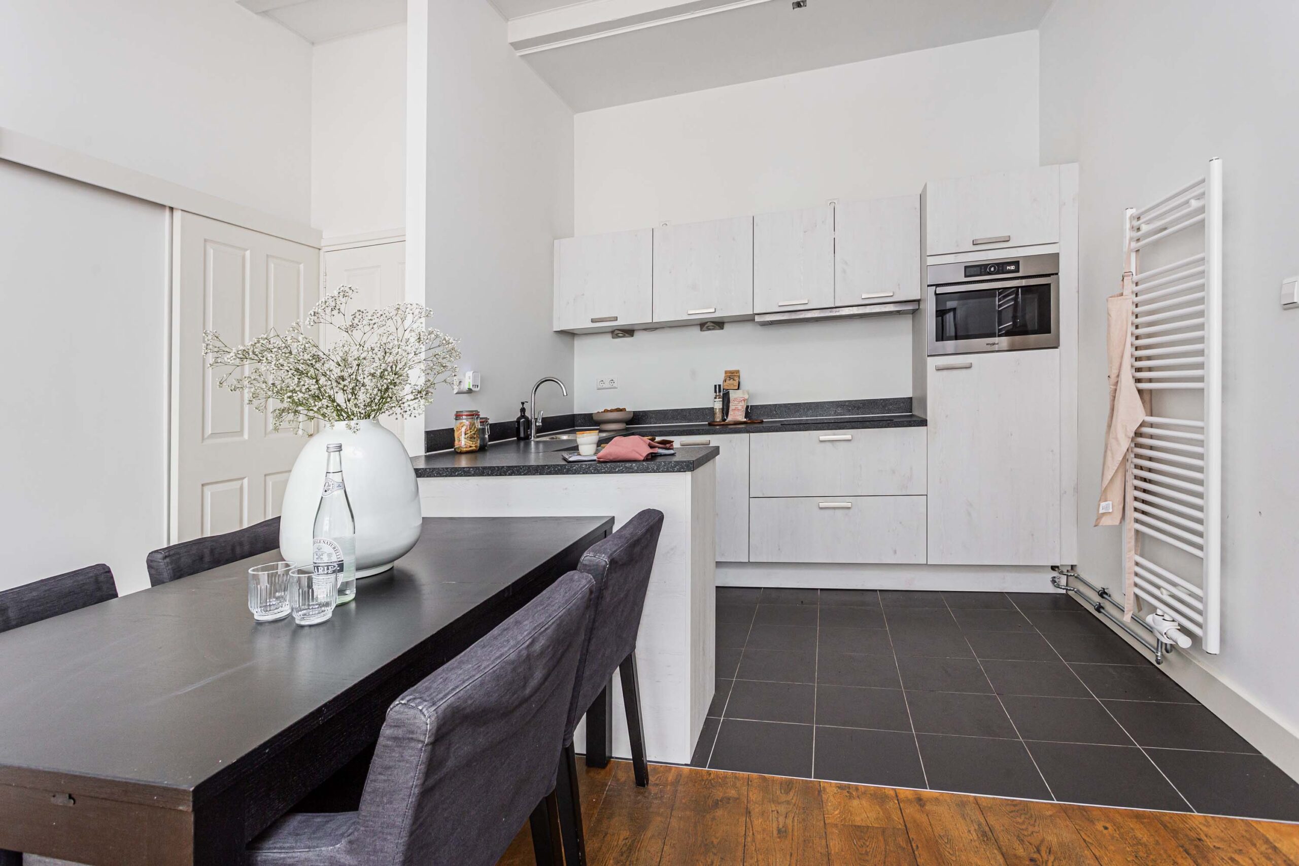Entree, hal, royale woonkamer met open keuken. De woonkamer heeft grote raampartijen trapopgang naar verdieping, plankenvloer en sfeervolle houtkachel. De open keuken is recentelijk vernieuwd en voorzien van alle inbouwapparatuur, zoals een inductie kookplaat, combimagnetron/oven, afzuigkap, koelkast en vaatwasser. In de bergkast zit naast de combiketel ook de aansluitingen voor wasmachine en droger. Portaal met toilet (moderne betegeling en wandcloset) en trap naar de kelder toe. Alle wanden zijn voorzien van glad stucwerk en de plafonds zijn nog voorzien van de originele balken.