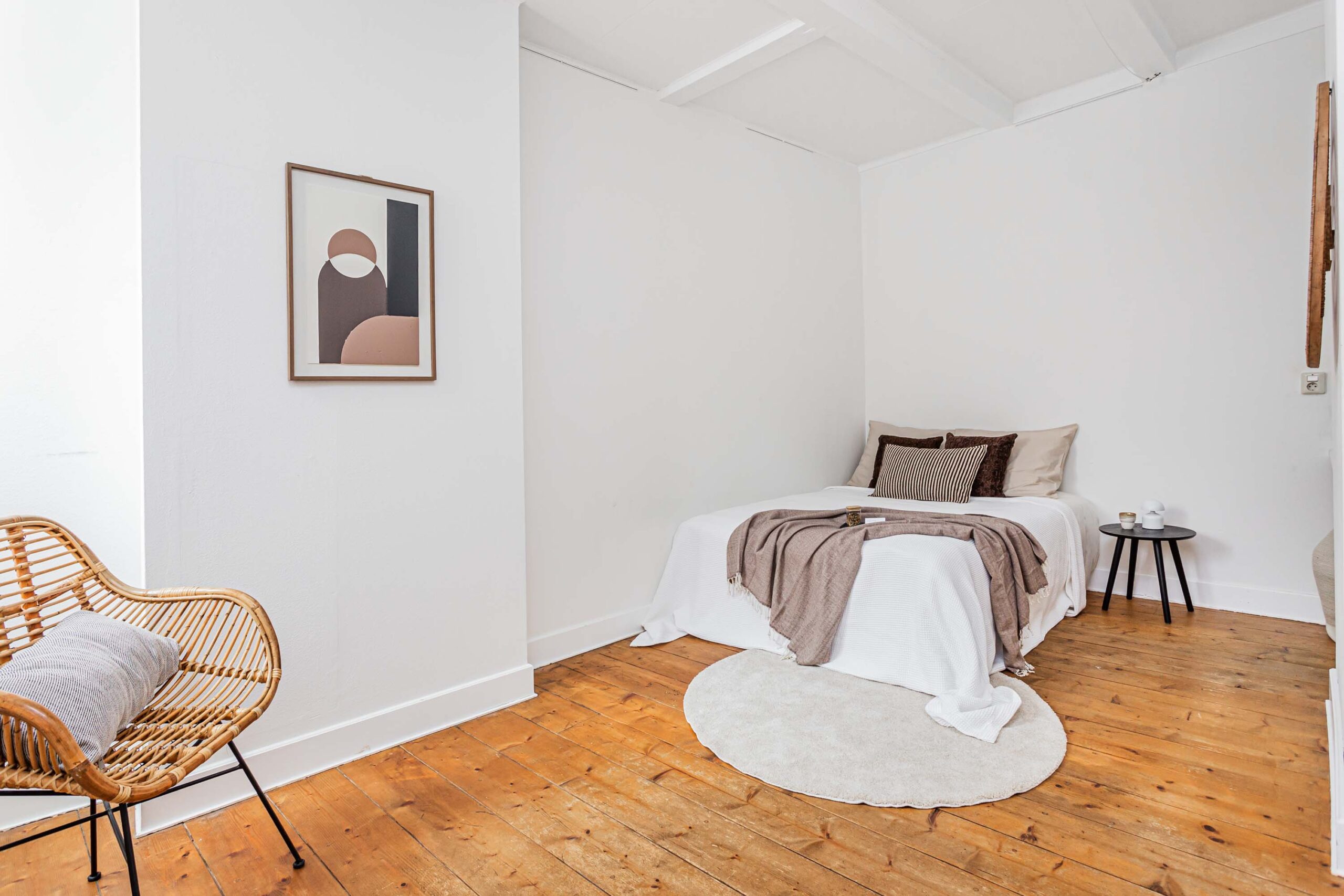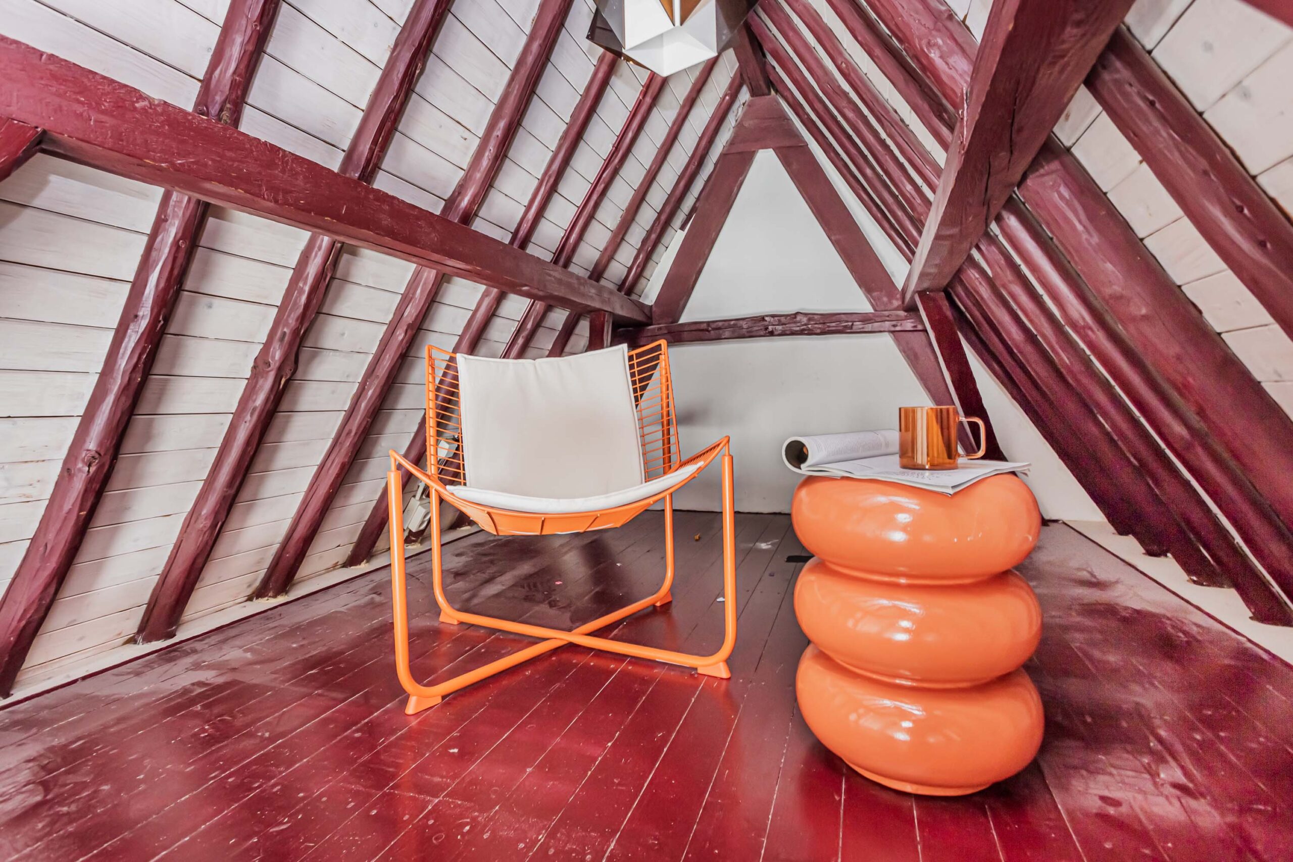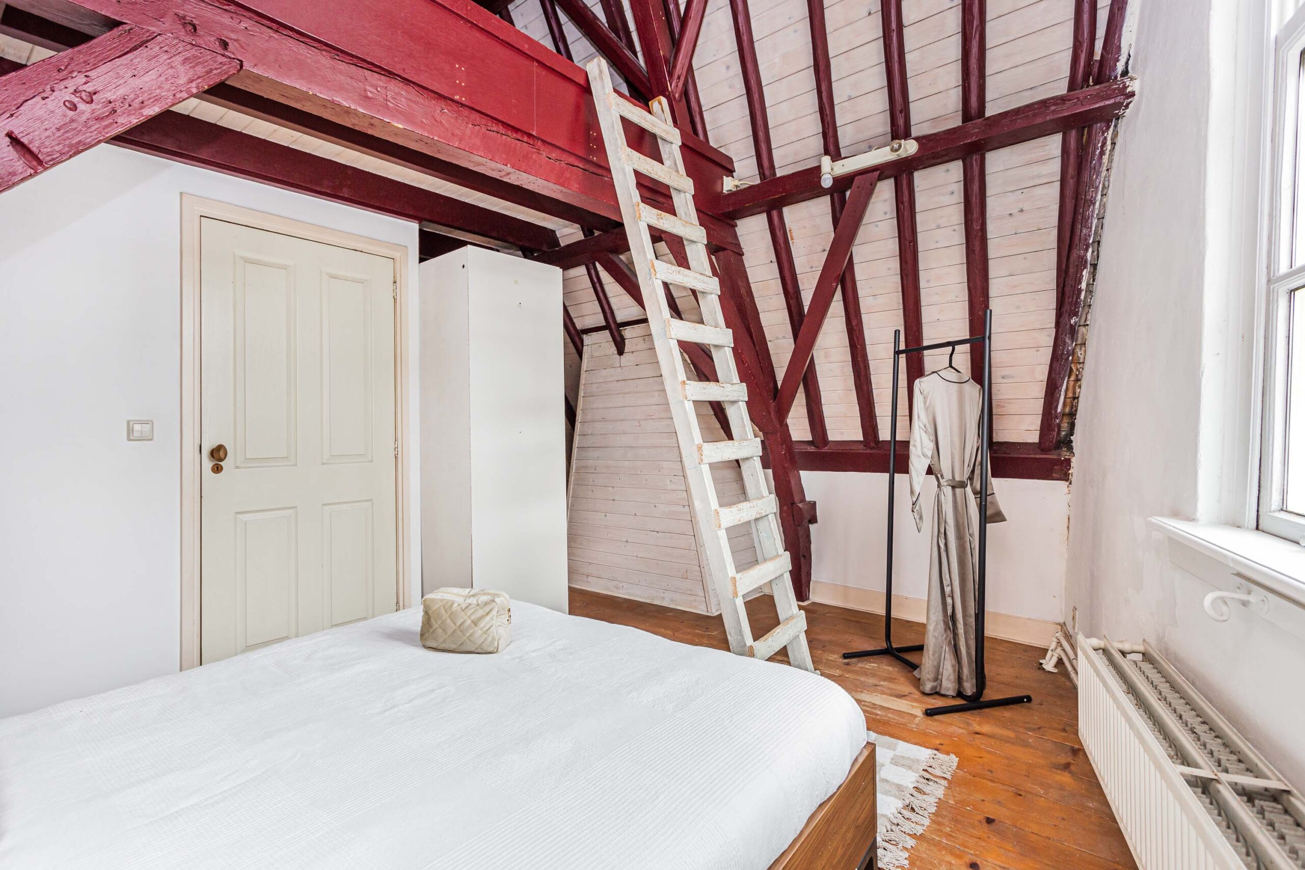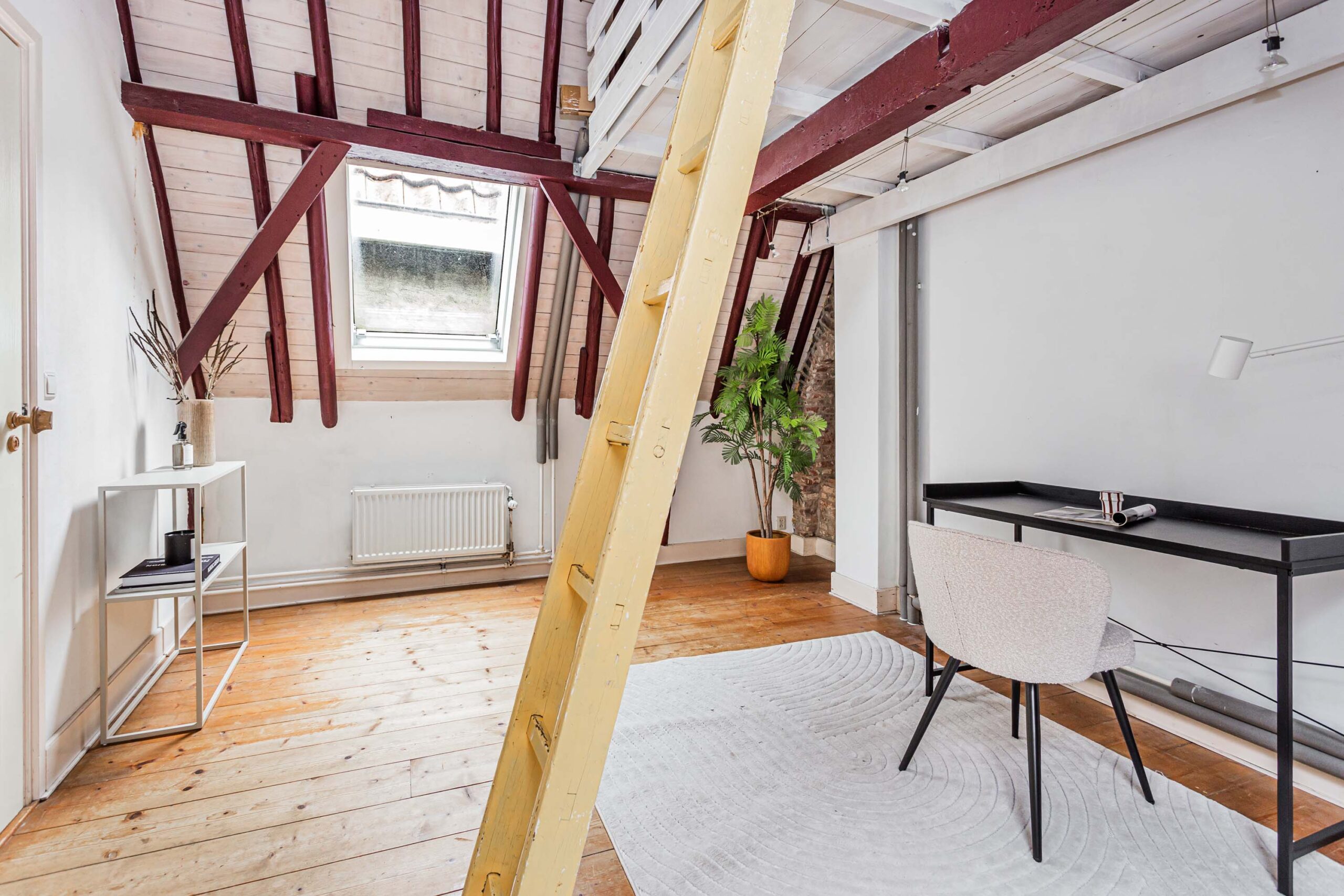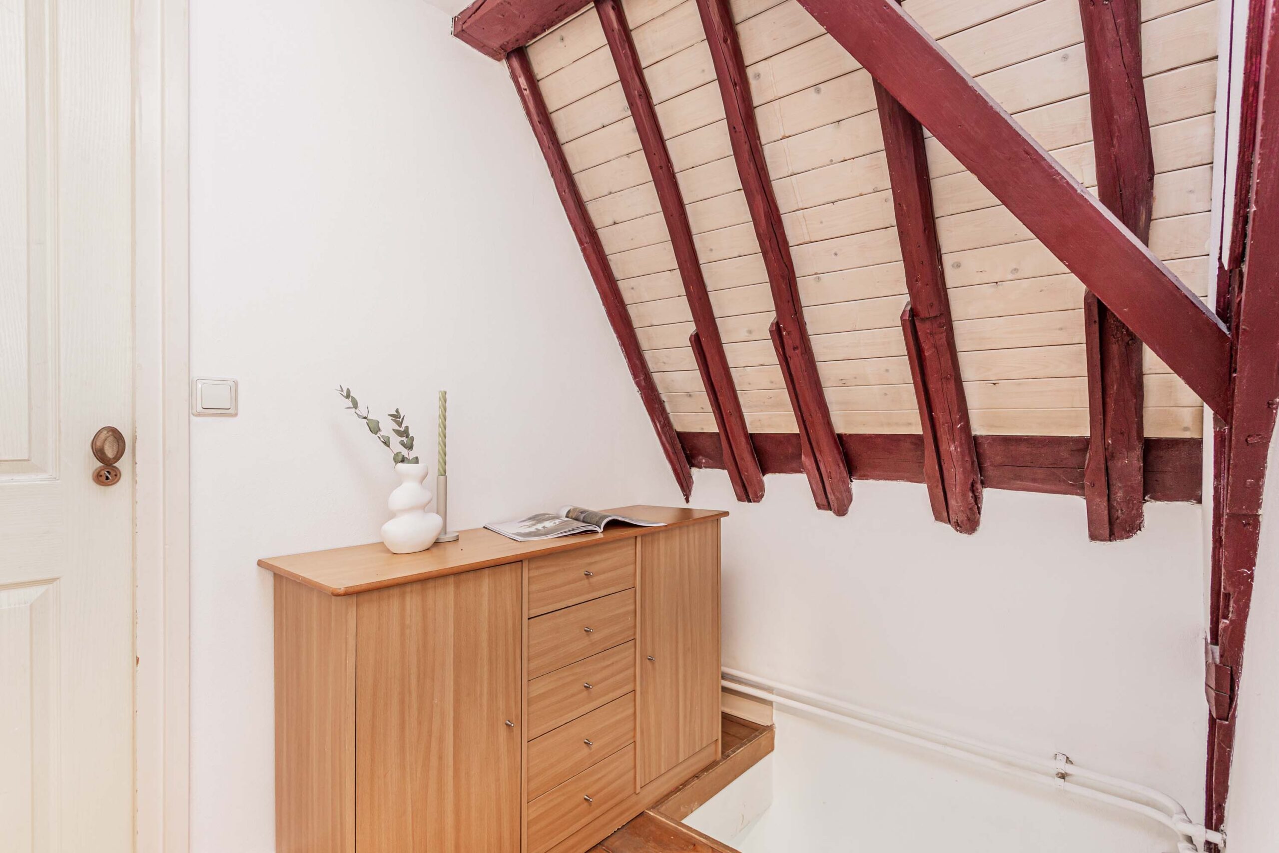Overloop, sfeervolle voorkamer met entresol en fraai zicht op de kapconstructie, lichte achterkamer met entresol, wastafel en twee Velux-ramen.