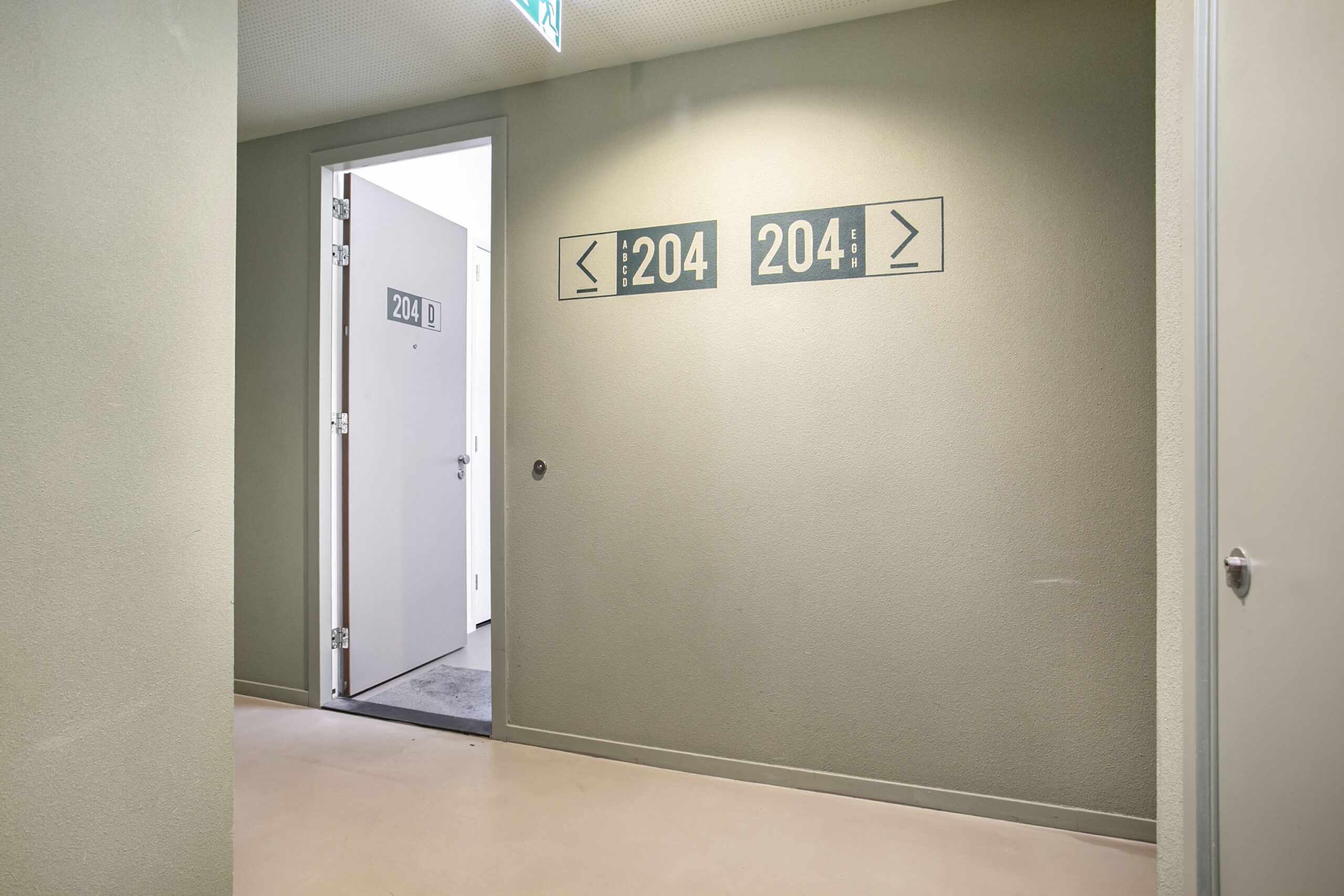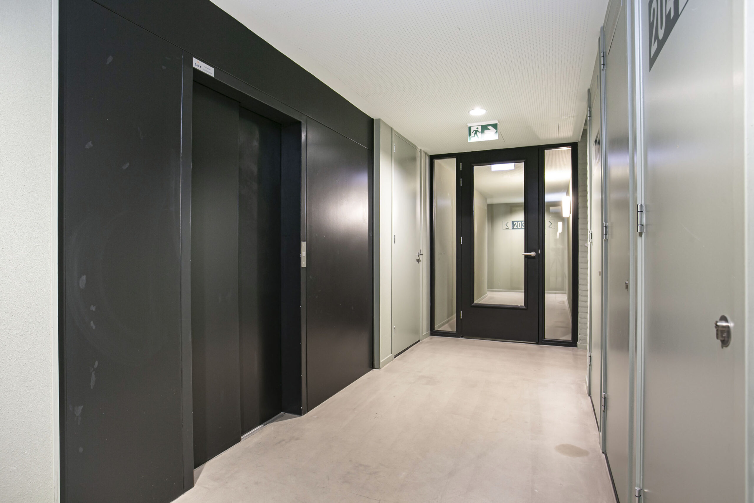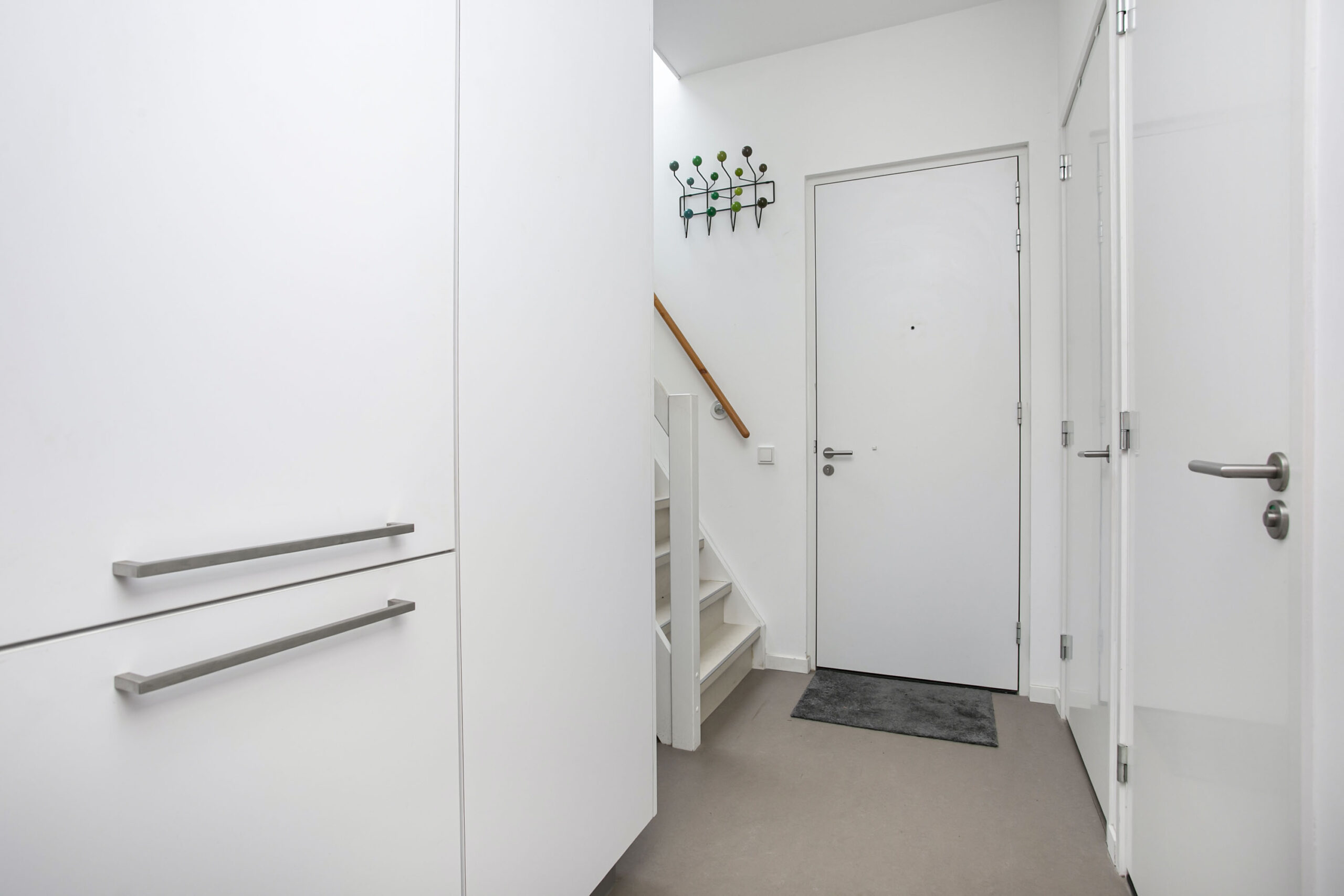 Entree tot de woning met de trap naar het dakterras, het slaapgedeelte met ingebouwde kledingkasten. Volledig betegelde badkamer met inloopdouche, wastafel en toilet (wandcloset). Kast met daarin aansluiting wasmachine, c.v.-ketel en mechanische ventilatie. Heerlijk lichte en ruime living met open, luxe keuken voorzien van veel bergruimte, groot werkblad en alle inbouwapparatuur: kookplaat, combimagnetron, afzuigkap, koelkast en vaatwasser. In het gehele appartement is een moderne grijze vloerafwerking toegepast en zijn zowel de wanden als plafonds van glad stucwerk voorzien.
