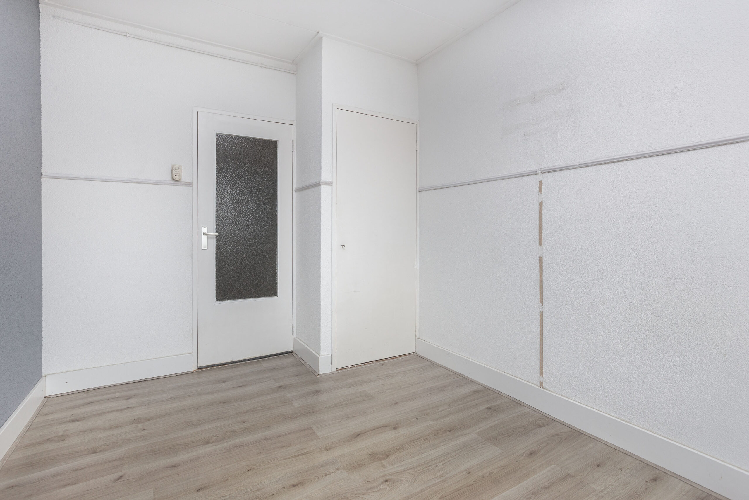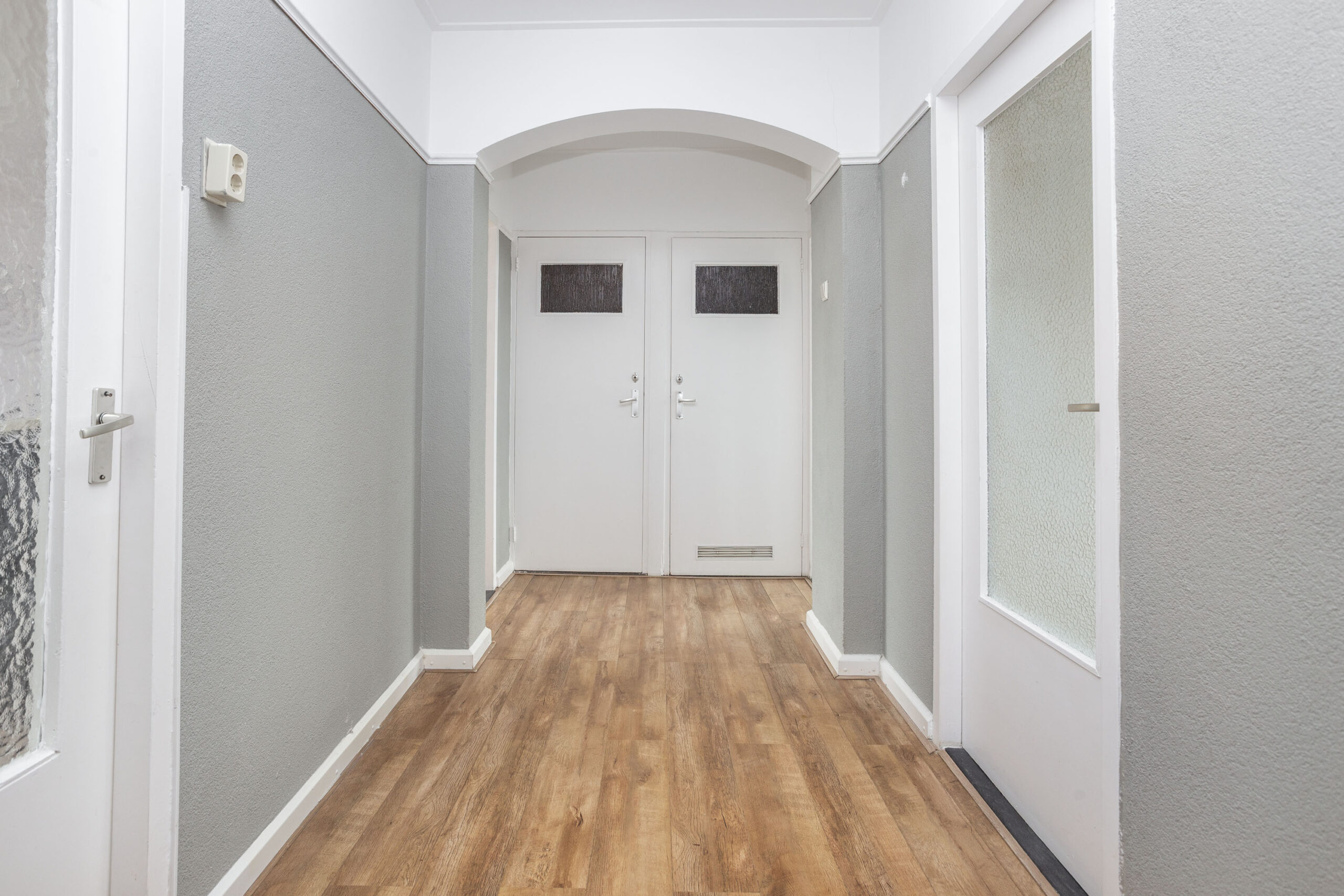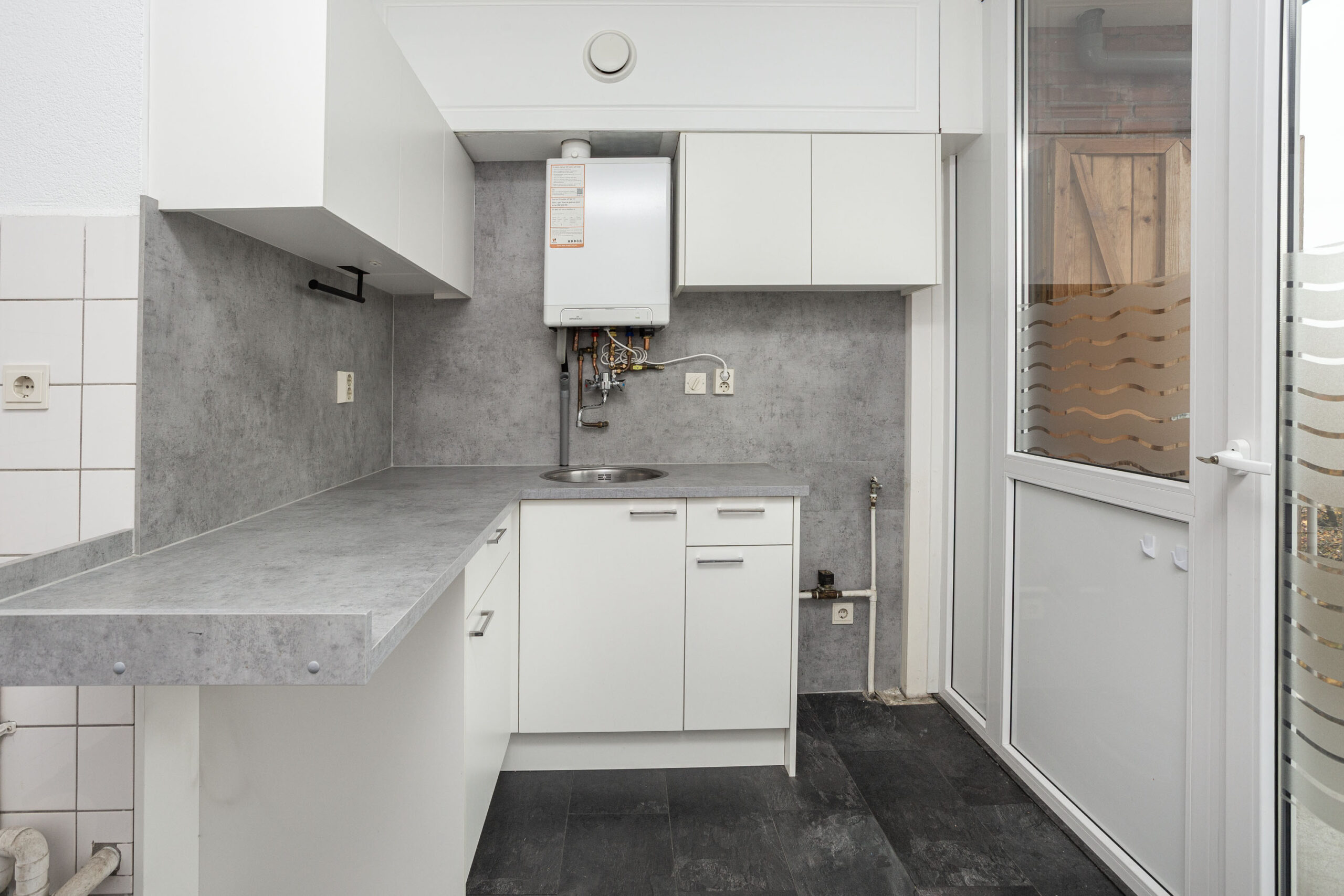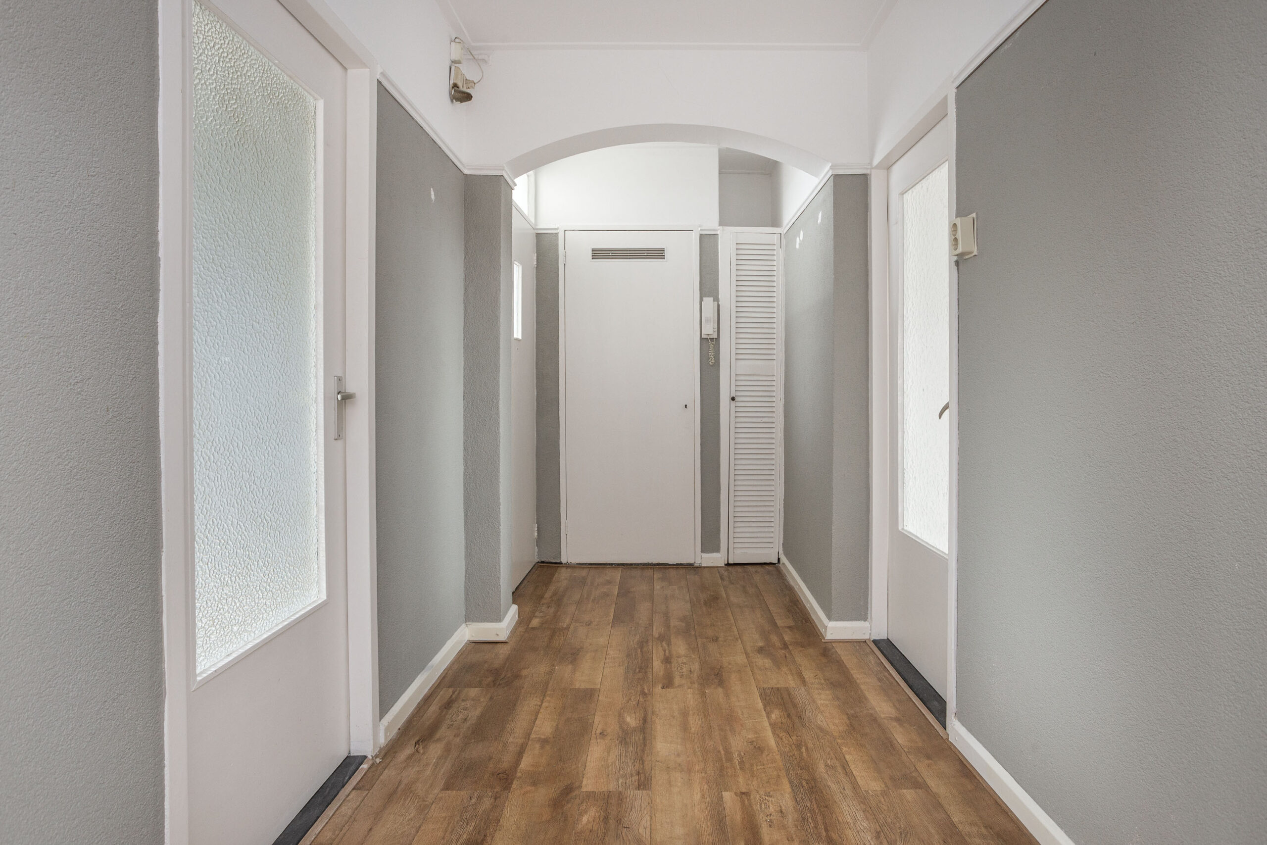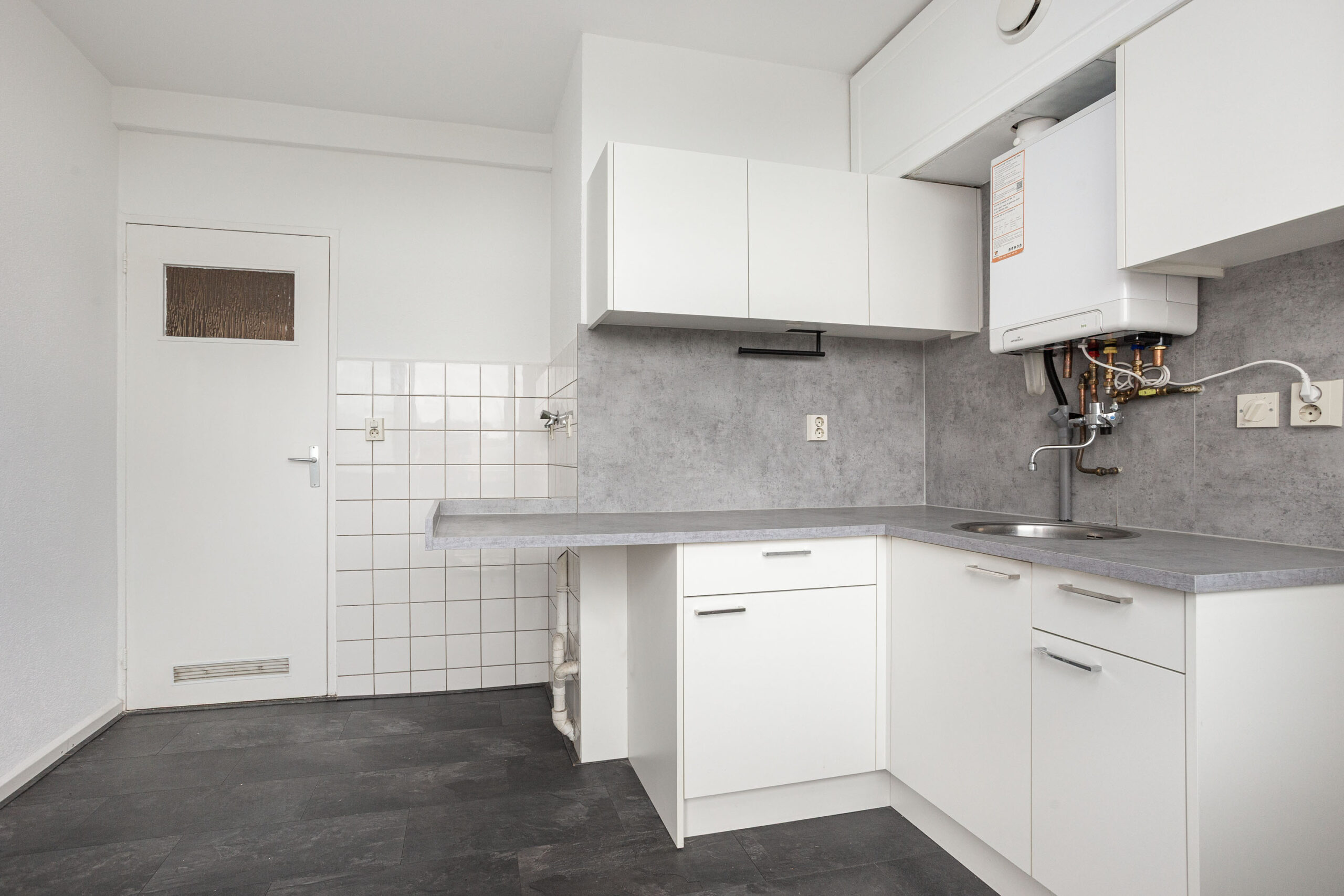 Entree/hal met meterkast. Ruime woonkamer voorzien van een gashaard, een separate keuken met eenvoudig keukenblok, warmwatervoorziening d.m.v. een ketel (eigendom) en de aansluiting voor de wasmachine. Toegang tot het balkon aan de voorzijde van het appartement. Terug naar de hal tref je de toiletruimte, badkamer met inloopdouche en wastafel en twee slaapkamers. De slaapkamer aan de achterzijde biedt toegang tot het 2e balkon. Eigen berging in de onderbouw aanwezig.