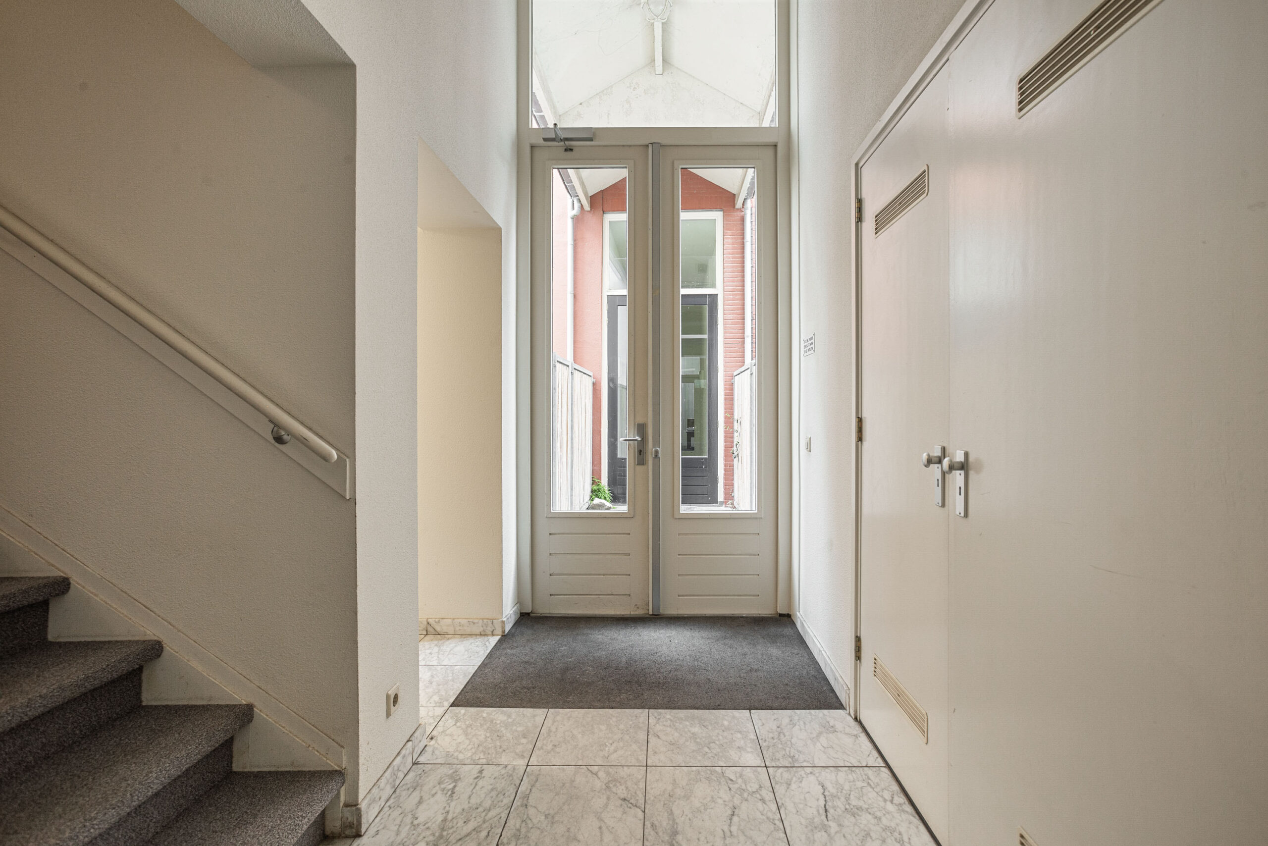 Begane grond: Imposante afgesloten entree in het voorhuis met zeer fraai barok stucwerk. Via de passage kom je in het achterhuis.