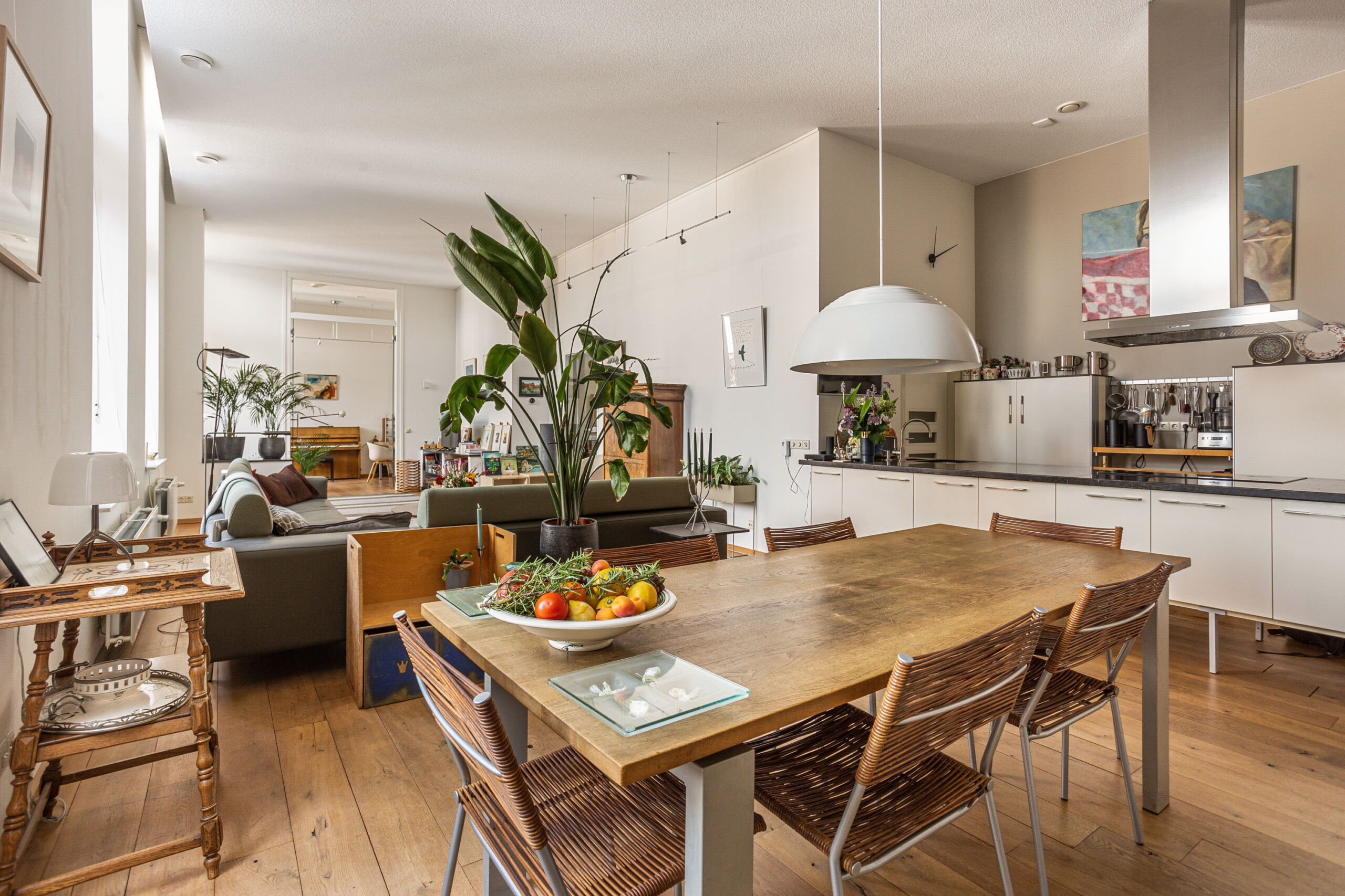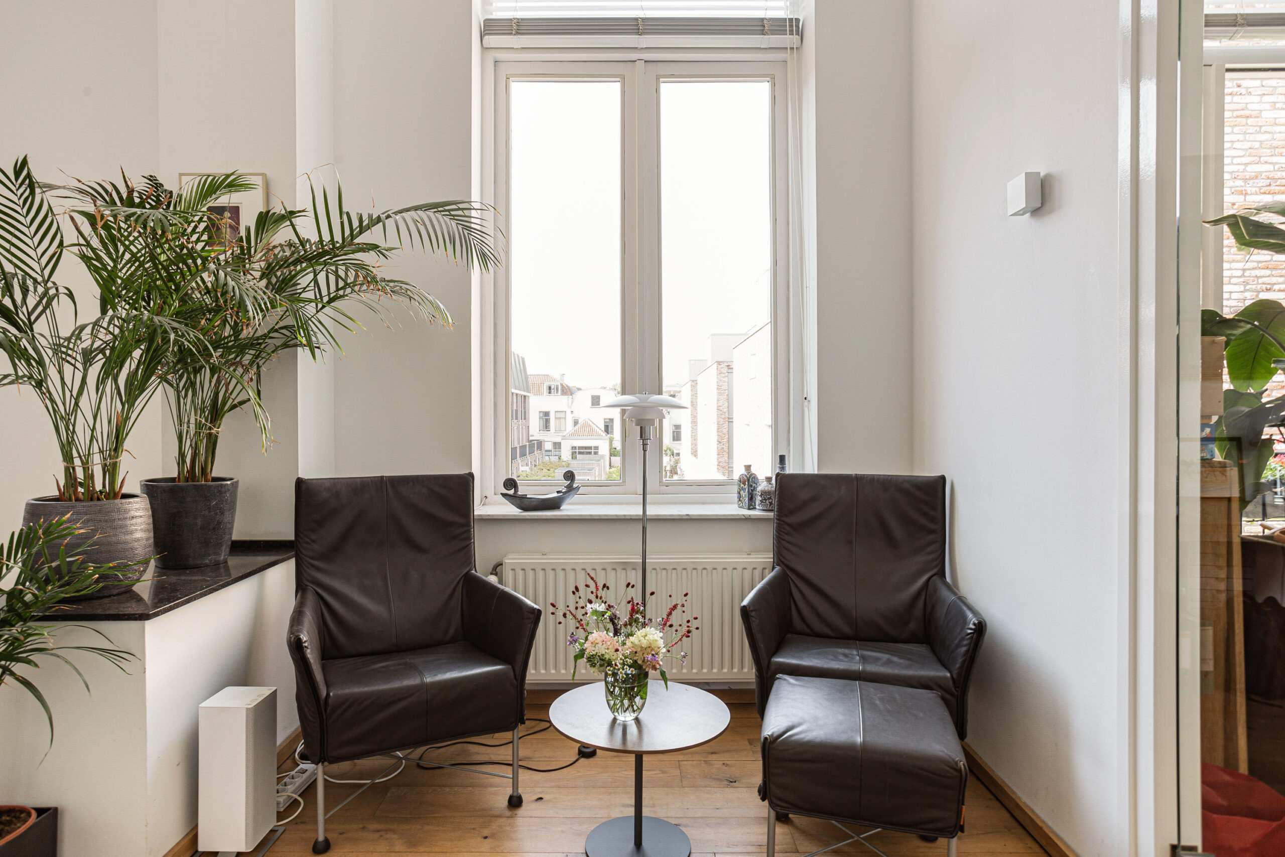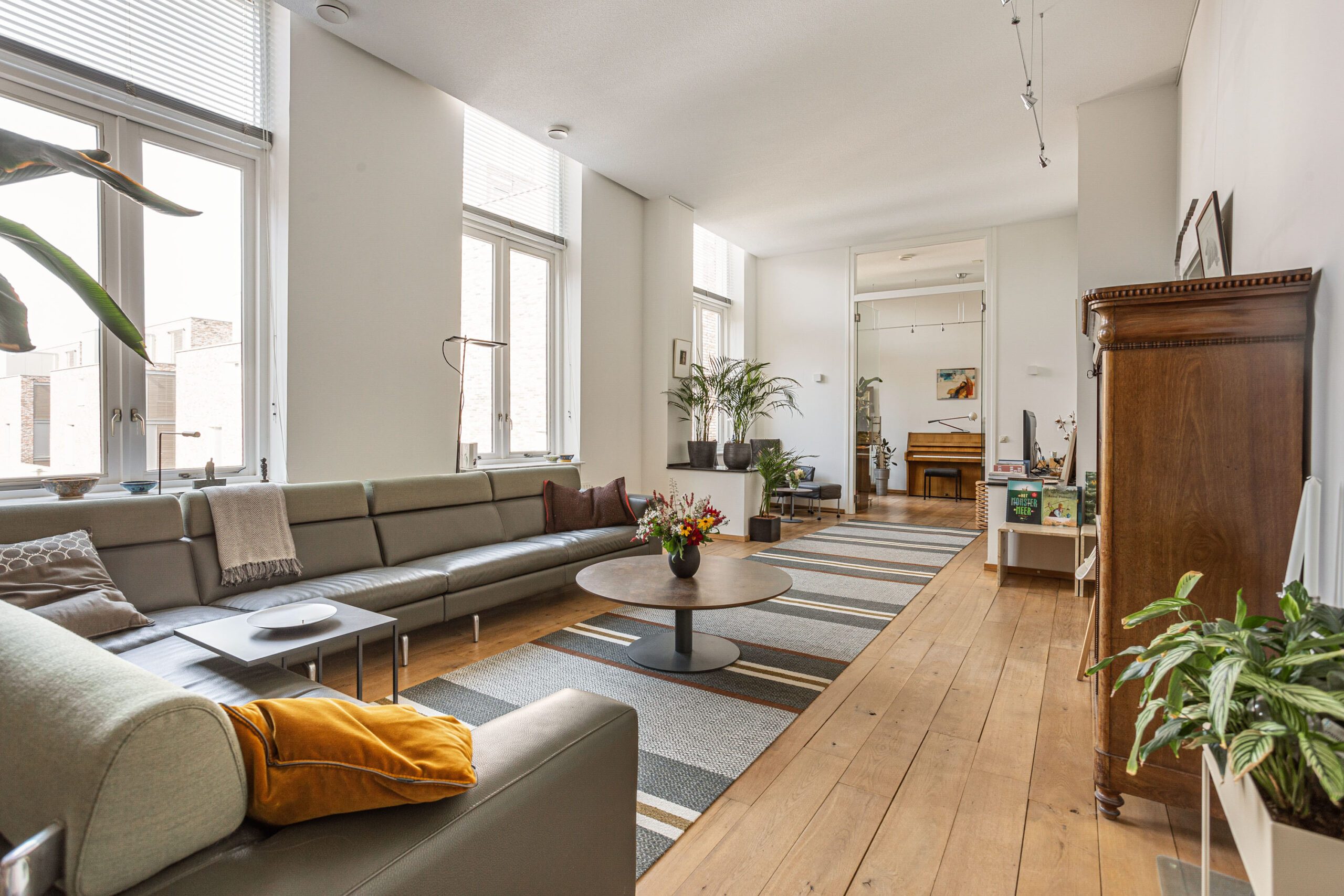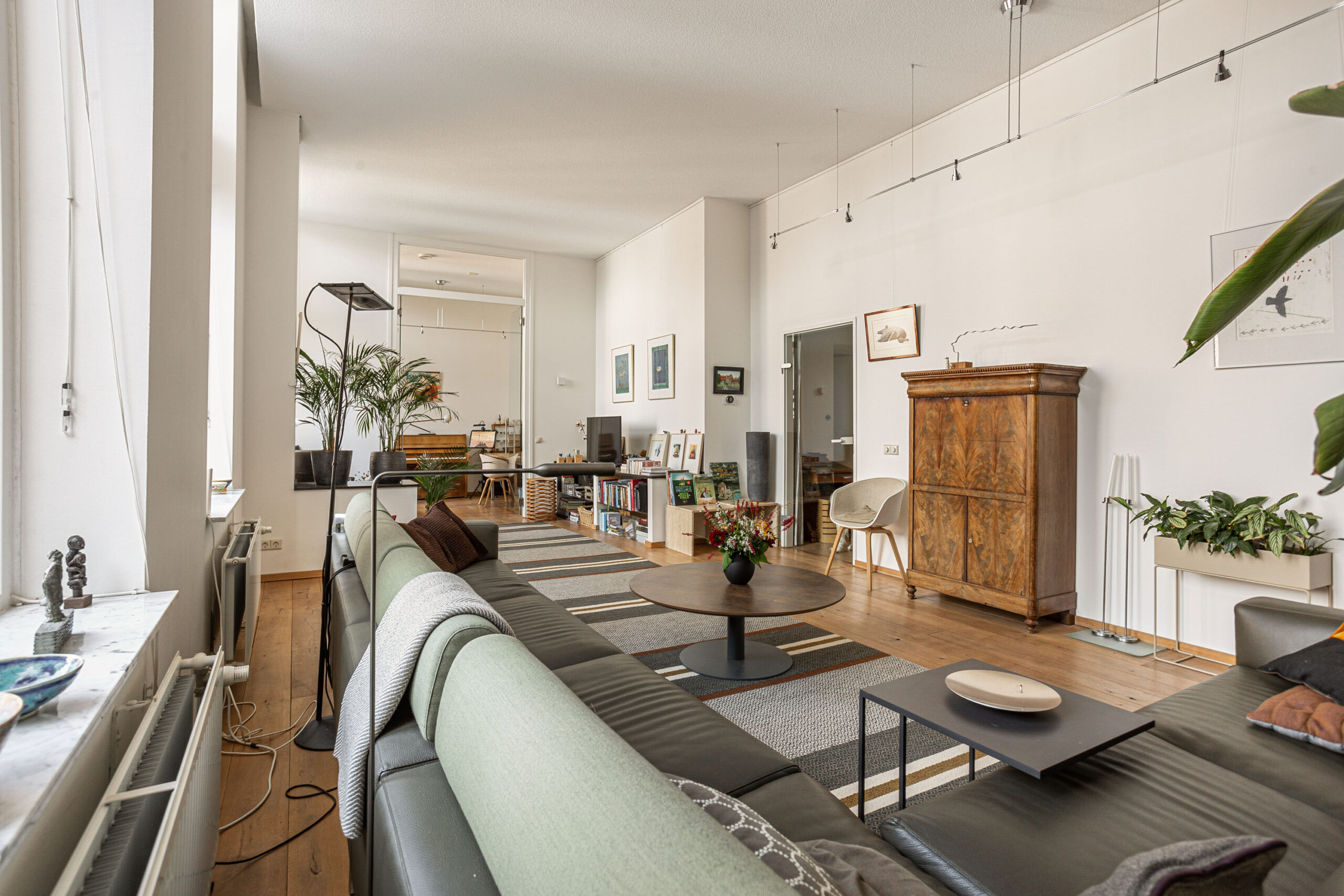 Door de hoge plafonds is deze woning niet alleen zeer licht, maar voelt het nog ruimer aan dan de 166 m2. De woonkamer beschikt over twee Franse balkons en heeft een mooi uitzicht.