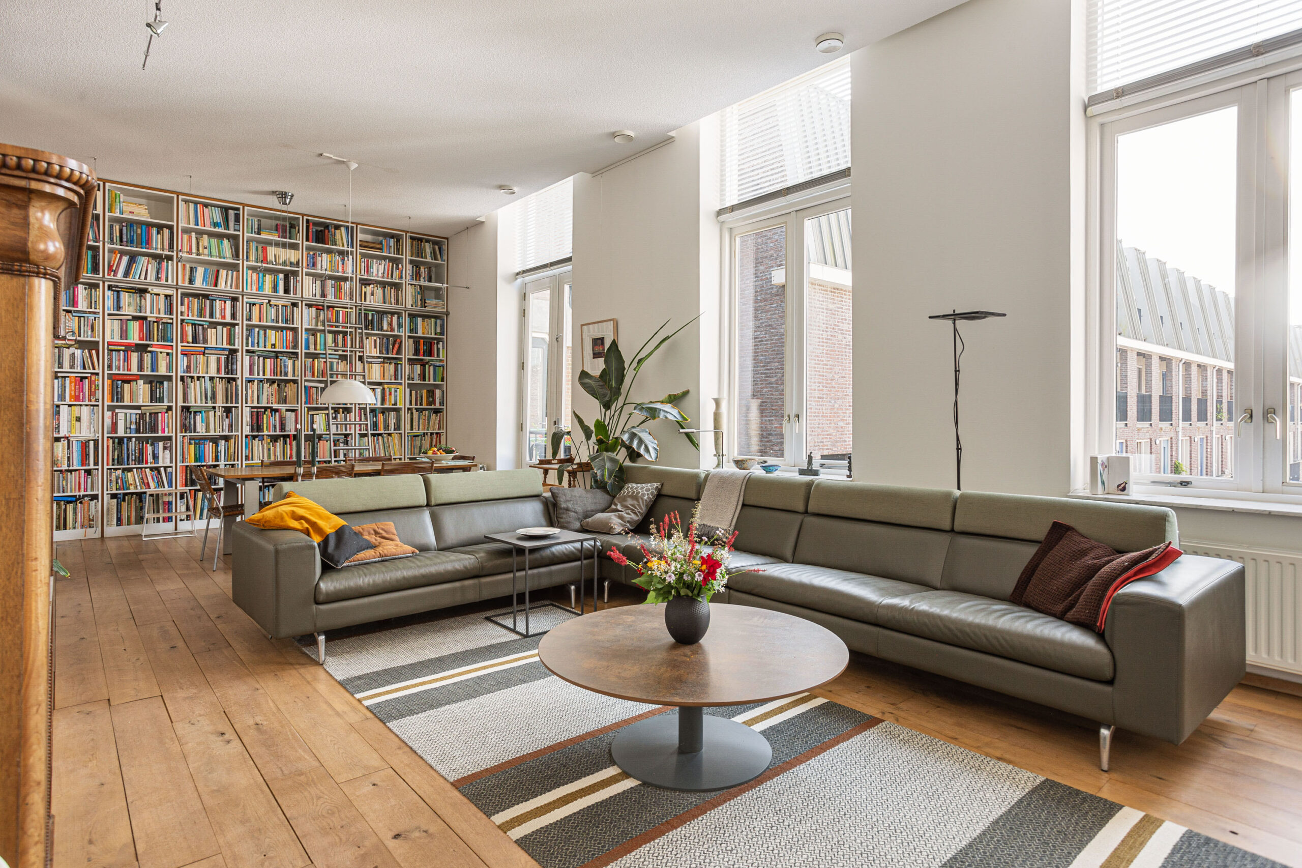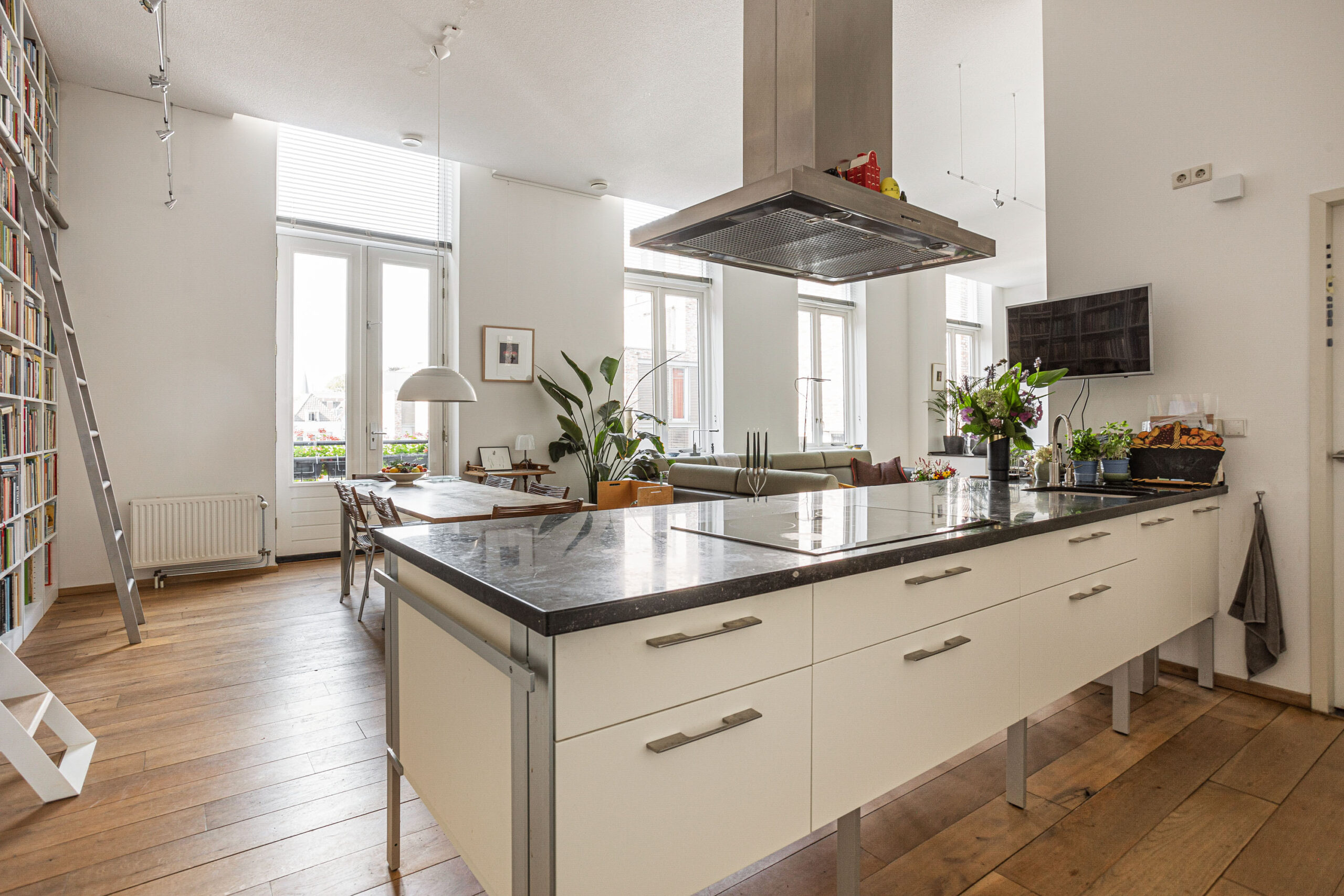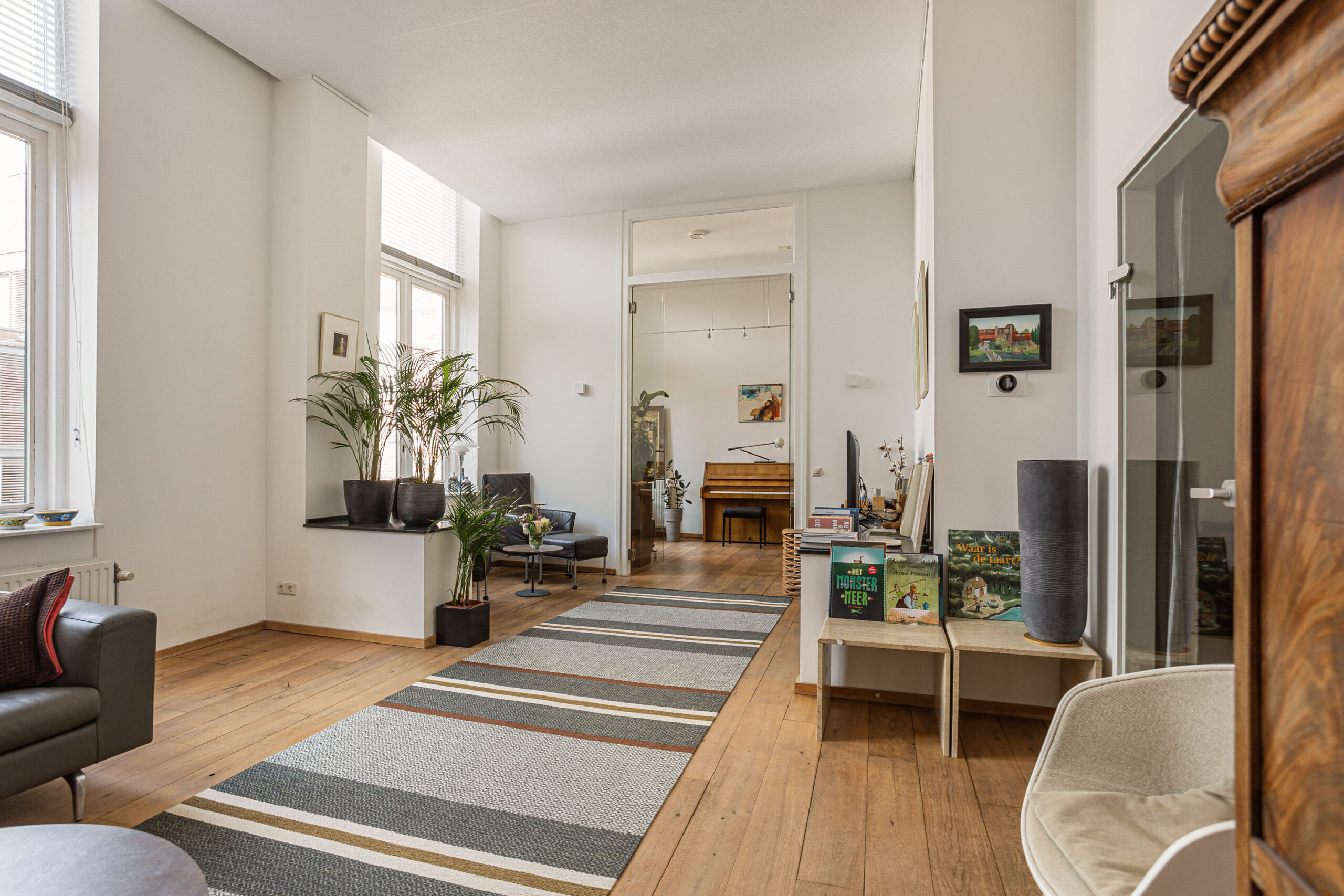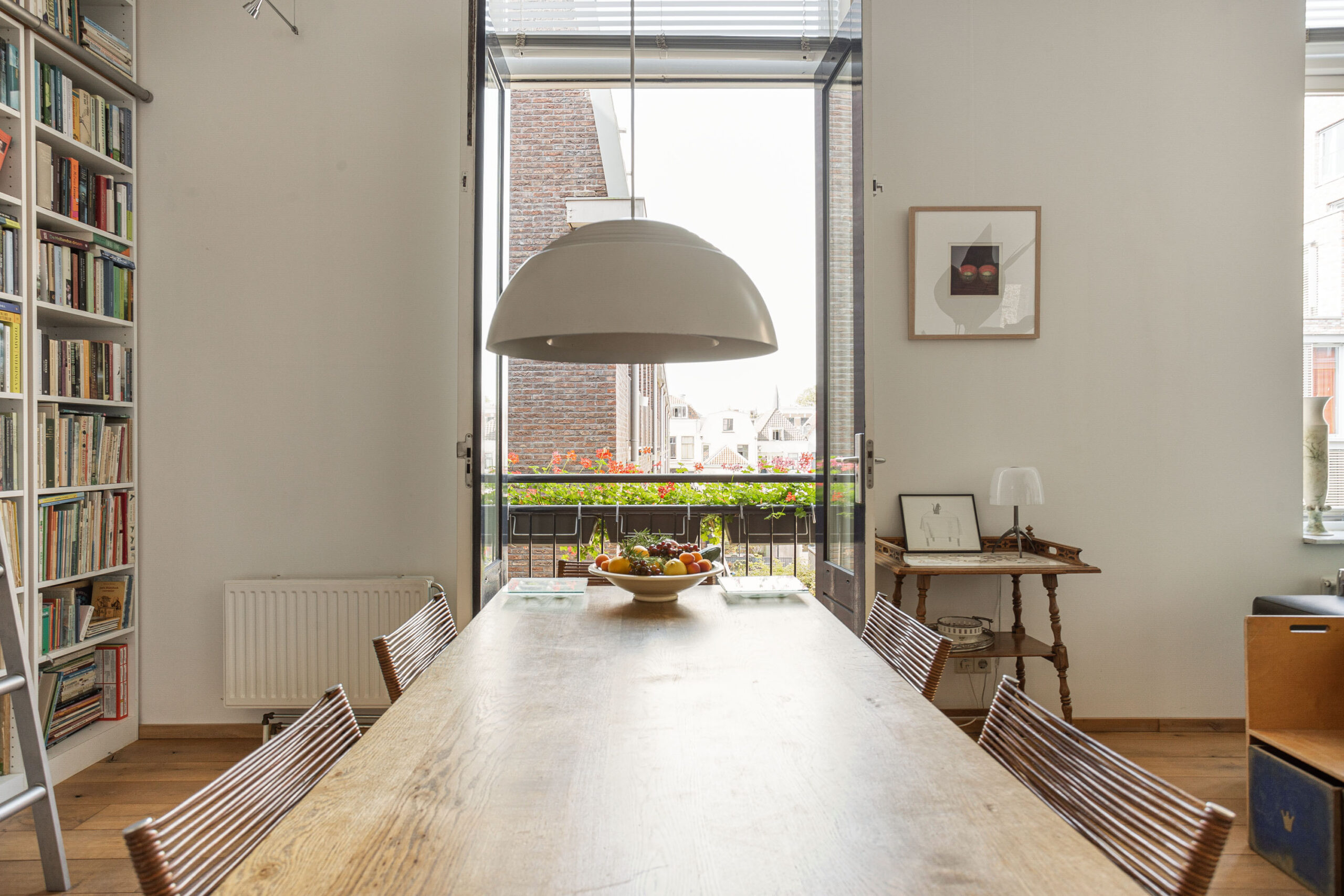 Door de hoge plafonds is deze woning niet alleen zeer licht, maar voelt het nog ruimer aan dan de 166 m2. De woonkamer beschikt over twee Franse balkons en heeft een mooi uitzicht.