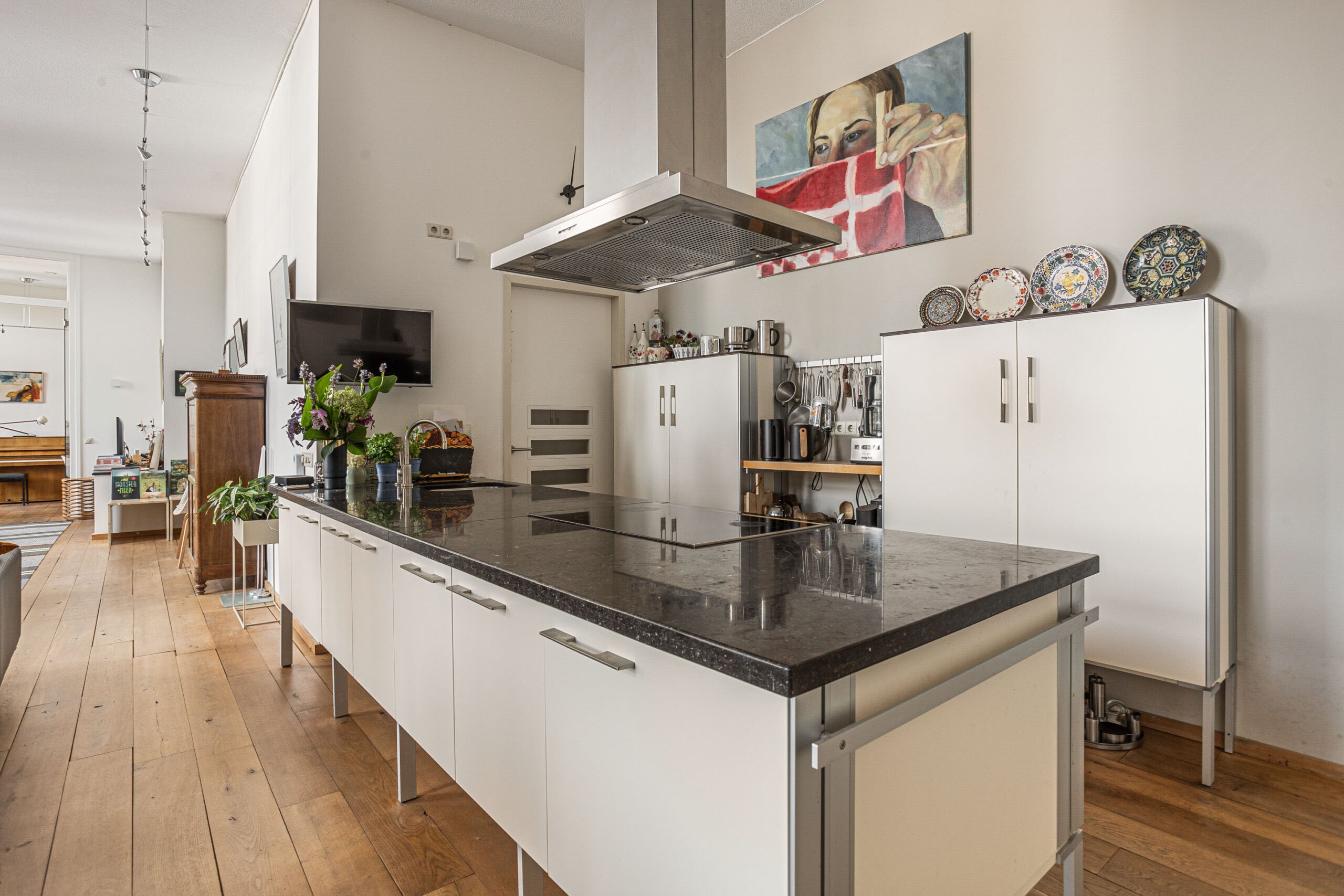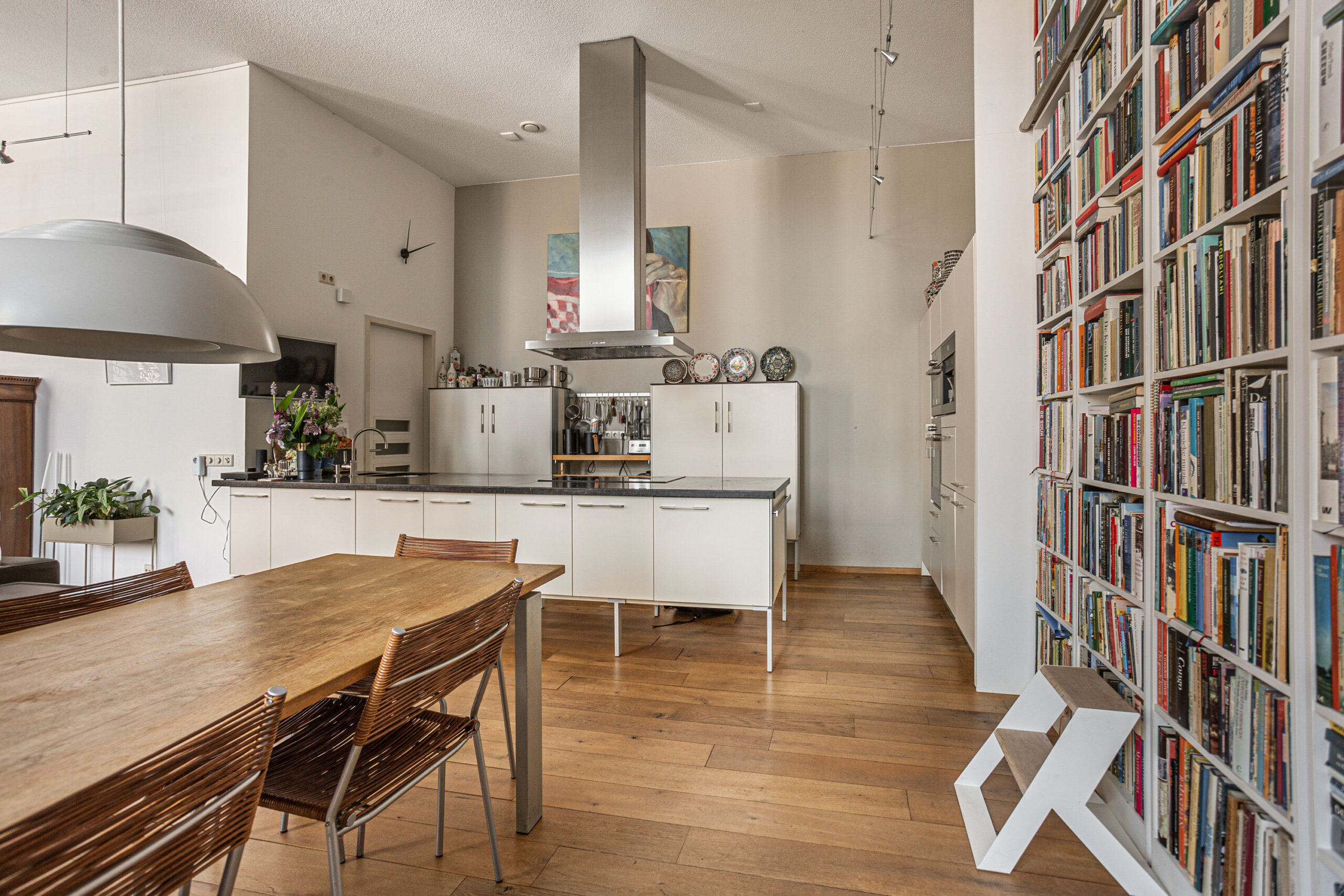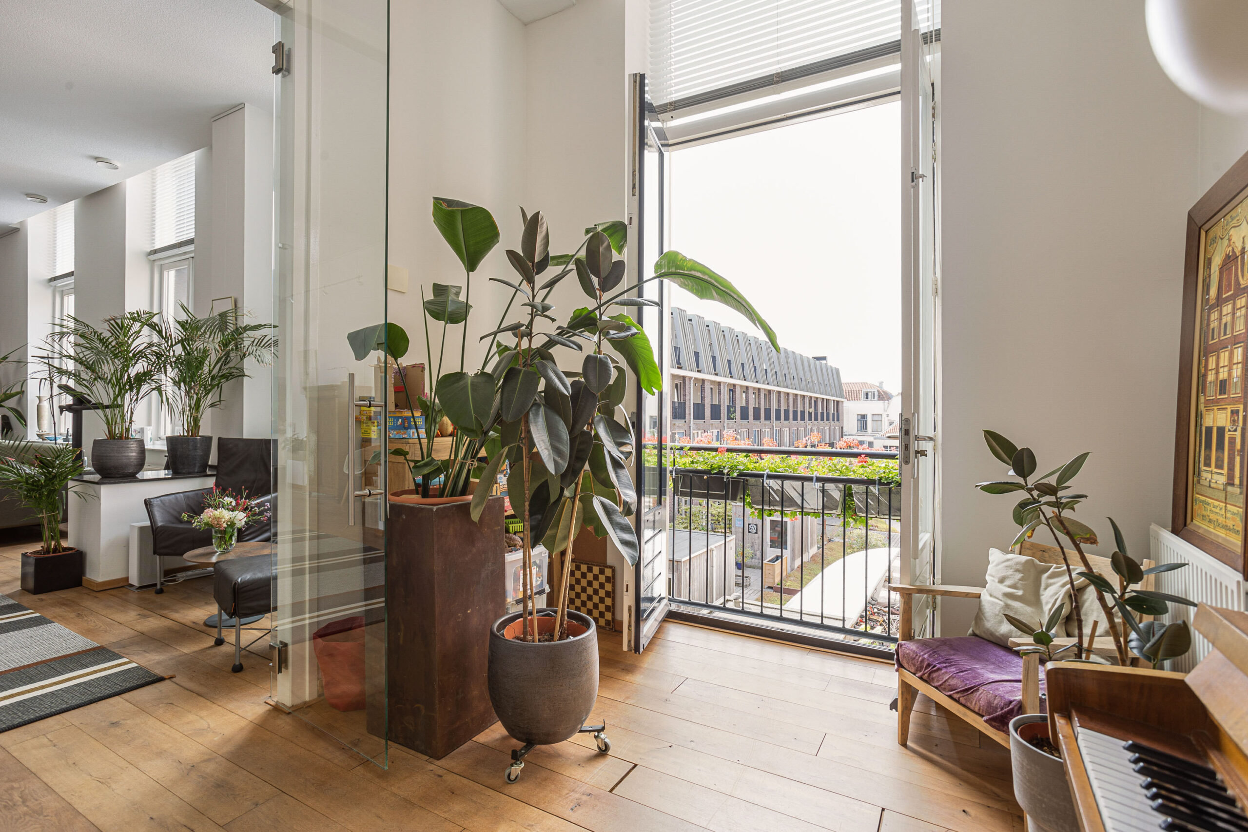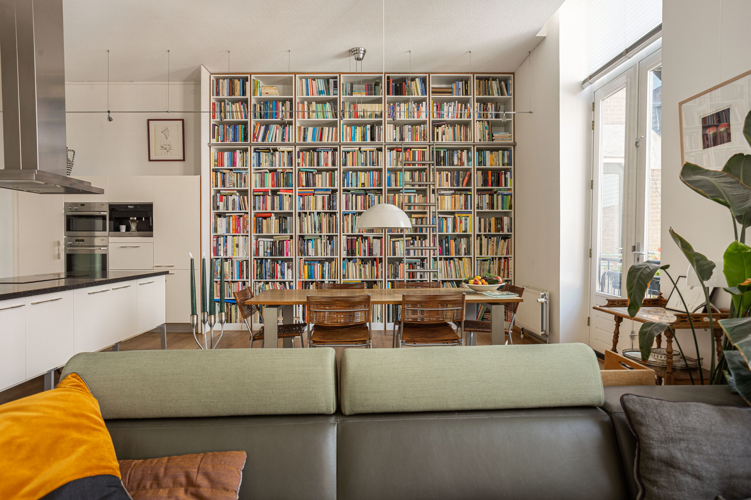Door de hoge plafonds is deze woning niet alleen zeer licht, maar voelt het nog ruimer aan dan de 166 m2. De woonkamer beschikt over twee Franse balkons en heeft een mooi uitzicht.