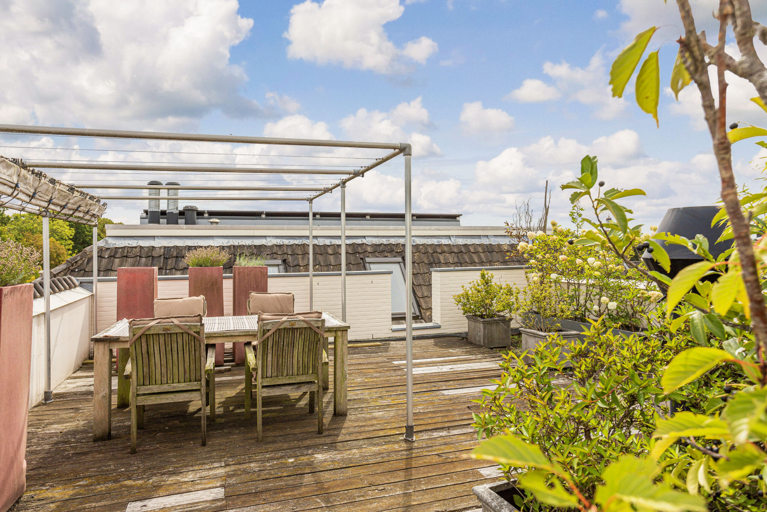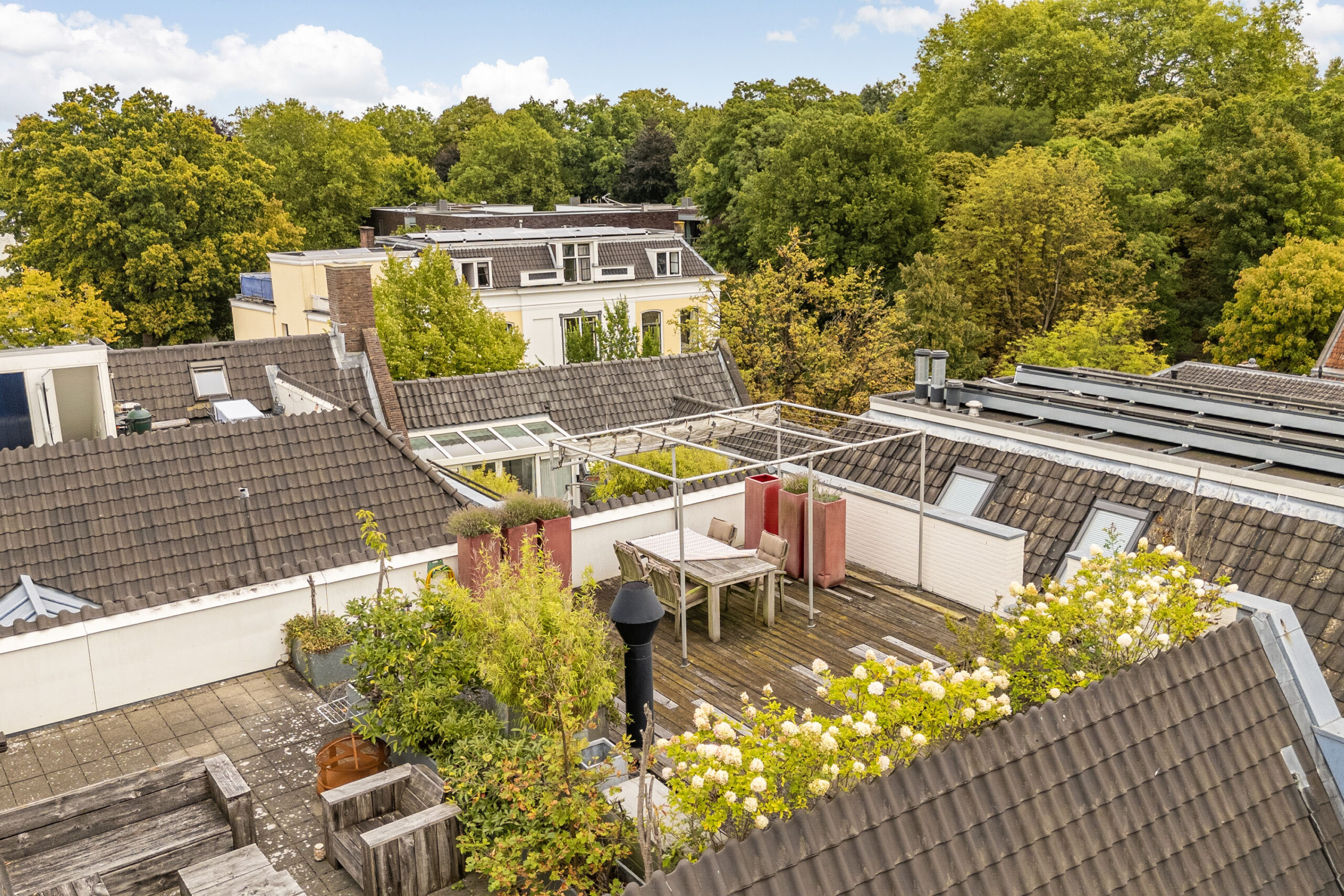 *Vanaf het dakterras is er een zeer fraai uitzicht over het oude centrum van Utrecht met zowel zicht op de Domtoren als de toren van de Geertekerk.