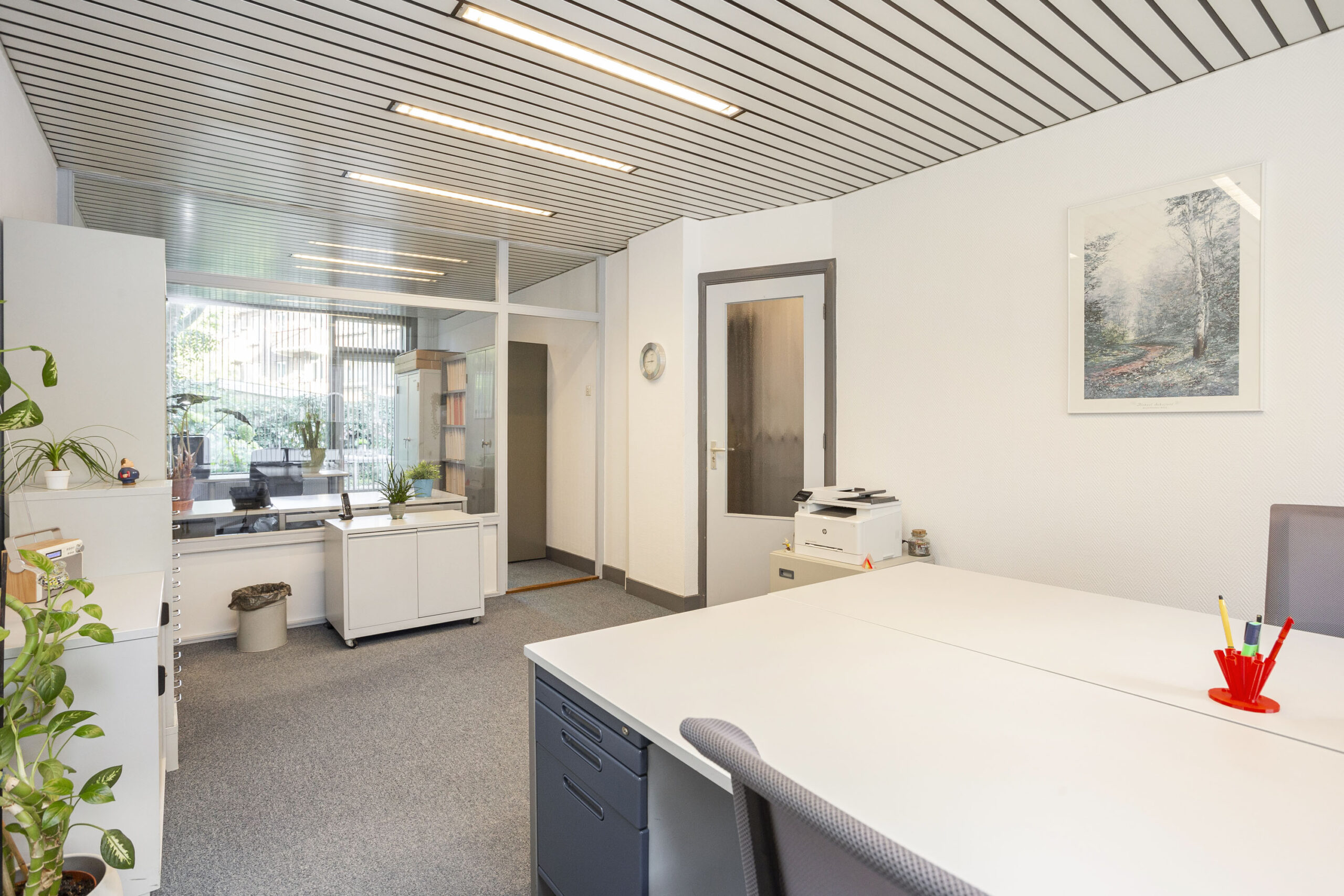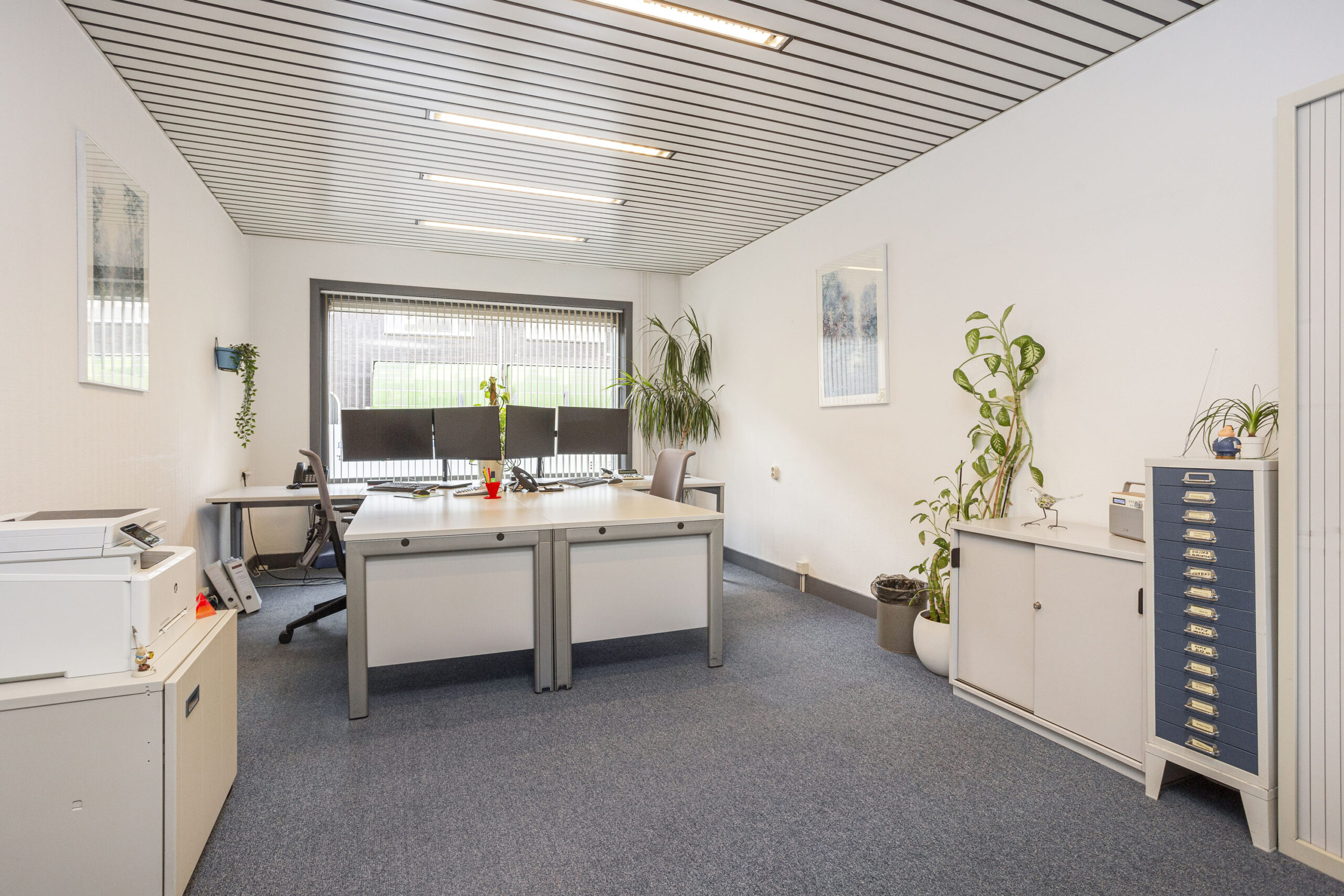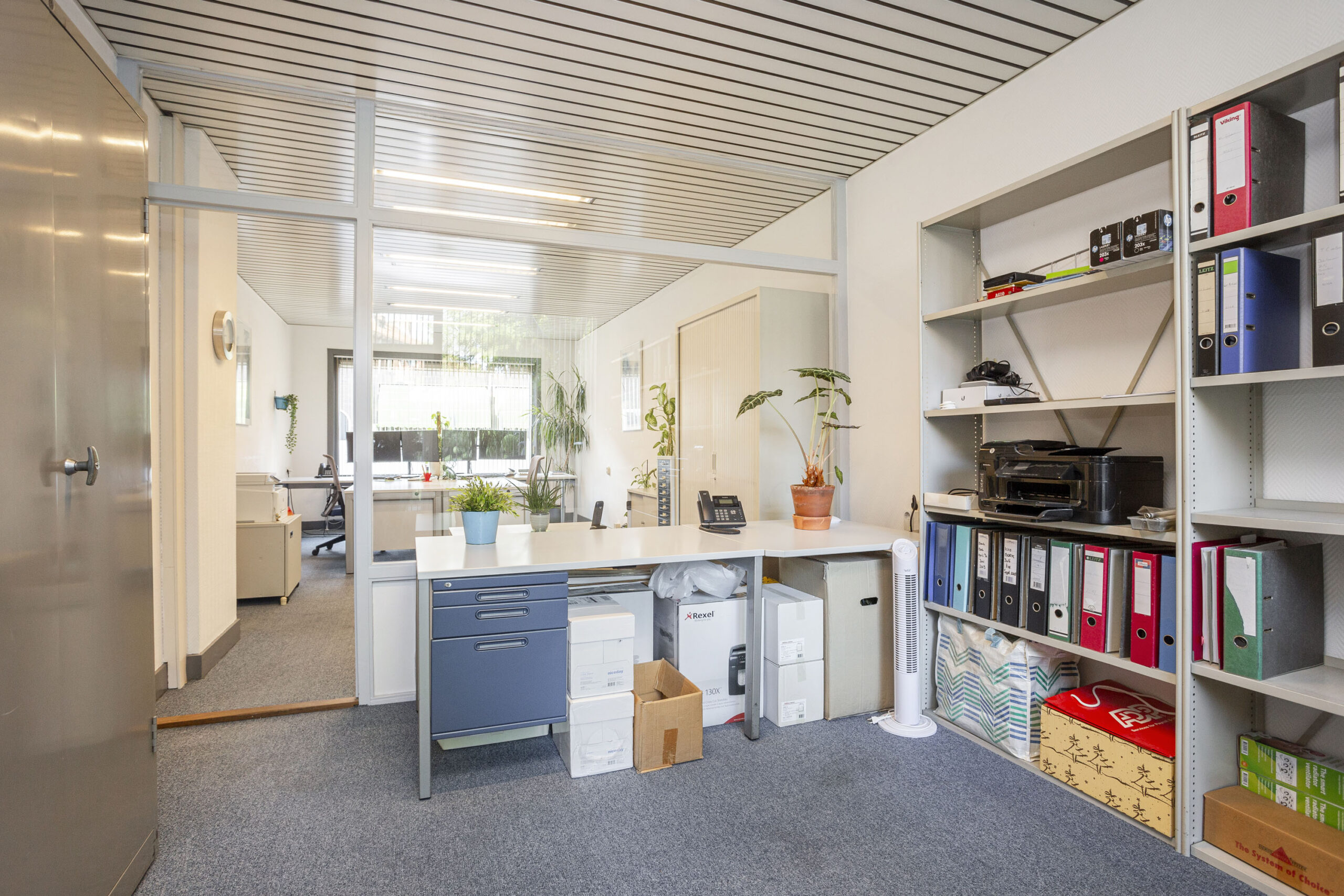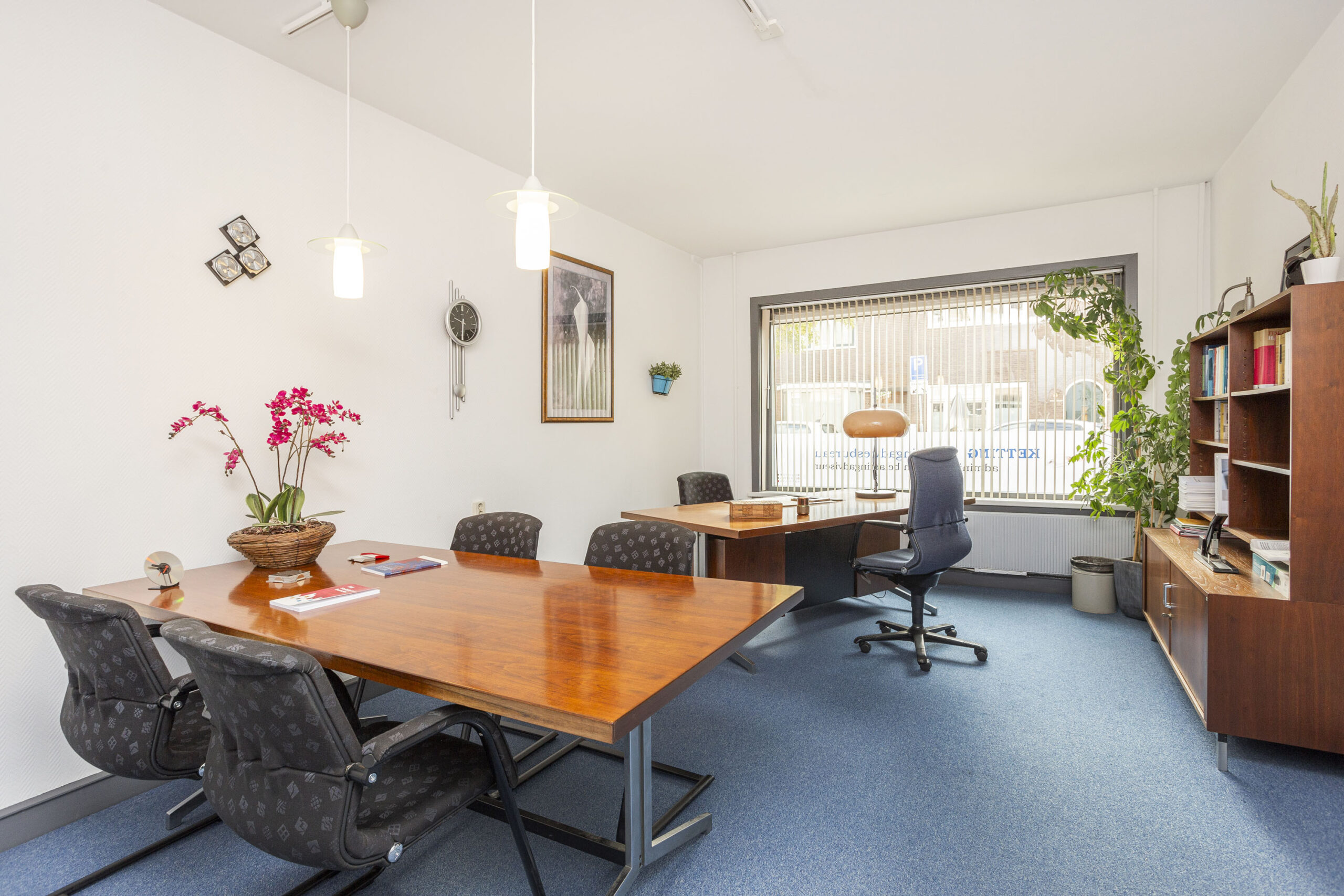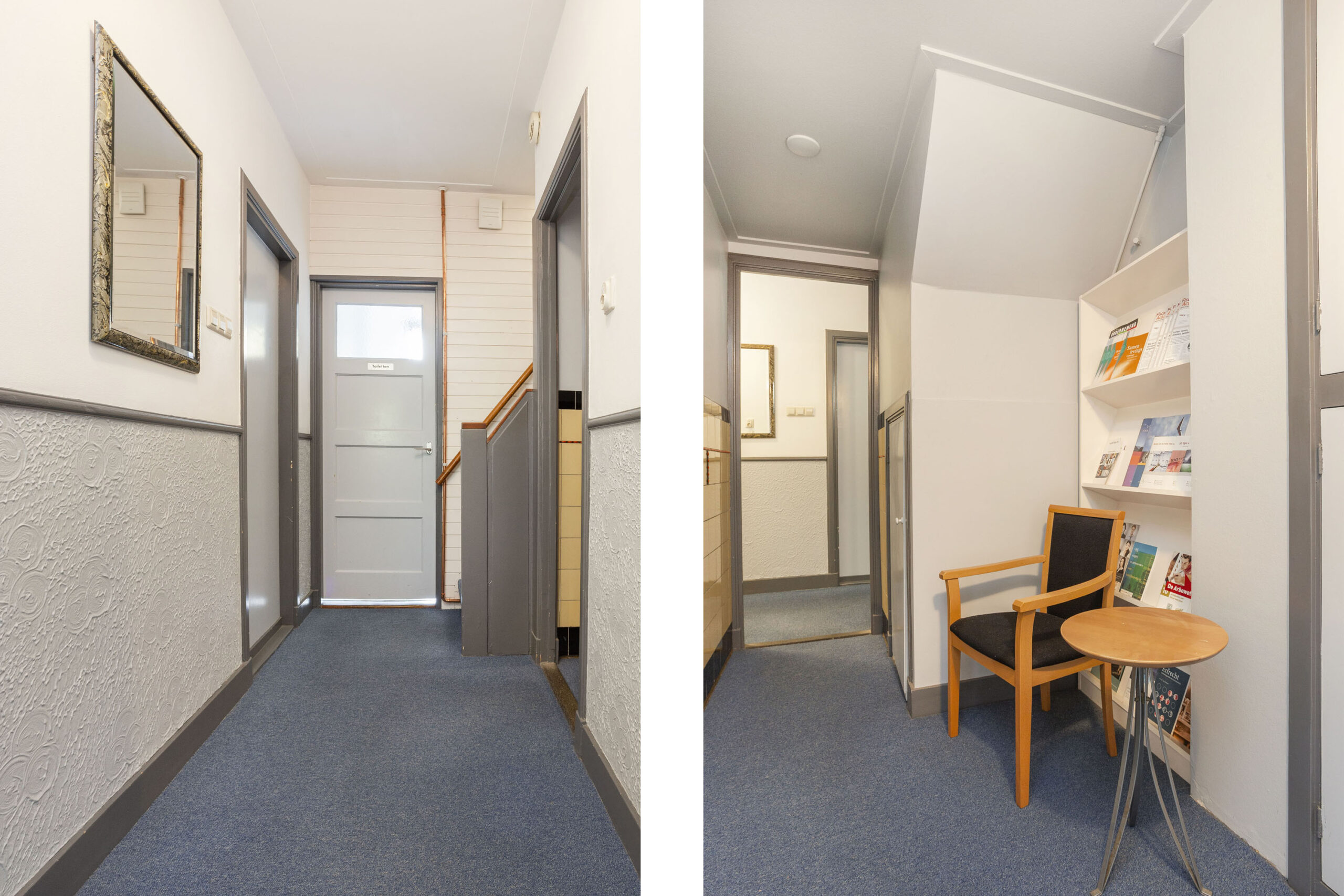 Begane grond: Entree, tochtportaal, gang, 2 toiletten, zijkamer, woonkamer (thans kantoor), eetkeuken, voorzijkamer / kantoor.